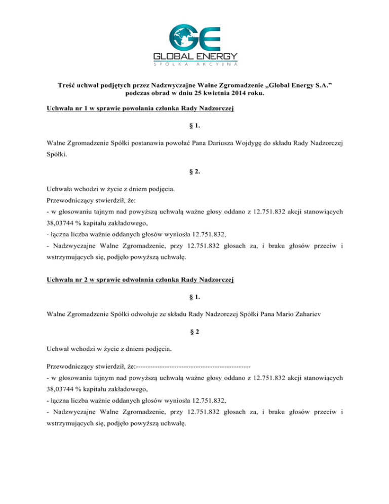 Treść uchwał podjętych przez Nadzwyczajne Walne Zgromadzenie „Global Energy S.A.” podczas obrad w dniu 25 kwietnia 2014 roku. Uchwała nr 1 w sprawie powołania członka Rady Nadzorczej § 1. Walne Zgromadzenie Spółki postanawia powołać Pana Dariusza Wojdygę do składu Rady Nadzorczej Spółki. § 2. Uchwała wchodzi w życie z dniem podjęcia. Przewodniczący stwierdził, że: - w głosowaniu tajnym nad powyższą uchwałą ważne głosy oddano z 12.751.832 akcji stanowiących 38,03744 % kapitału zakładowego, - łączna liczba ważnie oddanych głosów wyniosła 12.751.832, - Nadzwyczajne Walne Zgromadzenie, przy 12.751.832 głosach za, i braku głosów przeciw i wstrzymujących się, podjęło powyższą uchwałę. Uchwała nr 2 w sprawie odwołania członka Rady Nadzorczej § 1. Walne Zgromadzenie Spółki odwołuje ze składu Rady Nadzorczej Spółki Pana Mario Zahariev §2 Uchwał wchodzi w życie z dniem podjęcia. Przewodniczący stwierdził, że:------------------------------------------------ w głosowaniu tajnym nad powyższą uchwałą ważne głosy oddano z 12.751.832 akcji stanowiących 38,03744 % kapitału zakładowego, - łączna liczba ważnie oddanych głosów wyniosła 12.751.832, - Nadzwyczajne Walne Zgromadzenie, przy 12.751.832 głosach za, i braku głosów przeciw i wstrzymujących się, podjęło powyższą uchwałę. Uchwała nr 3 w sprawie odwołania członka Rady Nadzorczej § 1. Walne Zgromadzenie Spółki odwołuje ze składu Rady Nadzorczej Spółki Pana Davida Thomas §2 Uchwał wchodzi w życie z dniem podjęcia. Przewodniczący stwierdził, że: - w głosowaniu tajnym nad powyższą uchwałą ważne głosy oddano z 12.751.832 akcji stanowiących 38,03744 % kapitału zakładowego, - łączna liczba ważnie oddanych głosów wyniosła 12.751.832, - Nadzwyczajne Walne Zgromadzenie, przy 12.751.832 głosach za, i braku głosów przeciw i wstrzymujących się, podjęło powyższą uchwałę. W tym miejscu przystąpiono do punktu 11 (jedenastego) porządku obrad. Spółka zakończyła rok 2013 z zyskiem netto przekraczającym 13 milionów złotych. Był to wzrost w stosunku do roku ubiegłego na poziomie sięgającym kilkuset procent. Wartość księgowa na koniec roku przypadająca na jedną akcję również nie spadła poniżej wartości akcji na giełdzie na koniec 2012 roku. Wzrost kapitałów własnych oraz aktywów netto Spółki w stosunku do roku poprzedniego był ponad dwukrotny co jest wynikiem świadczącym o skokowym wzroście wartości Spółki. Tak przyrost kapitałów własnych Spółki w stosunku do wartości kapitałów własnych Emitenta na koniec 2012 roku przy jednoczesnym zmniejszeniu zobowiązań Spółki do poziomu praktycznie znikomego, gdyż w stosunku do aktywów netto wynosi mniej niż 0,01 % ich wartości, to osiągnięcie które pozwala na stwierdzenie, że Zarząd zrealizował zakładane cele. Dodatkowo na szczególne podkreślenie zasługuje fakt, że polityka finansowa Spółki była prowadzona w sposób gwarantujący brak możliwości utraty płynności finansowej, a tym bardziej zdolności do popadnięcia Spółki w kłopoty finansowe, gdyż Spółka zaciągała zobowiązania nieprzekraczające kilku procent kapitałów własnych. Pozostałe bardziej szczegółowe wyjaśnienia odnoszące się do stanu finansów Spółki w roku 2013 znajdują się w opublikowanych Sprawozdaniach oraz dokumentach stanowiących załączniki. W tym miejscu Akcjonariusze podsumowali, że w związku z powyższym działania Zarządu zasługują na pozytywną oceną i tym samym zawnioskowali o przedstawienie im nowej strategii działalności Spółki na rok 2014. Szczegółowy jej opis stanowić będzie załącznik do raportu bieżącego zawierającego treść podjętych uchwał w dniu dzisiejszym. Uchwała nr 4 w sprawie w sprawie zapoznania się z przedstawioną przez Zarząd na Walnym Zgromadzeniu strategią działalności Spółki na 2014 rok oraz poprzednimi i bieżącymi wynikami finansowymi Spółki. § 1. W związku z przedstawieniem przez Zarząd Spółki strategii działalności na rok 2014 oraz bieżących wyników finansowych Spółki, Walne Zgromadzenie Spółki poprzez niniejszą uchwałę stwierdza zapoznanie z przedmiotowym dokumentem oraz jego zatwierdzenie do realizacji, który stanowi załącznik nr 1 do niniejszej Uchwały. §2 Uchwał wchodzi w życie z dniem podjęcia. Przewodniczący stwierdził, że: - w głosowaniu jawnym nad powyższą uchwałą ważne głosy oddano z 12.751.832 akcji stanowiących 38,03744 % kapitału zakładowego, - łączna liczba ważnie oddanych głosów wyniosła 12.751.832, - Nadzwyczajne Walne Zgromadzenie, przy 12.751.832 głosach za, i braku głosów przeciw i wstrzymujących się, podjęło powyższą uchwałę. Ponadto jako podsumowanie niniejszego punktu porządku obrad odnoszącego się do spraw finansowych Spółki Zarząd zajął stanowisko w kwestii bieżącej sytuacji Spółki. W szczególności istotnym aspektem są dokonane na przestrzeni pierwszego kwartału 2014 roku transakcje nabycia oraz zbycia akcji spółek AGROTON PUBLIC, NEW VISION oraz GANT DEVELOPMENT. Pierwsze dwie można uznać za zakończone, gdyż Spółka zbyła oba aktywa z zyskiem co jest dodatkowym argumentem przemawiającym za podjęciem uchwały przyjmującej zaproponowaną przez Zarząd strategią na 2014 rok przewidująca w ogólnym zarysie wykorzystanie wszelkich dostępnych instrumentów rynku kapitałowego, gdzie działalność związana z odnawialnymi źródłami energii zostanie przesunięta do specjalnie oddelegowanych do tego celu podmiotów zarządzanych przez spółkę „córkę” kontrolowaną przez Global Energy S.A. a w portfelu Global Energy S.A. 90% działalności operacyjnej stanowić będą transakcje związane z instrumentami: rynku pieniężnego, dłużnego, CFD, derywatami, nabywaniem akcji spółek publicznych notowanych na giełdach krajowej i zagranicznych oraz inne instrumenty po