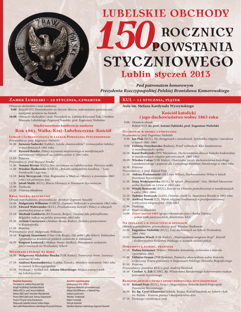 LUBELSKIE OBCHODY 150. ROCZNICY POWSTANIA STYCZNIOWEGO Lublin styczeń 2013 Pod patronatem honorowym Prezydenta Rzeczypospolitej Polskiej Bronisława Komorowskiego Zamek Lubelski – 10 stycznia, czwartek KUL – 11 stycznia, piątek Otwarcie obchodów i sesji naukowej 9.00 Kościół OO. Dominikanów na Starym Mieście, nabożeństwo patriotyczne, następnie przejście na Zamek. 10.00 Otwarcie obchodów i sesji: Prezydent m. Lublina Krzysztof Żuk, Dyrektor Muzeum Lubelskiego Zygmunt Nasalski, prof. Eugeniusz Niebelski. Aula im. Stefana Kardynała Wyszyńskiego Międzynarodowa konferencja naukowa Rok 1863. Walka–Kraj–Lubelszczyzna–Kościół Lublin i Lubelszczyzna w latach Powstania Styczniowego Przewodniczy: prof. Eugeniusz Niebelski 10.30 Ireneusz Sadurski (Lublin), Szkoła „buntowników”. Gimnazjaliści lubelscy w manifestacjach 1861 roku. 10.50 Ryszard Bender, Polacy wyznania mojżeszowego w manifestacjach patriotyczno-religijnych na Lubelszczyźnie w 1861 roku. 11.10 Przerwa Przewodniczy: prof. Ryszard Bender 11.30 Tomasz Brytan (KUL), Noc styczniowa na Lubelszczyźnie. Pierwsze walki 11.50 Wiesław Śladkowski (UMCS), „Rękami zdobędziemy karabiny...” Leon Frankowski i jego boje. 12.10 Jerzy Skrzypczak (Muz. Regionalne w Mielcu), Oborscy w powstaniu 1863 roku i ich późniejsze losy. 12.30 Jakub Malik (KUL), Bracia Głowaccy w Powstaniu Styczniowym. 12.50 Dyskusja 13.20 Przerwa obiadowa Kraj, walka, reperkusje Obrady popołudniowe, przewodniczy: dyrektor Zygmunt Nasalski 14.30 Małgorzata Willaume (UMCS), Zygmunt Miłkowski w powstaniu 1863 roku 14.50 Edward Walewander (KUL), Prześladowany Kościół i Polacy w relacjach austriackiej prasy w 1863. 15.10 Idesbald Goddeeris (KULeuven, Belgia), Ostatnia fala polonofilizmu. Belgijskie reakcje na polskie powstanie 1863 roku 15.30 Artiom Czernyszew (Abakan–Rosja–Kielce), Zesłańcy postyczniowi w Krasnojarsku 15.50 Przerwa Przewodniczy: prof. Małgorzata Willaume 16.10 Ewgienij Siemionow (Ułan-Ude Rosja), Dla siebie i dla Syberii. Kulturalna i gospodarcza działalność polskich zesłańców w Zabajkalu 16.30 Sergiusz Leończyk (Abakan–Rosja–Siedlce), Potomkowie zesłańców postyczniowych we Wschodniej Syberii Weterani i pamięć 63 roku 16.50 Małgorzata Michalska-Bracha (UJK Kielce), Towarzysze broni. Lwowscy weterani 63 roku 17.10 Andrzej Konstankiewicz (Lublin, Zamek), Mundury weteranów 1863 roku w czasach II Rzeczypospolitej 17.30 Dyskusja + wykład red. Adama Sikorskiego: Miejsca pamięci walk na Lubelszczyźnie Komitet honorowy: Prezydent m. Lublina Krzysztof Żuk Ksiądz Arcybiskup Stanisław Budzik Rektor KUL ks. prof. Antoni Dębiński Rektor UMCS prof. Stanisław Michałowski Prezes PAN/Lublin prof. Tomasz Trojanowski Prezes LTN prof. Artur Korobowicz Wojewoda Lubelski Jolanta Szołno-Koguc Marszałek Województwa Lubelskiego Krzysztof Hetman Komitet organizacyjny: profesorowie KUL i UMCS: Eugeniusz Niebelski (przewodniczący) Małgorzata Willaume, o. Roland Prejs, Hubert Łaszkiewicz Wiesław Śladkowski Robert Litwiński Henryk Gmiterek Dyrektor Muzeum Lubelskiego Zygmunt Nasalski Kościół katolicki i jego duchowieństwo wobec 1863 roku 9.00. Otwarcie obrad: Rektor KUL ks. prof. Antoni Dębiński, prof. Eugeniusz Niebelski Duchowni w spisku i powstaniu Przewodniczy: prof. Eugeniusz Niebelski 9.30 Jan Ptak (KUL), Na chorągwiach i sztandarach. Symbolika religijna i narodowa w latach 1861-1863 9.50 Elżbieta Orzechowska (Radom), Przed wybuchem. Kler Sandomierza w manifestacjach i spisku 10.10 Karol Budzyński (IPN Warszawa), Duchowieństwo diecezji kielecko-krakowskiej w manifestacjach religijno-patriotycznych. 1861-1862 10.30 Wiesław Caban (UJK Kielce), Diecezjalne zjazdy duchowieństwa kieleckiego i sandomierskiego i poparcie dla Centralnego Komitetu Narodowego w 1862 roku 10.50 Przerwa Przewodniczy: o. prof. Roland Prejs 11.10 Aldona Prašmantaitė (IH Litwy Wilno), Duchowieństwo Wilna w latach Powstania Styczniowego 11.30 Irena Wodzianowska (KUL), W rękach „Wieszatiela”. Gen. Michaił Murawiow wobec Kościoła na Litwie w 1863 roku 11.50 Witalij Rossowski (KUL), Kościół na Ukrainie prawobrzeżnej w manifestacjach i walce. 1861-1864. 12.10 Tadeusz Krawczak (AAN), Ostatnie chwile ks. Stanisława Brzóski w 1865 roku. 12.30 Andrzej Nowak (UJ), Wątek religijnej konfrontacji w przedpowstaniowej publicystyce emigracyjnej. 1856-1863 12.50 Dyskusja 13.15 Przerwa obiadowa 14.00 Żuawi śmierci 1863 (grupa rekonstrukcyjna z Buska Zdroju) – pokaz walk partyzanckich, dziedziniec KUL Na zesłaniu i w policyjnych opiniach Obrady popołudniowe, przewodniczy: prof. Wiesław Śladkowski 14.30 Eugeniusz Niebelski (KUL), Losy duchownych na Syberii Wschodniej 1861-1901 14.50 Stanisław Wiech (UJK Kielce), „Nieprzejednani wrogowie Rosji”. Kościół i duchowieństwo Królestwa Polskiego w ocenach carskiej policji. Dokumenty, pamięć, tradycja 15.10 Halina Szymanel (Wilno), Wileńskie dokumenty archiwalne o Kościele i powstaniu 1863 15.30 Elżbieta Orman (PSB Kraków), Pomiędzy obowiązkiem wobec Kościoła a Ojczyzny. Księża powstańcy w biogramach Polskiego Słownika Biograficznego. 15.50 Przerwa Przewodniczy: prorektor KUL o. prof. Andrzej Derdziuk 16.10 Czesław A. Żak (CAW), Bp. Władysława Bandurskiego kultywowanie tradycji powstania styczniowego Błogosławieni i święci epoki powstania styczniowego 16.30 Roland Prejs (KUL), Święci i błogosławieni Kościoła katolickiego epoki Powstania Styczniowego 16.50 Ks. bp. Cyryl Klimowicz (Irkuck, Rosja), Kościół katolicki na Syberii i kult św. Rafała – historia, pamięć i duszpasterstwo dziś. 17.10 Dyskusja i zamknięcie sesji