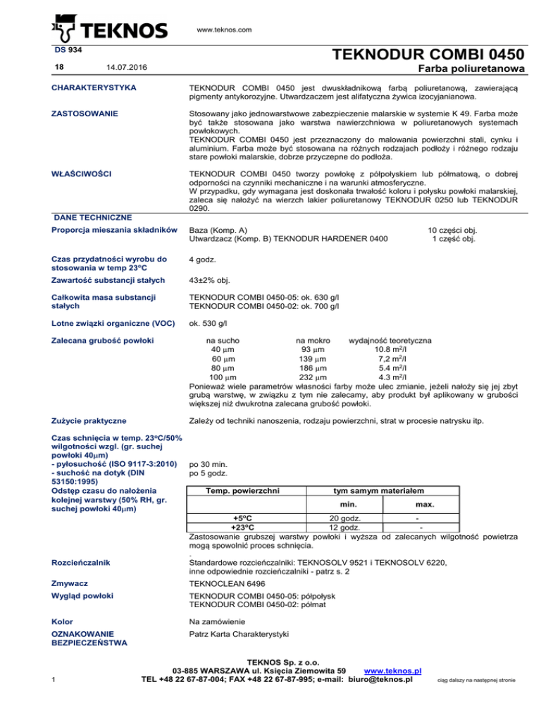 www.teknos.com DS 934 18 TEKNODUR COMBI 0450 14.07.2016 Farba poliuretanowa CHARAKTERYSTYKA TEKNODUR COMBI 0450 jest dwuskładnikową farbą poliuretanową, zawierającą pigmenty antykorozyjne. Utwardzaczem jest alifatyczna żywica izocyjanianowa. ZASTOSOWANIE Stosowany jako jednowarstwowe zabezpieczenie malarskie w systemie K 49. Farba może być także stosowana jako warstwa nawierzchniowa w poliuretanowych systemach powłokowych. TEKNODUR COMBI 0450 jest przeznaczony do malowania powierzchni stali, cynku i aluminium. Farba może być stosowana na różnych rodzajach podłoży i różnego rodzaju stare powłoki malarskie, dobrze przyczepne do podłoża. WŁAŚCIWOŚCI TEKNODUR COMBI 0450 tworzy powłokę z półpołyskiem lub półmatową, o dobrej odporności na czynniki mechaniczne i na warunki atmosferyczne. W przypadku, gdy wymagana jest doskonała trwałość koloru i połysku powłoki malarskiej, zaleca się nałożyć na wierzch lakier poliuretanowy TEKNODUR 0250 lub TEKNODUR 0290. DANE TECHNICZNE Proporcja mieszania składników Baza (Komp. A) Utwardzacz (Komp. B) TEKNODUR HARDENER 0400 Czas przydatności wyrobu do stosowania w temp 23oC 4 godz. Zawartość substancji stałych 43±2% obj. Całkowita masa substancji stałych TEKNODUR COMBI 0450-05: ok. 630 g/l TEKNODUR COMBI 0450-02: ok. 700 g/l Lotne związki organiczne (VOC) ok. 530 g/l Zalecana grubość powłoki na sucho na mokro wydajność teoretyczna 40 µm 93 µm 10.8 m2/l 60 µm 139 µm 7,2 m2/l 80 µm 186 µm 5.4 m2/l 100 µm 232 µm 4.3 m2/l Ponieważ wiele parametrów własności farby może ulec zmianie, jeżeli nałoży się jej zbyt grubą warstwę, w związku z tym nie zalecamy, aby produkt był aplikowany w grubości większej niż dwukrotna zalecana grubość powłoki. Zużycie praktyczne Zależy od techniki nanoszenia, rodzaju powierzchni, strat w procesie natrysku itp. 10 części obj. 1 część obj. Czas schnięcia w temp. 23oC/50% wilgotności wzgl. (gr. suchej powłoki 40µm) - pyłosuchość (ISO 9117-3:2010) po 30 min. - suchość na dotyk (DIN po 5 godz. 53150:1995) Odstęp czasu do nałożenia Temp. powierzchni tym samym materiałem kolejnej warstwy (50% RH, gr. min. max. suchej powłoki 40µm) o +5 C 20 godz. +23oC 12 godz. Zastosowanie grubszej warstwy powłoki i wyższa od zalecanych wilgotność powietrza mogą spowolnić proces schnięcia. . Rozcieńczalnik Standardowe rozcieńczalniki: TEKNOSOLV 9521 i TEKNOSOLV 6220, inne odpowiednie rozcieńczalniki - patrz s. 2 Zmywacz TEKNOCLEAN 6496 Wygląd powłoki TEKNODUR COMBI 0450-05: półpołysk TEKNODUR COMBI 0450-02: półmat Kolor Na zamówienie OZNAKOWANIE BEZPIECZEŃSTWA Patrz Karta Charakterystyki 1 TEKNOS Sp. z o.o. www.teknos.pl 03-885 WARSZAWA ul. Księcia Ziemowita 59 TEL +48 22 67-87-004; FAX +48 22 67-87-995; e-mail: [email protected] ciąg dalszy na następnej stronie TEKNODUR COMBI 0450 SPOSÓB STOSOWANIA Przygotowanie podłoża DS 934-18 strona 2 Usunąć z podłoża wszelkie zanieczyszczenia, które mogą niekorzystnie wpływać na proces przygotowania podłoża i malowania. Usunąć również rozpuszczalne w wodzie sole stosując odpowiednie metody. Powierzchnię należy oczyścić zależnie od rodzaju podłoża, jak niżej: Stal: Zgorzelinę i rdzę usunąć przy pomocy obróbki strumieniowo ściernej do uzyskania stopnia czystości Sa 21/2 (ISO 8501-1). Zszorstkowanie powierzchni cienkiej blachy poprawia adhezję do podłoża. Cynk: Konstrukcje stalowe pokryte ogniowo powłoką cynkową, które są eksploatowane w warunkach atmosferycznych można malować po omieceniu ścierniwem do uzyskania matowej powierzchni (SaS). Odpowiednie środki czyszczące to np.: tlenek glinu, naturalny piasek i kwarc. Nie zaleca się malowania konstrukcji ze stali ocynkowanej przeznaczonej do eksploatacji w zanurzeniu. (ISO 12944-5). W przypadku stosowania konstrukcji stalowych pokrytych ogniowo powłoką cynkową w zanurzeniu, należy wcześniej skonsultować się z przedstawicielem firmy TEKNOS. Zaleca się nowe blachy ze stali ocynkowanej poddać omieceniu ścierniwem (SaS). Matowe, wysezonowane pod działaniem czynników atmosferycznych powierzchnie cynku można oczyścić środkiem czyszczącym do powierzchni ocynkowanych RENSA STEEL. Aluminium: Powierzchnię oczyścić środkiem czyszczącym do powierzchni ocynkowanych RENSA STEEL. Powierzchnie, które będą eksploatowane w warunkach atmosferycznych, podobnie jak podłoża cynkowe, należy także zszorstkować przez lekkie omiecenie ścierniwem lub piaskowanie (AlSaS). Powierzchnie malowane: Wszelkie zanieczyszczenia, które mogą niekorzystnie wpływać na nakładanie farby (np. tłuszcze i sole), usunąć. Powierzchnia musi być czysta i sucha. Stare, pomalowane powierzchnie, które przekroczyły maksymalny odstęp czasu do nałożenia kolejnej warstwy należy zszorstkować. Uszkodzone fragmenty pomalowanej powierzchni należy przygotować do ponownego malowania zgodnie z wymaganiami stawianymi przez rodzaj podłoża i sposób renowacji. Czas i miejsce przygotowywania powinny być dobrane tak, ażeby powierzchnia przed malowaniem nie była brudna i wilgotna. Przygotowanie wyrobu Przygotować tylko taką ilość farby, którą zużyje się w czasie krótszym niż czas przydatności do stosowania. Bezpośrednio przed malowaniem zmieszać składnik bazowy z utwardzaczem w prawidłowej proporcji. Niedokładne wymieszanie lub nieprawidłowy stosunek składników są przyczyną nieprawidłowego utwardzania i pogorszenia się własności powłoki. Warunki podczas nakładania Powierzchnia do malowania musi być sucha. Temperatura otaczającego powietrza, malowanej powierzchni i farby powinna być wyższa niż +5oC, a wilgotność względna powietrza poniżej 80% zarówno podczas nakładania jak i w okresie schnięcia wyrobu. Dodatkowo, temperatura malowanej powierzchni oraz farby musi być wyższa niż +3oC powyżej punktu rosy otaczającego powietrza. Nakładanie Farbę przed użyciem dokładnie wym