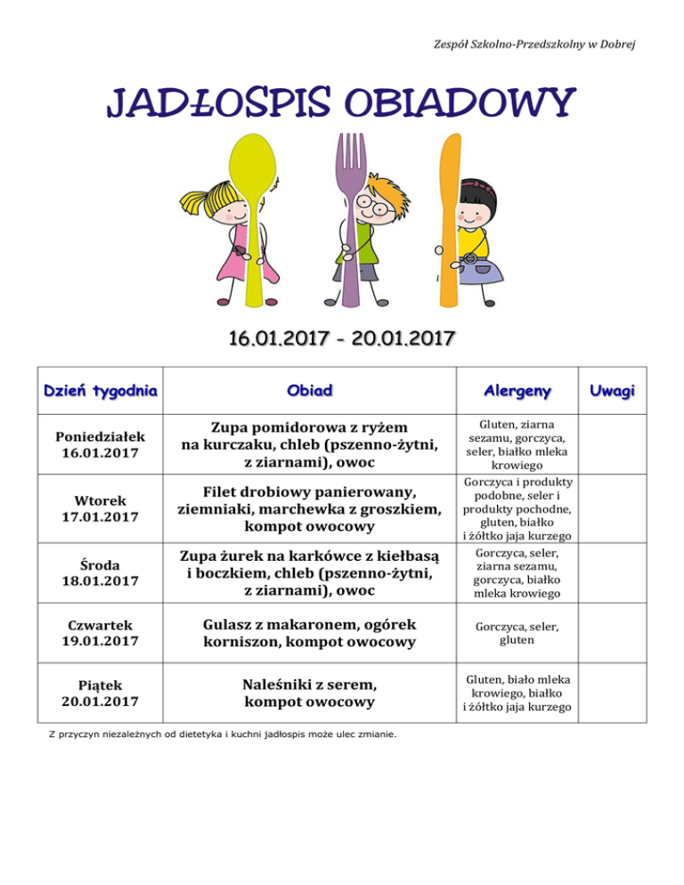 Zespół Szkolno-Przedszkolny w Dobrej 16.01.2017 - 20.01.2017 Dzień tygodnia Obiad Alergeny Poniedziałek 16.01.2017 Zupa pomidorowa z ryżem na kurczaku, chleb (pszenno-żytni, z ziarnami), owoc Wtorek 17.01.2017 Filet drobiowy panierowany, ziemniaki, marchewka z groszkiem, kompot owocowy Środa 18.01.2017 Zupa żurek na karkówce z kiełbasą i boczkiem, chleb (pszenno-żytni, z ziarnami), owoc Gluten, ziarna sezamu, gorczyca, seler, białko mleka krowiego Gorczyca i produkty podobne, seler i produkty pochodne, gluten, białko i żółtko jaja kurzego Gorczyca, seler, ziarna sezamu, gorczyca, białko mleka krowiego Czwartek 19.01.2017 Gulasz z makaronem, ogórek korniszon, kompot owocowy Gorczyca, seler, gluten Piątek 20.01.2017 Naleśniki z serem, kompot owocowy Gluten, biało mleka krowiego, białko i żółtko jaja kurzego Z przyczyn niezależnych od dietetyka i kuchni jadłospis może ulec zmianie. Uwagi