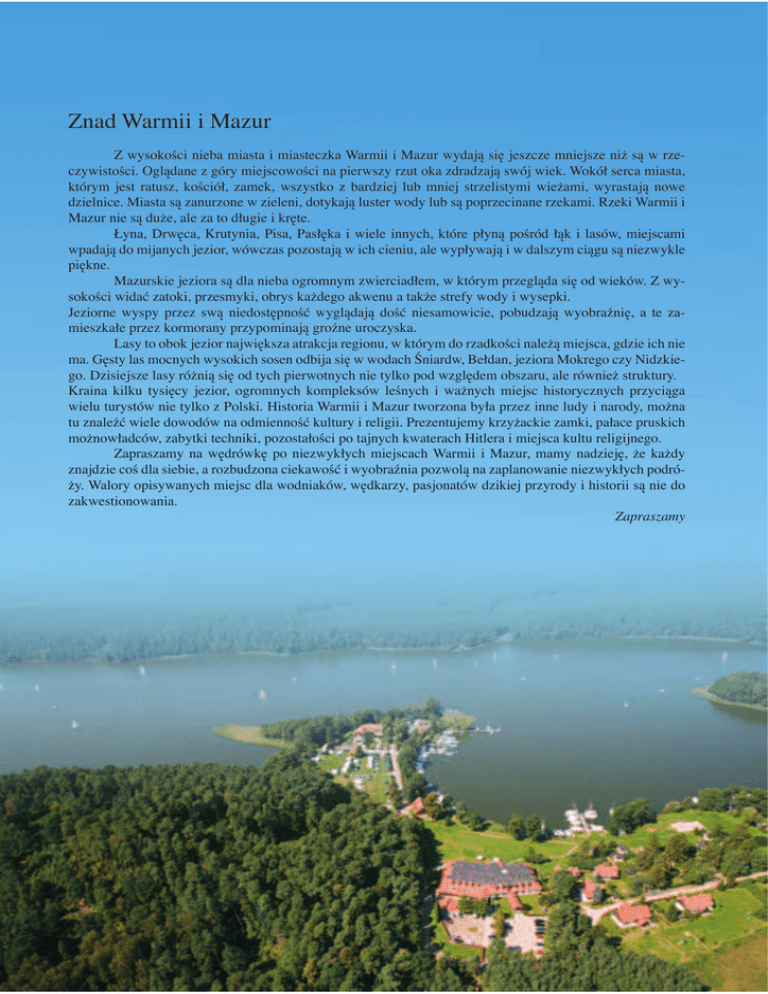Znad Warmii i Mazur Z wysokości nieba miasta i miasteczka Warmii i Mazur wydają się jeszcze mniejsze niż są w rzeczywistości. Oglądane z góry miejscowości na pierwszy rzut oka zdradzają swój wiek. Wokół serca miasta, którym jest ratusz, kościół, zamek, wszystko z bardziej lub mniej strzelistymi wieżami, wyrastają nowe dzielnice. Miasta są zanurzone w zieleni, dotykają luster wody lub są poprzecinane rzekami. Rzeki Warmii i Mazur nie są duże, ale za to długie i kręte. Łyna, Drwęca, Krutynia, Pisa, Pasłęka i wiele innych, które płyną pośród łąk i lasów, miejscami wpadają do mijanych jezior, wówczas pozostają w ich cieniu, ale wypływają i w dalszym ciągu są niezwykle piękne. Mazurskie jeziora są dla nieba ogromnym zwierciadłem, w którym przegląda się od wieków. Z wysokości widać zatoki, przesmyki, obrys każdego akwenu a także strefy wody i wysepki. Jeziorne wyspy przez swą niedostępność wyglądają dość niesamowicie, pobudzają wyobraźnię, a te zamieszkałe przez kormorany przypominają groźne uroczyska. Lasy to obok jezior największa atrakcja regionu, w którym do rzadkości należą miejsca, gdzie ich nie ma. Gęsty las mocnych wysokich sosen odbija się w wodach Śniardw, Bełdan, jeziora Mokrego czy Nidzkiego. Dzisiejsze lasy różnią się od tych pierwotnych nie tylko pod względem obszaru, ale również struktury. Kraina kilku tysięcy jezior, ogromnych kompleksów leśnych i ważnych miejsc historycznych przyciąga wielu turystów nie tylko z Polski. Historia Warmii i Mazur tworzona była przez inne ludy i narody, można tu znaleźć wiele dowodów na odmienność kultury i religii. Prezentujemy krzyżackie zamki, pałace pruskich możnowładców, zabytki techniki, pozostałości po tajnych kwaterach Hitlera i miejsca kultu religijnego. Zapraszamy na wędrówkę po niezwykłych miejscach Warmii i Mazur, mamy nadzieję, że każdy znajdzie coś dla siebie, a rozbudzona ciekawość i wyobraźnia pozwolą na zaplanowanie niezwykłych podróży. Walory opisywanych miejsc dla wodniaków, wędkarzy, pasjonatów dzikiej przyrody i historii są nie do zakwestionowania. Zapraszamy