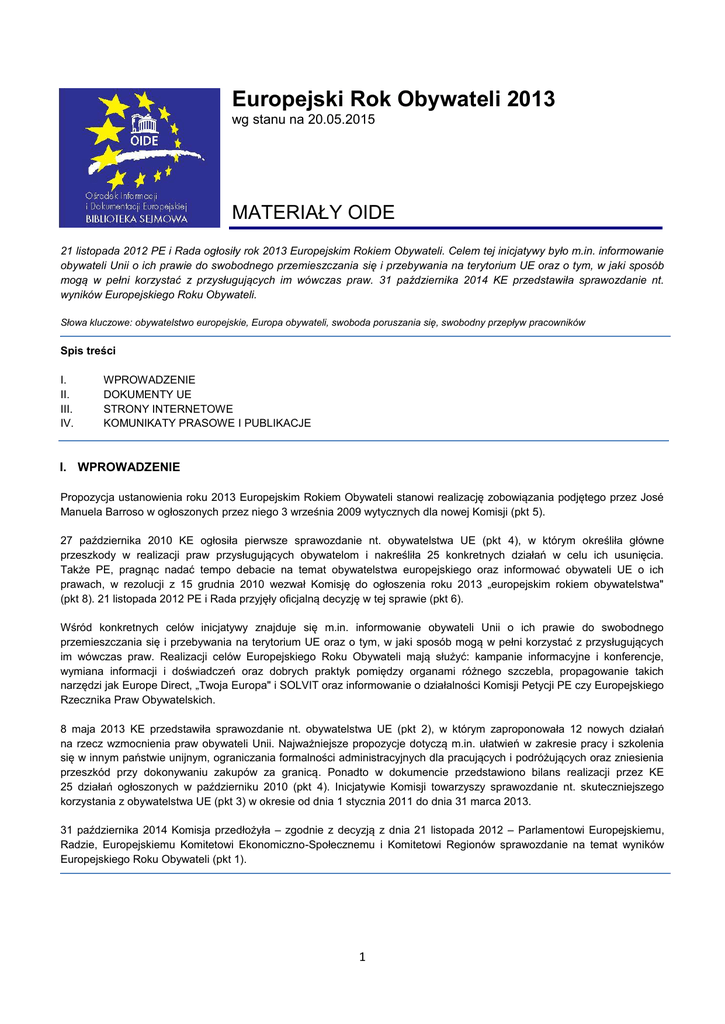 Europejski Rok Obywateli 2013 wg stanu na 20.05.2015 MATERIAŁY OIDE 21 listopada 2012 PE i Rada ogłosiły rok 2013 Europejskim Rokiem Obywateli. Celem tej inicjatywy było m.in. informowanie obywateli Unii o ich prawie do swobodnego przemieszczania się i przebywania na terytorium UE oraz o tym, w jaki sposób mogą w pełni korzystać z przysługujących im wówczas praw. 31 października 2014 KE przedstawiła sprawozdanie nt. wyników Europejskiego Roku Obywateli. Słowa kluczowe: obywatelstwo europejskie, Europa obywateli, swoboda poruszania się, swobodny przepływ pracowników Spis treści I. II. III. IV. WPROWADZENIE DOKUMENTY UE STRONY INTERNETOWE KOMUNIKATY PRASOWE I PUBLIKACJE I. WPROWADZENIE Propozycja ustanowienia roku 2013 Europejskim Rokiem Obywateli stanowi realizację zobowiązania podjętego przez José Manuela Barroso w ogłoszonych przez niego 3 września 2009 wytycznych dla nowej Komisji (pkt 5). 27 października 2010 KE ogłosiła pierwsze sprawozdanie nt. obywatelstwa UE (pkt 4), w którym określiła główne przeszkody w realizacji praw przysługujących obywatelom i nakreśliła 25 konkretnych działań w celu ich usunięcia. Także PE, pragnąc nadać tempo debacie na temat obywatelstwa europejskiego oraz informować obywateli UE o ich prawach, w rezolucji z 15 grudnia 2010 wezwał Komisję do ogłoszenia roku 2013 „europejskim rokiem obywatelstwa" (pkt 8). 21 listopada 2012 PE i Rada przyjęły oficjalną decyzję w tej sprawie (pkt 6). Wśród konkretnych celów inicjatywy znajduje się m.in. informowanie obywateli Unii o ich prawie do swobodnego przemieszczania się i przebywania na terytorium UE oraz o tym, w jaki sposób mogą w pełni korzystać z przysługujących im wówczas praw. Realizacji celów Europejskiego Roku Obywateli mają służyć: kampanie informacyjne i konferencje, wymiana informacji i doświadczeń oraz dobrych praktyk pomiędzy organami różnego szczebla, propagowanie takich narzędzi jak Europe Direct, „Twoja Europa" i SOLVIT oraz informowanie o działalności Komisji Petycji PE czy Europejskiego Rzecznika Praw Obywatelskich. 8 maja 2013 KE przedstawiła sprawozdanie nt. obywatelstwa UE (pkt 2), w którym zaproponowała 12 nowych działań na rzecz wzmocnienia praw obywateli Unii. Najważniejsze propozycje dotyczą m.in. ułatwień w zakresie pracy i szkolenia się w innym państwie unijnym, ograniczania formalności administracyjnych dla pracujących i podróżujących oraz zniesienia przeszkód przy dokonywaniu zakupów za granicą. Ponadto w dokumencie przedstawiono bilans realizacji przez KE 25 działań ogłoszonych w październiku 2010 (pkt 4). Inicjatywie Komisji towarzyszy sprawozdanie nt. skuteczniejszego korzystania z obywatelstwa UE (pkt 3) w okresie od dnia 1 stycznia 2011 do dnia 31 marca 2013. 31 października 2014 Komisja przedłożyła – zgodnie z decyzją z dnia 21 listopada 2012 – Parlamentowi Europejskiemu, Radzie, Europejskiemu Komitetowi Ekonomiczno-Społecznemu i Komitetowi Regionów sprawozdanie na temat wyników Europejskiego Roku Obywateli (pkt 1). 1 II. DOKUMENTY UE Komisja Europejska 1. Sprawozdanie Komisji dla Parlamentu Europejskiego, Rady, Europejskiego Komitetu Ekonomiczno-Społecznego i Komitetu Regionów w sprawie realizacji, wyników i ogólnej oceny Europejskiego Roku Obywateli 2013, COM (2014) 687; załącznik nr 1 2. Sprawozdanie Komisji dla Parlamentu Europejskiego, Rady, Europejskiego Komitetu Ekonomiczno-Społecznego i Komitetu Regionów - Sprawozdanie na temat obywatelstwa UE – 2013 r.; Prawa i przyszłość obywateli Unii, COM(2013) 269 3. Sprawozdanie Komisji dla Parlamentu Europejskiego, Rady, Europejskiego Komitetu Ekonomiczno-Społecznego i Komitetu Regionów – na podstawie art. 25 TFUE - w sprawie postępów w skutecznym korzystaniu z obywatelstwa Unii Europejskiej w latach 2011–2013, COM(2013) 270 4. Sprawozdanie na temat obywatelstwa UE – 2010 r. Usuwanie przeszkód w zakresie praw obywatelskich UE, KOM(2010) 603 wersja ostateczna 5. José Manuel Barroso: Political guidelines for the next Commission, 2009 Parlament Europejski 6. Decyzja Parlamentu Europejskiego i Rady Nr 1093/2012/UE z dnia 21 listopada 2012 r. w sprawie Europejskiego Roku Obywateli (2013) 7. Rezolucja ustawodawcza Parlamentu Europejskiego z dnia 23 października 2012 r. w sprawie wniosku dotyczącego decyzji Parlamentu Europejskiego i Rady w sprawie Europejskiego Roku Obywateli (2013) 8. Rezolucja Parlamentu Europejskiego z dnia 15 grudnia 2010 r. w sprawie sytuacji praw podstawowych w Unii Europejskiej (2009–2010) – kwestie instytucjonalne po wejściu w życie traktatu lizbońskiego III. STRONY INTERNETOWE Unia Europejska 9. Europejski Rok Obywateli 2013 – strona oficjalna w portalu EUROPA 10. EU citizenship – strona KE poświęcona obywatelstwu UE 11. Twoja Europa – pomoc i porady dla obywateli UE i ich rodzin Polska 12. 2013 - Europejskim Rokiem Obywateli – strona MSW IV. KOMUNIKATY PRASOWE I PUBLIKACJE 13. Citizens' rights: two new reports reveal Commission proposals to reinforce citizenship and progress in making fundamental rights a reality, 08.05.2013, komunikat prasowy 14. Obywatelstwo UE: Komisja proponuje 12 nowych działań na rzecz wzmocnienia praw obywateli, 08.05.2013, komunikat prasowy Komisji Europejskiej 15. Flash Eurobarometr 365 –European Union citizenship – Report, February 2013 16. Making the most of EU Citizenship - Hearing on EU Citizenship, 19.02.2013 17. Komisja Europejska otwiera Europejski Rok Obywateli 2013, 01.01.2013, komunikat prasowy Komisji Europejskiej 18. Europejski Rok Obywateli: poznaj swoje prawa!, 23.10.2012, komunikat prasowy na stronie PE 19. Europejski Rok Obywateli (2013): Obywatelstwo europejskie na poziomie lokalnym i regionalnym, notatka informacyjna Komitetu Regionów 20. The EU Citizens' Agenda – Europeans have their say; Analysis report – Public consultation 2012 2