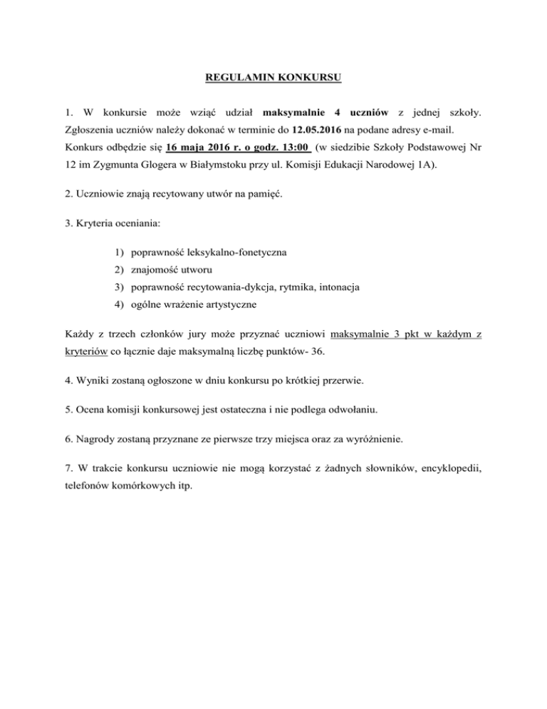 REGULAMIN KONKURSU 1. W konkursie może wziąć udział maksymalnie 4 uczniów z jednej szkoły. Zgłoszenia uczniów należy dokonać w terminie do 12.05.2016 na podane adresy e-mail. Konkurs odbędzie się 16 maja 2016 r. o godz. 13:00 (w siedzibie Szkoły Podstawowej Nr 12 im Zygmunta Glogera w Białymstoku przy ul. Komisji Edukacji Narodowej 1A). 2. Uczniowie znają recytowany utwór na pamięć. 3. Kryteria oceniania: 1) poprawność leksykalno-fonetyczna 2) znajomość utworu 3) poprawność recytowania-dykcja, rytmika, intonacja 4) ogólne wrażenie artystyczne Każdy z trzech członków jury może przyznać uczniowi maksymalnie 3 pkt w każdym z kryteriów co łącznie daje maksymalną liczbę punktów- 36. 4. Wyniki zostaną ogłoszone w dniu konkursu po krótkiej przerwie. 5. Ocena komisji konkursowej jest ostateczna i nie podlega odwołaniu. 6. Nagrody zostaną przyznane ze pierwsze trzy miejsca oraz za wyróżnienie. 7. W trakcie konkursu uczniowie nie mogą korzystać z żadnych słowników, encyklopedii, telefonów komórkowych itp.