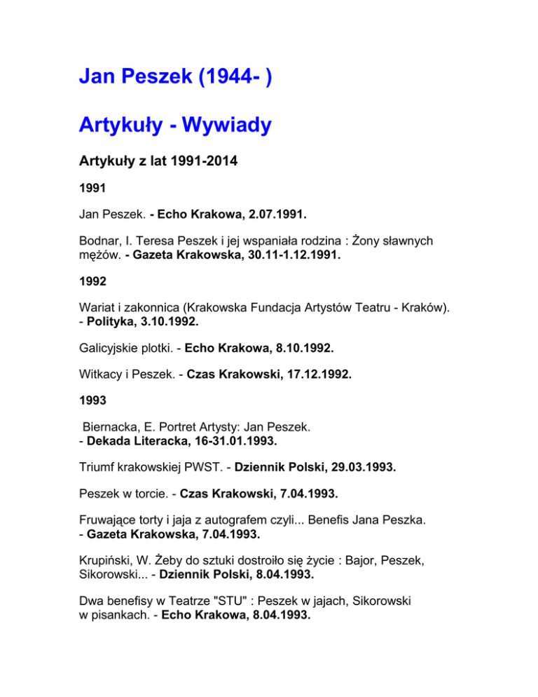 Jan Peszek (1944- ) Artykuły - Wywiady Artykuły z lat 1991-2014 1991 Jan Peszek. - Echo Krakowa, 2.07.1991. Bodnar, I. Teresa Peszek i jej wspaniała rodzina : Żony sławnych mężów. - Gazeta Krakowska, 30.11-1.12.1991. 1992 Wariat i zakonnica (Krakowska Fundacja Artystów Teatru - Kraków). - Polityka, 3.10.1992. Galicyjskie plotki. - Echo Krakowa, 8.10.1992. Witkacy i Peszek. - Czas Krakowski, 17.12.1992. 1993 Biernacka, E. Portret Artysty: Jan Peszek. - Dekada Literacka, 16-31.01.1993. Triumf krakowskiej PWST. - Dziennik Polski, 29.03.1993. Peszek w torcie. - Czas Krakowski, 7.04.1993. Fruwające torty i jaja z autografem czyli... Benefis Jana Peszka. - Gazeta Krakowska, 7.04.1993. Krupiński, W. Żeby do sztuki dostroiło się życie : Bajor, Peszek, Sikorowski... - Dziennik Polski, 8.04.1993. Dwa benefisy w Teatrze "STU" : Peszek w jajach, Sikorowski w pisankach. - Echo Krakowa, 8.04.1993. Mikos, M. Peszek w torcie. - Gazeta Wyborcza, 13.04.1993. Kowalczyk, J. R. Wystrzałowe życie. - Rzeczpospolita, 16.04.1993. 2 TVP 22:05 Benefis Jana Peszka w Teatrze STU. - Gazeta Wyborcza, 8-9.05.1993. Festiwalowe Laury dla Gardzienic, Głowackiego, Jarockiego i Peszka. - Gazeta Robotnicza, 18.05.1993. Kucharski K. Autorski czy nieautorski. - Gazeta Robotnicza, 20.05.1993. Jury jubileuszowego XXX Festiwalu Polskich Sztuk Współczesnych we Wrocławiu przyznało nagrody. - Przekrój, 30.05.1993. Fryz-Więcek, A. Teatralny dom rodziny Peszków. - Gazeta Krakowska, 12-13.06.1993. Cybulski, W. Koncertmistrz. Jana Peszka mógłby zastąpić tylko Woody Allen. - Dziennik Polski, 25.06.1993. Peszek znowu w Nowym Jorku. - Gazeta Wyborcza (Gazeta Łódzka), 20-21.11.1993. [Ogłoszenie o spektaklu w dniu 8 grudnia, pt. "Scenariusz dla nieistniejącego lecz możliwego aktora instrumentalnego".] - Gazeta Wyborcza (Gazeta Dolnośląska, 23.11.1993. Musiał, A. Mogłem pokazać goły tyłek. Jan Peszek Superstar. - Gazeta Wyborcza, Gazeta Łódzka), 27/28.11.1993. 1994 Rodzinny teatr Peszków. - Gazeta Krakowska, 4.01.1994. Jan Peszek zmienny jak kameleon. - Świat Kobiety, 15.02.1994. Jan Peszek podwójnie : "Wariat i zakonnica" w "Imparcie". - Gazeta Robotnicza, 16.02.1994. Brawa dla Peszka. - Gazeta Wyborcza (Gazeta Dolnośląska), 1.03.1994. Nasi za granicą [informacja o premierze przedstawienia Sunatokei-no santorium w Tokio 15X]. – Teatr, nr 11, listopad 1994. Keszcz, H. Wszyscy na scenę. - Gazeta Krakowska, 23/26.12.1994. 1995 Aury, atmosfery, Schulz. - Dziennik Polski, 4.01.1995. Sanatorium pod Peszkami. Premiera w Teatrze im. Słowackiego. - Czas Krakowski, 4.01.1995. Fryz-Więcek, A. Układanka z Schulza : Klan Peszków w "Miniaturze". - Gazeta Krakowska, 13.01.1995. Laury dla Peszka : VII Złoty Wawrzyn Grzymały. - Ilustrowany Kurier Polski, 13/15.01.1995. Gwiazdy w złotych wieńcach. - Gazeta Pomorska, 30.01.1995. Nowak, A. Podwójny syndrom ojca : Rodzina Peszków w "Sanatorium". - Ilustrowany Kurier Polski, 3/5.02.1995. "Schulz" Peszka. - Dziennik Łódzki, 21.02.1995. Zaproszenia dla Czytelników: Dni Peszka. - Kurier Szczeciński, 8.03.1995. Jęsiak, A. Wieczór z Schaefferem : "Miniatura" ledwo pomieściła widzów. - Dziennik Bałtycki, 8.03.1995. Teatralny weekend : Dwie premiery i Jan Peszek. - Głos Szczeciński, 11/12.03.1995. Peszek w Szczecinie. - Gazeta Krakowska, 13.03.1995. Dni Jana Peszka [w Szczecinie]. - Dziennik Polski, 13.03.1995. Wyżyńska, D. Rodzina Peszków na scenie : W Teatrze Studio : Bruno Schulz Jana Peszka. - Gazeta Wyborcza (Gazeta Stołeczna), 12.05.1995. Klan Peszków w "Studio". - Kurier Polski, 12/14.05.1995. Jan Peszek [życzenia dla Wiadomości Kulturalnych]. - Wiadomości Kulturalne, 28.05.1995. Ziemianin, M. Tym razem nie w Andrychowie : Wakacje u Peszków. - Gazeta Krakowska, 6.07.1995. Bułkowa, G. Jan Peszek w Nowym Jorku : Korespondencja ze Stanów Zjednoczonych. - Echo Krakowa, 18.07.1995. Aktorzy na Plan [o filmie "Po latach]. - Gazeta Wyborcza (Gazeta Stołeczna), 18.08.1995. Solińska, E. Na inaugurację Peszek w roli wyrywacza serc : Warszawska Jesień : Pod opieką Radia. - Życie Warszawy, 6.09.1995. "Po latach" nad Wisłą. - Gazeta Wyborcza, 9/10.09.1995. Tumiłowicz, B. Jaka jesteś muzyczna awangardo? : "Warszawska Jesień '95". - Przegląd Tygodniowy, 27.09.1995. Jan Peszek. - Echo Krakowa, 4.10.1995. Tolerancja : Co to znaczy : opinie. - Twój Styl, nr 10, październik 1995. Tarnowski dyplom studentów PWST : Pod kierunkiem Jana Peszka. - Dziennik Polski, 6.11.1995. Premierowy spektakl. - Gazeta Krakowska, 6.11.1995. Obronić dyplom w Tarnowie. - TEMI, 8.11.1995. Dyplomowa Premiera : Aktualności Tarnowskie. - Gazeta w Krakowie, 8.11.1995. 1996 Budzińska, A. Jan Peszek: Pierwszy raz jestem tematem wystawy. - Echo Krakowa, 5/7.01.1996. Powrót "Mizantropa" : Tercet Peszków : W Teatrze Miejskim w Gdyni. - Dziennik Bałtycki, 26.04.1996. "Mutanci". [Teatr TV]. - Dziennik Zachodni, 30.08/1.09.1996. Tomaszewski, S. Na otwarcie Fredro i Ostrowski [o Teatrze TV]. - Przegląd Tygodniowy, 4.09.1996. Hałasa, D. Peszek i japońska doskonałość : Korespondencja "Dziennika" z Tokio. - Dziennik Polski, 7.11.1996. Rozebrał wszystkich, nawet siebie : Schulz według Peszka. - Dziennik Wschodni, 11.12.1996. Haponiuk, M. Smak niespełnienia : Poniedziałkowe "Sanatorium Pod Klepsydrą" rodziny Peszków. - Gazeta Wyborcza (Gazeta w Lublinie), 11.12.1996. 1997 Niziołek, A. Spaliśmy w Drohobyczu : Teatr Jana Peszka : "Sanatorium Pod Klepsydrą". - Gazeta Wyborcza (Gazeta Wielkopolska), 5.03.1997. Mikos, M. Dwadzieścia lat z hakiem : Scenariusz dla Nie istniejącego... Spóźniony Jubileusz. - Gazeta Wyborcza (Gazeta w Krakowie), 21.03.1997. Na jego pracoholizm nie ma lekarstwa. - Życie na Gorąco, 27.03.1997. Śmietana, K. Wirtuozeria Jana Peszka. - Pasmo, 16.05.1997. Huzarska-Szumiec, M. Klony. - Gazeta Krakowska, 6.06.1997. "Sanatorium Pod Klepsydrą" według Peszka : Izrael : Tydzień Schulza. - Rzeczpospolita, 10.06.1997. Wolny strzelec.