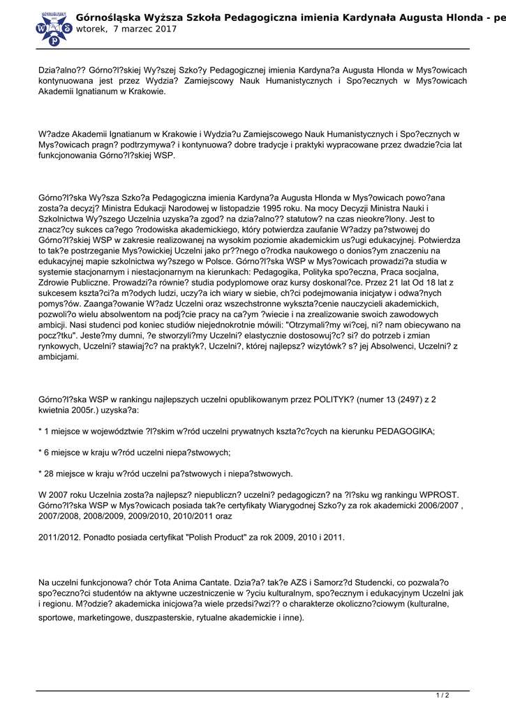 Górnośląska Wyższa Szkoła Pedagogiczna imienia Kardynała Augusta Hlonda - pe wtorek, 7 marzec 2017 Dzia?alno?? Górno?l?skiej Wy?szej Szko?y Pedagogicznej imienia Kardyna?a Augusta Hlonda w Mys?owicach kontynuowana jest przez Wydzia? Zamiejscowy Nauk Humanistycznych i Spo?ecznych w Mys?owicach Akademii Ignatianum w Krakowie. W?adze Akademii Ignatianum w Krakowie i Wydzia?u Zamiejscowego Nauk Humanistycznych i Spo?ecznych w Mys?owicach pragn? podtrzymywa? i kontynuowa? dobre tradycje i praktyki wypracowane przez dwadzie?cia lat funkcjonowania Górno?l?skiej WSP. Górno?l?ska Wy?sza Szko?a Pedagogiczna imienia Kardyna?a Augusta Hlonda w Mys?owicach powo?ana zosta?a decyzj? Ministra Edukacji Narodowej w listopadzie 1995 roku. Na mocy Decyzji Ministra Nauki i Szkolnictwa Wy?szego Uczelnia uzyska?a zgod? na dzia?alno?? statutow? na czas nieokre?lony. Jest to znacz?cy sukces ca?ego ?rodowiska akademickiego, który potwierdza zaufanie W?adzy pa?stwowej do Górno?l?skiej WSP w zakresie realizowanej na wysokim poziomie akademickim us?ugi edukacyjnej. Potwierdza to tak?e postrzeganie Mys?owickiej Uczelni jako pr??nego o?rodka naukowego o donios?ym znaczeniu na edukacyjnej mapie szkolnictwa wy?szego w Polsce. Górno?l?ska WSP w Mys?owicach prowadzi?a studia w systemie stacjonarnym i niestacjonarnym na kierunkach: Pedagogika, Polityka spo?eczna, Praca socjalna, Zdrowie Publiczne. Prowadzi?a równie? studia podyplomowe oraz kursy doskonal?ce. Przez 21 lat Od 18 lat z sukcesem kszta?ci?a m?odych ludzi, uczy?a ich wiary w siebie, ch?ci podejmowania inicjatyw i odwa?nych pomys?ów. Zaanga?owanie W?adz Uczelni oraz wszechstronne wykszta?cenie nauczycieli akademickich, pozwoli?o wielu absolwentom na podj?cie pracy na ca?ym ?wiecie i na zrealizowanie swoich zawodowych ambicji. Nasi studenci pod koniec studiów niejednokrotnie mówili: "Otrzymali?my wi?cej, ni? nam obiecywano na pocz?tku". Jeste?my dumni, ?e stworzyli?my Uczelni? elastycznie dostosowuj?c? si? do potrzeb i zmian rynkowych, Uczelni? stawiaj?c? na praktyk?, Uczelni?, której najlepsz? wizytówk? s? jej Absolwenci, Uczelni? z ambicjami. Górno?l?ska WSP w rankingu najlepszych uczelni opublikowanym przez POLITYK? (numer 13 (2497) z 2 kwietnia 2005r.) uzyska?a: * 1 miejsce w województwie ?l?skim w?ród uczelni prywatnych kszta?c?cych na kierunku PEDAGOGIKA; * 6 miejsce w kraju w?ród uczelni niepa?stwowych; * 28 miejsce w kraju w?ród uczelni pa?stwowych i niepa?stwowych. W 2007 roku Uczelnia zosta?a najlepsz? niepubliczn? uczelni? pedagogiczn? na ?l?sku wg rankingu WPROST. Górno?l?ska WSP w Mys?owicach posiada tak?e certyfikaty Wiarygodnej Szko?y za rok akademicki 2006/2007 , 2007/2008, 2008/2009, 2009/2010, 2010/2011 oraz 2011/2012. Ponadto posiada certyfikat "Polish Product" za rok 2009, 2010 i 2011. Na uczelni funkcjonowa? chór Tota Anima Cantate. Dzia?a? tak?e AZS i Samorz?d Studencki, co pozwala?o spo?eczno?ci studentów na aktywne uczestniczenie w ?yciu kulturalnym, spo?ecznym i edukacyjnym Uczelni jak i regionu. M?odzie? akademicka inicjowa?a wiele przedsi?wzi?? o charakterze okoliczno?ciowym (kulturalne, sportowe, marketingowe, duszpasterskie, rytualne akademickie i inne). 1/2 Górnośląska Wyższa Szkoła Pedagogiczna imienia Kardynała Augusta Hlonda - pe wtorek, 7 marzec 2017 2/2