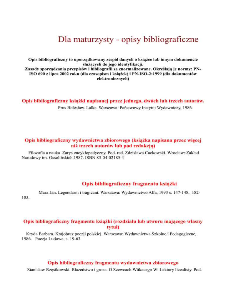 Dla maturzysty - opisy bibliograficzne Opis bibliograficzny to uporządkowany zespół danych o książce lub innym dokumencie służących do jego identyfikacji. Zasady sporządzania przypisów i bibliografii są znormalizowane. Określają je normy: PNISO 690 z lipca 2002 roku (dla czasopism i książek) i PN-ISO-2:1999 (dla dokumentów elektronicznych) Opis bibliograficzny książki napisanej przez jednego, dwóch lub trzech autorów. Prus Bolesław. Lalka. Warszawa: Państwowy Instytut Wydawniczy, 1986 Opis bibliograficzny wydawnictwa zbiorowego (książka napisana przez więcej niż trzech autorów lub pod redakcją) Filozofia a nauka Zarys encyklopedyczny. Pod. red. Zdzisława Cackowski. Wrocław: Zakład Narodowy im. Ossolińskich,1987. ISBN 83-04-02185-4 Opis bibliograficzny fragmentu książki Marx Jan. Legendarni i tragiczni. Warszawa: Wydawnictwo Alfa, 1993 s. 147-148, 182183. Opis bibliograficzny fragmentu książki (rozdziału lub utworu mającego własny tytuł) Kryda Barbara. Krajobraz poezji polskiej. Warszawa: Wydawnictwa Szkolne i Pedagogiczne, 1986. Poezja Ludowa, s. 19-63 Opis bibliograficzny fragmentu wydawnictwa zbiorowego Stanisław Rzęsikowski. Błazeństwo i groza. O Szewcach Witkacego W: Lektury licealisty. Pod. red. Wojciecha Pykosza i Leszka Bugajskiego. Warszawa: Zakład Narodowy im. Ossolińskich, 1986, s.72 - 78. Opis bibliograficzny artykułu z czasopisma Anna Woźniak. Nowoczesne technologie w prognozowaniu pogody. Geografia 2014 nr 2, Opis reprodukcji obrazu Rembrandt. Powrót syna marnotrawnego. [il.]. W: Krzysztof Mrowcewicz. Świat Biblii i Antyku. Warszawa: Stentor, 1998. ISBN 83-86018-49-6, nr il. 16. Opis filmu Nad Niemnem [Film]. Reż. Zbigniew Kuźmiński. Warszawa: Studio Filmowe Profil, 1986. 1 płyta DVD. Opis dokumentu elektronicznego Kopaliński Władysław. Słownik wyrazów obcych i zwrotów obcojęzycznych [CD-ROM]. Wersja 1.03.16. Łódź Pro – Media CD, 1998. ISBN 83-07231-3.