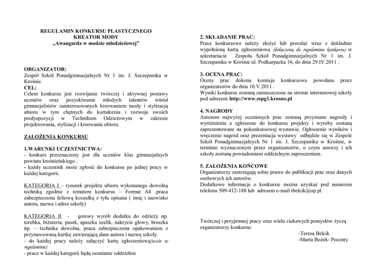 REGULAMIN KONKURSU PLASTYCZNEGO KREATOR MODY „Awangarda w modzie młodzieżowej” ORGANIZATOR: Zespół Szkół Ponadgimnazjalnych Nr 1 im. J. Szczepanika w Krośnie. CEL: Celem konkursu jest rozwijanie twórczej i aktywnej postawy uczniów oraz pozyskiwanie młodych talentów wśród gimnazjalistów zainteresowanych kreowaniem mody i stylizacją ubioru w tym chętnych do kształcenia i rozwoju swoich predyspozycji w Technikum Odzieżowym w zakresie projektowania, stylizacji i kreowania ubioru. ZAŁOŻENIA KONKURSU 1.WARUNKI UCZESTNICTWA: - konkurs przeznaczony jest dla uczniów klas gimnazjalnych powiatu krośnieńskiego . - każdy uczestnik może zgłosić do konkursu po jednej pracy w każdej kategorii. KATEGORIA I – rysunek projektu ubioru wykonanego dowolną techniką zgodnie z tematem konkursu – Format A4 ,praca zabezpieczona foliową koszulką z tyłu opisana ( imię i nazwisko autora, nazwa i adres szkoły) KATEGORIA II gotowy wyrób dodatku do odzieży np. torebka, biżuteria, pasek, apaszka szalik, nakrycie głowy, broszka itp. – technika dowolna, praca zabezpieczona opakowaniem z przymocowaną kartkę zawierającą dane autora i nazwę szkoły. - do każdej pracy należy załączyć kartę zgłoszeniową(wzór w regulaminie) - prace w każdej kategorii będą ocenianie oddzielnie 2. SKŁADANIE PRAC: Prace konkursowe należy złożyć lub przesłać wraz z dokładnie wypełnioną kartą zgłoszeniową (dołączoną do regulaminu konkursu) w sekretariacie Zespołu Szkół Ponadgimnazjalnych Nr 1 im. J. Szczepanika w Krośnie ul. Podkarpacka 16, do dnia 29.IV.2011 . 3. OCENA PRAC: Oceny prac dokona komisja konkursowa powołana przez organizatorów do dnia 10.V.2011 . Wyniki konkursu zostaną zamieszczone na stronie internetowej szkoły pod adresem: http://www.zspg1.krosno.pl 4. NAGRODY Autorom najwyżej ocenionych prac zostaną przyznane nagrody i wyróżnienia a zgłoszone do konkursu projekty i wyroby zostaną zaprezentowane na pokonkursowej wystawie. Ogłoszenie wyników i wręczenie nagród oraz prezentacja wystawy odbędzie się w Zespole Szkół Ponadgimnazjalnych Nr 1 im. J. Szczepanika w Krośnie, w terminie wyznaczonym przez organizatorów, o czym autorzy i ich szkoły zostaną powiadomieni oddzielnym zaproszeniem. 5. ZAŁOŻENIA KOŃCOWE Organizatorzy zastrzegają sobie prawo do publikacji prac oraz danych osobowych ich autorów. Dodatkowe informacje o konkursie można uzyskać pod numerem telefonu 509-412-188 lub adresem e-mail [email protected] Twórczej i przyjemnej pracy oraz wielu ciekawych pomysłów życzą organizatorzy konkursu: -Teresa Belcik -Marta Bożek- Pocenty