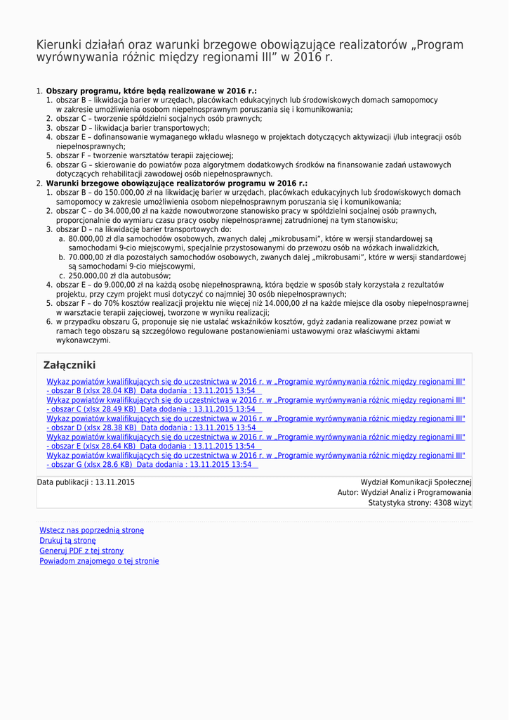 Kierunki działań oraz warunki brzegowe obowiązujące realizatorów „Program wyrównywania różnic między regionami III” w 2016 r. 1. Obszary programu, które będą realizowane w 2016 r.: 1. obszar B – likwidacja barier w urzędach, placówkach edukacyjnych lub środowiskowych domach samopomocy w zakresie umożliwienia osobom niepełnosprawnym poruszania się i komunikowania; 2. obszar C – tworzenie spółdzielni socjalnych osób prawnych; 3. obszar D – likwidacja barier transportowych; 4. obszar E – dofinansowanie wymaganego wkładu własnego w projektach dotyczących aktywizacji i/lub integracji osób niepełnosprawnych; 5. obszar F – tworzenie warsztatów terapii zajęciowej; 6. obszar G – skierowanie do powiatów poza algorytmem dodatkowych środków na finansowanie zadań ustawowych dotyczących rehabilitacji zawodowej osób niepełnosprawnych. 2. Warunki brzegowe obowiązujące realizatorów programu w 2016 r.: 1. obszar B – do 150.000,00 zł na likwidację barier w urzędach, placówkach edukacyjnych lub środowiskowych domach samopomocy w zakresie umożliwienia osobom niepełnosprawnym poruszania się i komunikowania; 2. obszar C – do 34.000,00 zł na każde nowoutworzone stanowisko pracy w spółdzielni socjalnej osób prawnych, proporcjonalnie do wymiaru czasu pracy osoby niepełnosprawnej zatrudnionej na tym stanowisku; 3. obszar D – na likwidację barier transportowych do: a. 80.000,00 zł dla samochodów osobowych, zwanych dalej „mikrobusami”, które w wersji standardowej są samochodami 9-cio miejscowymi, specjalnie przystosowanymi do przewozu osób na wózkach inwalidzkich, b. 70.000,00 zł dla pozostałych samochodów osobowych, zwanych dalej „mikrobusami”, które w wersji standardowej są samochodami 9-cio miejscowymi, c. 250.000,00 zł dla autobusów; 4. obszar E – do 9.000,00 zł na każdą osobę niepełnosprawną, która będzie w sposób stały korzystała z rezultatów projektu, przy czym projekt musi dotyczyć co najmniej 30 osób niepełnosprawnych; 5. obszar F – do 70% kosztów realizacji projektu nie więcej niż 14.000,00 zł na każde miejsce dla osoby niepełnosprawnej w warsztacie terapii zajęciowej, tworzone w wyniku realizacji; 6. w przypadku obszaru G, proponuje się nie ustalać wskaźników kosztów, gdyż zadania realizowane przez powiat w ramach tego obszaru są szczegółowo regulowane postanowieniami ustawowymi oraz właściwymi aktami wykonawczymi. Załączniki Wykaz powiatów kwalifikujących się do uczestnictwa w 2016 r. w „Programie wyrównywania różnic między regionami III" - obszar B (xlsx 28.04 KB) Data dodania : 13.11.2015 13:54 Wykaz powiatów kwalifikujących się do uczestnictwa w 2016 r. w „Programie wyrównywania różnic między regionami III" - obszar C (xlsx 28.49 KB) Data dodania : 13.11.2015 13:54 Wykaz powiatów kwalifikujących się do uczestnictwa w 2016 r. w „Programie wyrównywania różnic między regionami III" - obszar D (xlsx 28.38 KB) Data dodania : 13.11.2015 13:54 Wykaz powiatów kwalifikujących się do uczestnictwa w 2016 r. w „Programie wyrównywania różnic między regionami III" - obszar E (xlsx 28.64 KB) Data dodania : 13.11.2015 13:54 Wykaz powiatów kwalifikujących się do uczestnictwa w 2016 r. w „Programie wyrównywania różnic między regionami III" - obszar G (xlsx 28.6 KB) Data dodania : 13.11.2015 13:54 Data publikacji : 13.11.2015 Wstecz nas poprzednią stronę Drukuj tą stronę Generuj PDF z tej strony Powiadom znajomego o tej stronie Wydział Komunikacji Społecznej Autor: Wydział Analiz i Programowania Statystyka strony: 4308 wizyt