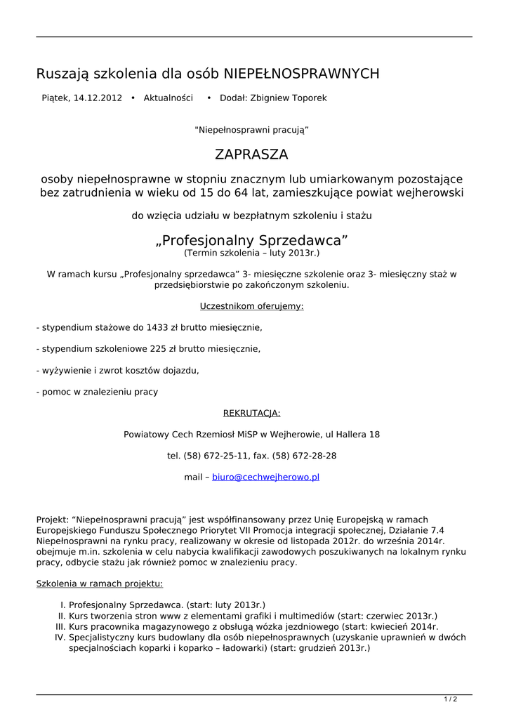 Ruszają szkolenia dla osób NIEPEŁNOSPRAWNYCH Piątek, 14.12.2012 • Aktualności • Dodał: Zbigniew Toporek "Niepełnosprawni pracują” ZAPRASZA osoby niepełnosprawne w stopniu znacznym lub umiarkowanym pozostające bez zatrudnienia w wieku od 15 do 64 lat, zamieszkujące powiat wejherowski do wzięcia udziału w bezpłatnym szkoleniu i stażu „Profesjonalny Sprzedawca” (Termin szkolenia – luty 2013r.) W ramach kursu „Profesjonalny sprzedawca” 3- miesięczne szkolenie oraz 3- miesięczny staż w przedsiębiorstwie po zakończonym szkoleniu. Uczestnikom oferujemy: - stypendium stażowe do 1433 zł brutto miesięcznie, - stypendium szkoleniowe 225 zł brutto miesięcznie, - wyżywienie i zwrot kosztów dojazdu, - pomoc w znalezieniu pracy REKRUTACJA: Powiatowy Cech Rzemiosł MiSP w Wejherowie, ul Hallera 18 tel. (58) 672-25-11, fax. (58) 672-28-28 mail – [email protected] Projekt: “Niepełnosprawni pracują” jest współfinansowany przez Unię Europejską w ramach Europejskiego Funduszu Społecznego Priorytet VII Promocja integracji społecznej, Działanie 7.4 Niepełnosprawni na rynku pracy, realizowany w okresie od listopada 2012r. do września 2014r. obejmuje m.in. szkolenia w celu nabycia kwalifikacji zawodowych poszukiwanych na lokalnym rynku pracy, odbycie stażu jak również pomoc w znalezieniu pracy. Szkolenia w ramach projektu: I. II. III. IV. Profesjonalny Sprzedawca. (start: luty 2013r.) Kurs tworzenia stron www z elementami grafiki i multimediów (start: czerwiec 2013r.) Kurs pracownika magazynowego z obsługą wózka jezdniowego (start: kwiecień 2014r. Specjalistyczny kurs budowlany dla osób niepełnosprawnych (uzyskanie uprawnień w dwóch specjalnościach koparki i koparko – ładowarki) (start: grudzień 2013r.) 1/2 Liczba uczestników w ramach każdego szkolenia – 10 osób. Zapewniamy wyżywienie oraz zwrot kosztów dojazdu. Każdy uczestnik po szkoleniu odbywa 3- miesięczny staż w przedsiębiorstwie, w ramach, którego otrzymuje stypendium stażowe do 1433 zł brutto miesięcznie. Każde z wymienionych szkoleń poprzedzone będzie rekrutacją. Prosimy o rozpowszechnienie powyższej informacji osobą zainteresowanym. Szczegółowe informacje można uzyskać pod nr tel. 58 672 25 11 wew.2 lub osobiście w dziale szkolno - kursowym Powiatowego Cechu Rzemiosł w Wejherowie ul. Hallera 18. Do pobrania: Plakat projektu 2/2 Powered by TCPDF (www.tcpdf.org)