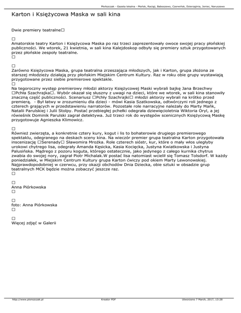 Płońszczak - Gazeta lokalna - Płońsk, Raciąż, Baboszewo, Czerwińsk, Dzierzążnia, Joniec, Naruszewo Karton i Księżycowa Maska w sali kina Dwie premiery teatralne Amatorskie teatry Karton i Księżycowa Maska po raz trzeci zaprezentowały owoce swojej pracy płońskiej publiczności. We wtorek, 21 kwietnia, w sali kina Kalejdoskop odbyły się premiery sztuk przygotowanych przez płońskie zespoły teatralne. Zarówno Księżycowa Maska, grupa teatralna zrzeszająca młodszych, jak i Karton, grupa złożona ze starszej młodzieży działają przy płońskim Miejskim Centrum Kultury. Raz w roku obie grupy wystawiają przygotowane przez siebie premierowe spektakle. Na tegoroczny występ premierowy młodzi aktorzy Księżycowej Maski wybrali bajkę Jana Brzechwy Pchła Szachrajka. Wybór okazał się słuszny z uwagi na dzieci, które we wtorek, w sali kina stanowiły znaczną część publiczności. Scenariusz Pchły Szachrajki młodzi aktorzy wybrali na krótko przed premierą. - Był łatwy w zrozumieniu dla dzieci - mówi Kasia Szatkowska, odtwórczyni roli jednego z czterech grających w przedstawieniu narratorów. Pozostałe role narracyjne należały do Marty Mańk, Natalii Parulskiej i Julii Stolpy. Postać przebiegłej pchełki odegrała dziewięcioletnia Wiktoria Oryl, a jej rówieśnik Dominik Parulski zagrał detektywa. Już trzeci rok do występów scenicznych Księżycową Maskę przygotowuje Agnieszka Klimowicz. Również zwierzęta, a konkretnie cztery kury, kogut i lis to bohaterowie drugiego premierowego spektaklu, odegranego na deskach sceny kina. Na wieczór premier grupa teatralna Karton przygotowała inscenizację Serenady Sławomira Mrożka. Role czterech sióstr, kur, które o mały włos uległyby urokowi chytrego lisa, odegrały Amanda Kęsicka, Kasia Kocięcka, Justyna Kwiatkowska i Justyna Palusińska. Mądrego z pozoru koguta, którego ostatecznie, jako jedynego z całego kurnika chytrus zwabia do swojej nory, zagrał Piotr Michalak.W postać lisa natomiast wcielił się Tomasz Tolsdorf. W każdy poniedziałek, w Miejskim Centrum Kultury grupa Karton ćwiczy pod okiem Marty Lewonowskiej. Najprawdopodobniej w czerwcu, przy okazji obchodów Dnia Dziecka, obie sztuki w obsadzie grup teatralnych MCK będzie można zobaczyć jeszcze raz. Anna Piórkowska foto: Anna Piórkowska Więcej zdjęć w Galerii http://www.plonszczak.pl Kreator PDF Utworzono 7 March, 2017, 13:28