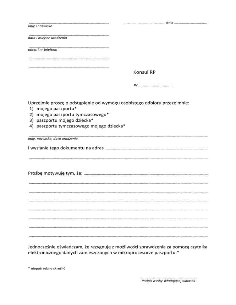 ................................................................................ imię i nazwisko ......................................... dnia ................................. ................................................................................ data i miejsce urodzenia ................................................................................ adres i nr telefonu ................................................................................ ................................................................................ Konsul RP w………………………………... Uprzejmie proszę o odstąpienie od wymogu osobistego odbioru przeze mnie: 1) mojego paszportu* 2) mojego paszportu tymczasowego* 3) paszportu mojego dziecka* 4) paszportu tymczasowego mojego dziecka* ................................................................................................................................................................................... imię, nazwisko, data urodzenia i wysłanie tego dokumentu na adres ...................................................................................................... ................................................................................................................................................................................... Prośbę motywuję tym, że: ............................................................................................................................ ................................................................................................................................................................................... ................................................................................................................................................................................... ................................................................................................................................................................................... ................................................................................................................................................................................... ................................................................................................................................................................................... ................................................................................................................................................................................... ................................................................................................................................................................................... Jednocześnie oświadczam, że rezygnuję z możliwości sprawdzenia za pomocą czytnika elektronicznego danych zamieszczonych w mikroprocesorze paszportu.* * niepotrzebne skreślić ......................................................... Podpis osoby składającej wniosek