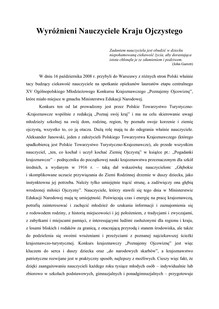 Wyróżnieni Nauczyciele Kraju Ojczystego Zadaniem nauczyciela jest obudzić w dziecku niepohamowaną ciekawość życia, aby dorastająca istota chłonęła je ze zdumieniem i podziwem. (John Garrett) W dniu 16 października 2008 r. przybyli do Warszawy z różnych stron Polski właśnie tacy budzący ciekawość nauczyciele na spotkanie opiekunów laureatów etapu centralnego XV Ogólnopolskiego Młodzieżowego Konkursu Krajoznawczego „Poznajemy Ojcowiznę”, które miało miejsce w gmachu Ministerstwa Edukacji Narodowej. Konkurs ten od lat prowadzony jest przez Polskie Towarzystwo Turystyczno-Krajoznawcze wspólnie z redakcją „Poznaj swój kraj” i ma na celu skierowanie uwagi młodzieży szkolnej na swój dom, rodzinę, region, by poznała swoje korzenie i ziemię ojczystą, wszystko to, co ją otacza. Dużą rolę mają tu do odegrania właśnie nauczyciele. Aleksander Janowski, jeden z założycieli Polskiego Towarzystwa Krajoznawczego (którego spadkobiercą jest Polskie Towarzystwo Turystyczno-Krajoznawcze), ale przede wszystkim nauczyciel, „ten, co kochał i uczył kochać Ziemię Ojczystą” w książce pt.: „Pogadanki krajoznawcze” – podręczniku do początkowej nauki krajoznawstwa przeznaczonym dla szkół średnich, a wydanym w 1916 r. – taką dał wskazówkę nauczycielom: „Głębokie i skomplikowane uczucie przywiązania do Ziemi Rodzinnej drzemie w duszy dziecka, jako instynktowna jej potrzeba. Należy tylko umiejętnie trącić strunę, a zadźwięczy ona głębią wrodzonej miłości Ojczyzny”. Nauczyciele, którzy stawili się tego dnia w Ministerstwie Edukacji Narodowej mają tę umiejętność. Poświęcają czas i energię na pracę krajoznawczą, potrafią zainteresować i zachęcić młodzież do szukania informacji i zaznajomienia się z rodowodem rodziny, z historią miejscowości i jej położeniem, z tradycjami i zwyczajami, z zabytkami i miejscami pamięci, z interesującymi ludźmi zasłużonymi dla regionu i kraju, z losami bliskich i rodaków za granicą, z otaczającą przyrodą i stanem środowiska, ale także do podzielenia się swoimi wrażeniami i przeżyciami z poznanej najciekawszej ścieżki krajoznawczo-turystycznej. Konkurs krajoznawczy „Poznajemy Ojcowiznę” jest więc kluczem do serca i duszy dziecka oraz „do narodowych skarbów”, a krajoznawstwo patriotyczne rozwijane jest w praktyczny sposób, najlepszy z możliwych. Cieszy więc fakt, że dzięki zaangażowaniu nauczycieli każdego roku tysiące młodych osób – indywidualnie lub zbiorowo w szkołach podstawowych, gimnazjalnych i ponadgimnazjalnych – przygotowuje wyjątkowe opracowania (w tym również w postaci multimedialnej), niejednokrotnie na poziomie prac licencjackich. Uczą się odkrywać piękne miejsca ojczystego kraju, a dzięki nauczycielom wspaniale utrwalone zostają historie rodzin, zawodów, osiedli, wsi, miasteczek, ale także parków czy też orkiestr i skromnych z niezmiernie ciekawym życiorysem ludzi, o których nieraz już zapomniano, a przecież oddawali życie za Polskę – swoją Ojczyznę. Jaka szkoda, że kuratorzy oświaty w województwach (poza nielicznymi, jak na przykład podkarpackie czy łódzkie) nie dostrzegają znaczenia konkursu krajoznawczego „Poznajemy Ojcowiznę” w zdobywaniu wiedzy o szerokim zakresie i zajęcie miejsc od pierwszego do trzeciego nie jest uważane za szczególne osiągnięcie ucznia w danym roku szkolnym, by można było je zaliczyć do przeliczania na punkty w konkursach tematycznych co najmniej na szczeblu wojewódzkim. Niezmiernie ważne jest docenienie tego konkursu oraz pracy dzieci, młodzieży i nauczycieli, dzięki którym powstaje więź emocjonalna z ojczystym krajem. Krokiem w tym kierunku było po raz pierwszy od 15 lat spotkanie Nauczycieli Kraju Ojczystego w Ministerstwie Edukacji Narodowej, z którymi powitał się Dyrektor Generalny Ministerstwa, Robert Bartold. Już na początku zaznaczył, że przyszedł z upoważnienia Pani Minister Katarzyny Hall, a będzie wręczał nauczycielom listy gratulacyjne w imieniu Podsekretarza Stanu Ministerstwa Krzysztofa Stanowskiego. Podkreślił również, że wszyscy, którzy uczestniczą w konkursie krajoznawczym „Poznajemy Ojcowiznę” znakomicie wpisują się w działania Ministerstwa mające na celu tworzenie szkoły twórczej i nowoczesnej. Mówił także o działaniach, by konkurs był zaliczany do dorobku młodzieży w dalszym etapie kształcenia. Spotkanie w Ministerstwie Edukacji Narodowej było podziękowaniem nauczycielom za pracę krajoznawczo-turystyczną z młodzieżą, którzy, prowadząc ścieżkami kraju ojczystego, uczą jego odkrywania, mądrego wędrowania i odpowiedniego zachowania się, oraz wiodą na spotkania z Naturą. Dzięki takim właśnie nauczycielom młodzież otwiera się na swoje małe ojczyzny, by móc później mądrze poznawać cały kraj. Wyróżnieni zostali nauczyciele: • Adamowicz Joanna ze Szkoły Podstawowej nr 1 im. Sługi Bożego Księdza Prymasa Stefana Kardynała Wyszyńskiego w Biłgoraju w województwie lubelskim. • Bernacka Agnieszka z Gimnazjum nr 1 im. Kardynała Stefana Wyszyńskiego w Przeworsku w województwie podkarpackim. • Bogdanowicz Barbara ze Szkoły Podstawowej nr 1 im. Sługi Bożego Księdza Prymasa Stefana Kardynała Wyszyńskiego w Biłgoraju w województwie lubelskim. • Buczyński Włodzimierz z Liceum Ogólnokształcącego w Zespole Szkół im. Konstytucji 3 Maja w Pobiedziskach Letnisku w województwie wielkopolskim. • Czechowska Stanisława Anna z Publicznego Gimnazjum im. Jana Pawła II w Białobrzegach w województwie mazowieckim. • Dynowska-Trybus Gertruda z I Liceum Ogólnokształcące im. Mikołaja Kopernika w Krośnie w województwie podkarpackim. • Dziubla Jadwiga z Publicznego Gimnazjum w Otfinowie w województwie małopolskim. • Flakowicz Janusz z Zespołu Szkoły Podstawowej i Gimnazjum w Zakliczynie w województwie małopolskim. • Gązwa Włodzi