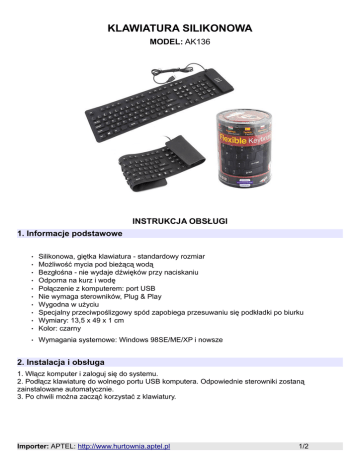 KLAWIATURA SILIKONOWA MODEL: AK136 INSTRUKCJA OBSŁUGI 1. Informacje podstawowe • • • • • • • • • • Silikonowa, giętka klawiatura - standardowy rozmiar Możliwość mycia pod bieżącą wodą Bezgłośna - nie wydaje dźwięków przy naciskaniu Odporna na kurz i wodę Połączenie z komputerem: port USB Nie wymaga sterowników, Plug & Play Wygodna w użyciu Specjalny przeciwpoślizgowy spód zapobiega przesuwaniu się podkładki po biurku Wymiary: 13,5 x 49 x 1 cm Kolor: czarny • Wymagania systemowe: Windows 98SE/ME/XP i nowsze 2. Instalacja i obsługa 1. Włącz komputer i zaloguj się do systemu. 2. Podłącz klawiaturę do wolnego portu USB komputera. Odpowiednie sterowniki zostaną zainstalowane automatycznie. 3. Po chwili można zacząć korzystać z klawiatury. Importer: APTEL: http://www.hurtownia.aptel.pl 1/2 3. Wskazówki dotyczące bezpiecznego użytkowania sprzętu i prawidłowej eksploatacji 1. Czyścić wilgotną szmatką. Nie używać silnych detergentów ani rozpuszczalników. 2. Chronić przed ekstremalnie niskimi i wysokimi temperaturami oraz mocnym promieniowaniem słonecznym. 3. Nie rzucać, nie siadać na klawiaturę. 4. Nie używać, gdy kabel USB jest w jakikolwiek sposób uszkodzony. 5. Chronić przed kontaktem z ostrymi przedmiotami – grozi trwałym uszkodzeniem klawiatury. deklaracja zgodności do pobrania pod adresem: http://www.aptel.pl Importer: APTEL: http://www.hurtownia.aptel.pl 2/2