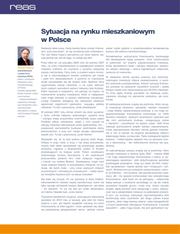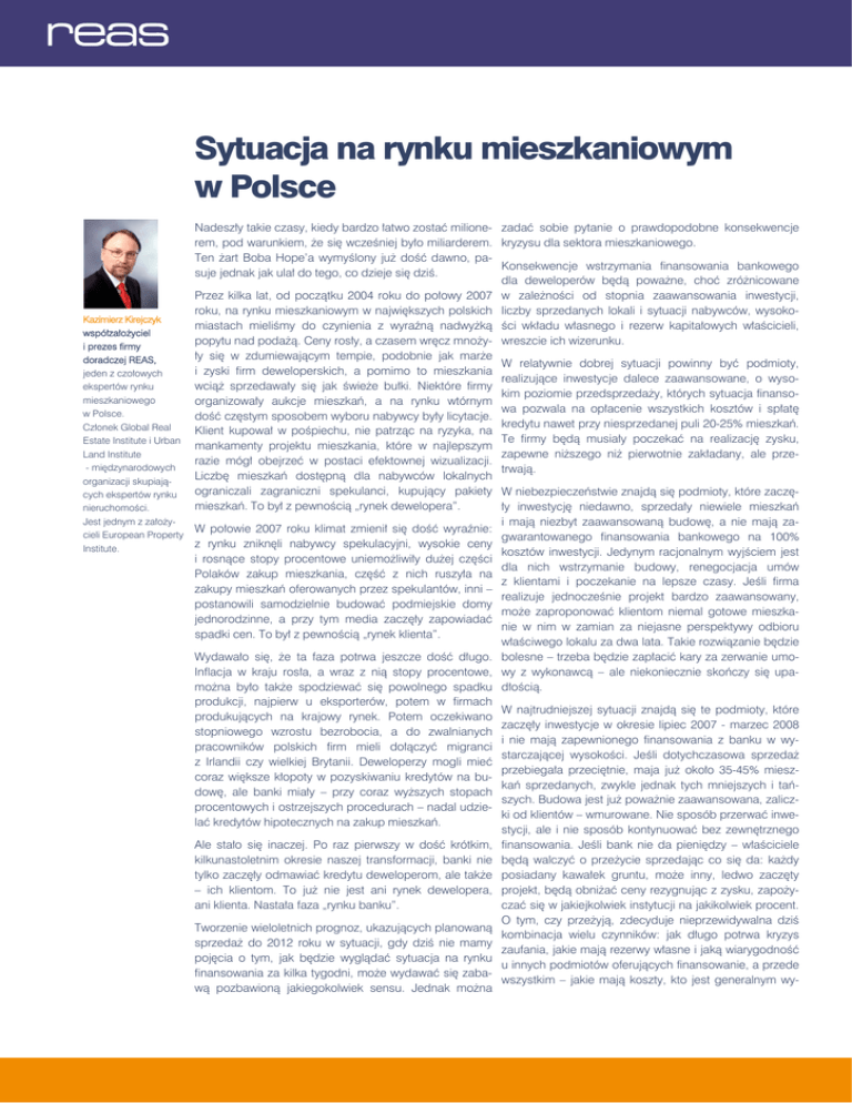Sytuacja na rynku mieszkaniowym w Polsce Nadeszły takie czasy, kiedy bardzo łatwo zostać milione- zadać sobie pytanie o prawdopodobne konsekwencje rem, pod warunkiem, że się wcześniej było miliarderem. kryzysu dla sektora mieszkaniowego. Ten żart Boba Hope’a wymyślony już dość dawno, paKonsekwencje wstrzymania finansowania bankowego suje jednak jak ulał do tego, co dzieje się dziś. dla deweloperów będą poważne, choć zróżnicowane Przez kilka lat, od początku 2004 roku do połowy 2007 w zależności od stopnia zaawansowania inwestycji, roku, na rynku mieszkaniowym w największych polskich liczby sprzedanych lokali i sytuacji nabywców, wysokoKazimierz Kirejczyk miastach mieliśmy do czynienia z wyraźną nadwyżką ści wkładu własnego i rezerw kapitałowych właścicieli, współzałożyciel popytu nad podażą. Ceny rosły, a czasem wręcz mnoży- wreszcie ich wizerunku. i prezes firmy ły się w zdumiewającym tempie, podobnie jak marże doradczej REAS, W relatywnie dobrej sytuacji powinny być podmioty, i zyski firm deweloperskich, a pomimo to mieszkania jeden z czołowych realizujące inwestycje dalece zaawansowane, o wysowciąż sprzedawały się jak świeże bułki. Niektóre firmy ekspertów rynku kim poziomie przedsprzedaży, których sytuacja finansomieszkaniowego organizowały aukcje mieszkań, a na rynku wtórnym wa pozwala na opłacenie wszystkich kosztów i spłatę w Polsce. dość częstym sposobem wyboru nabywcy były licytacje. kredytu nawet przy niesprzedanej puli 20-25% mieszkań. Członek Global Real Klient kupował w pośpiechu, nie patrząc na ryzyka, na Te firmy będą musiały poczekać na realizację zysku, Estate Institute i Urban mankamenty projektu mieszkania, które w najlepszym Land Institute zapewne niższego niż pierwotnie zakładany, ale przerazie mógł obejrzeć w postaci efektownej wizualizacji. - międzynarodowych trwają. Liczbę mieszkań dostępną dla nabywców lokalnych organizacji skupiająograniczali zagraniczni spekulanci, kupujący pakiety W niebezpieczeństwie znajdą się podmioty, które zaczęcych ekspertów rynku mieszkań. To był z pewnością „rynek dewelopera”. ły inwestycję niedawno, sprzedały niewiele mieszkań nieruchomości. Jest jednym z założyi mają niezbyt zaawansowaną budowę, a nie mają zaW połowie 2007 roku klimat zmienił się dość wyraźnie: cieli European Property gwarantowanego finansowania bankowego na 100% z rynku zniknęli nabywcy spekulacyjni, wysokie ceny Institute. kosztów inwestycji. Jedynym racjonalnym wyjściem jest i rosnące stopy procentowe uniemożliwiły dużej części dla nich wstrzymanie budowy, renegocjacja umów Polaków zakup mieszkania, część z nich ruszyła na z klientami i poczekanie na lepsze czasy. Jeśli firma zakupy mieszkań oferowanych przez spekulantów, inni – realizuje jednocześnie projekt bardzo zaawansowany, postanowili samodzielnie budować podmiejskie domy może zaproponować klientom niemal gotowe mieszkajednorodzinne, a przy tym media zaczęły zapowiadać nie w nim w zamian za niejasne perspektywy odbioru spadki cen. To był z pewnością „rynek klienta”. właściwego lokalu za dwa lata. Takie rozwiązanie będzie Wydawało się, że ta faza potrwa jeszcze dość długo. bolesne – trzeba będzie zapłacić kary za zerwanie umoInflacja w kraju rosła, a wraz z nią stopy procentowe, wy z wykonawcą – ale niekoniecznie skończy się upamożna było także spodziewać się powolnego spadku dłością. produkcji, najpierw u eksporterów, potem w firmach W najtrudniejszej sytuacji znajdą się te podmioty, które produkujących na krajowy rynek. Potem oczekiwano zaczęły inwestycje w okresie lipiec 2007 - marzec 2008 stopniowego wzrostu bezrobocia, a do zwalnianych i nie mają zapewnionego finansowania z banku w wypracowników polskich firm mieli dołączyć migranci starczającej wysokości. Jeśli dotychczasowa sprzedaż z Irlandii czy wielkiej Brytanii. Deweloperzy mogli mieć przebiegała przeciętnie, maja już około 35-45% mieszcoraz większe kłopoty w pozyskiwaniu kredytów na bukań sprzedanych, zwykle jednak tych mniejszych i tańdowę, ale banki miały – przy coraz wyższych stopach szych. Budowa jest już poważnie zaawansowana, zaliczprocentowych i ostrzejszych procedurach – nadal udzieki od klientów – wmurowane. Nie sposób przerwać inwelać kredytów hipotecznych na zakup mieszkań. stycji, ale i nie sposób kontynuować bez zewnętrznego Ale stało się inaczej. Po raz pierwszy w dość krótkim, finansowania. Jeśli bank nie da pieniędzy – właściciele kilkunastoletnim okresie naszej transformacji, banki nie będą walczyć o przeżycie sprzedając co się da: każdy tylko zaczęły odmawiać kredytu deweloperom, ale także posiadany kawałek gruntu, może inny, ledwo zaczęty – ich klientom. To już nie jest ani rynek dewelopera, projekt, będą obniżać ceny rezygnując z zysku, zapożyczać się w jakiejkolwiek instytucji na jakikolwiek procent. ani klienta. Nastała faza „rynku banku”. O tym, czy przeżyją, zdecyduje nieprzewidywalna dziś Tworzenie wieloletnich prognoz, ukazujących planowaną kombinacja wielu czynników: jak długo potrwa kryzys sprzedaż do 2012 roku w sytuacji, gdy dziś nie mamy zaufania, jakie mają rezerwy własne i jaką wiarygodność pojęcia o tym, jak będzie wyglądać sytuacja na rynku u innych podmiotów oferujących finansowanie, a przede finansowania za kilka tygodni, może wydawać się zabawszystkim – jakie mają koszty, kto jest generalnym wywą pozbawioną jakiegokolwiek sensu. Jednak można konawcą i jaka jest realna wartość realizowanej inwestycji. wienie dłużników jako najemców, przekazanie przez bank przejętych mieszkań wydzielonej spółce i zbieranie czynJakaś część firm z tej grupy musi upaść. Oznaczać to bęszów wspomaganych dodatkami mieszkaniowymi. dzie dramat dla wielu ich klientów. I o ile niespecjalnie mi żal Czy jed