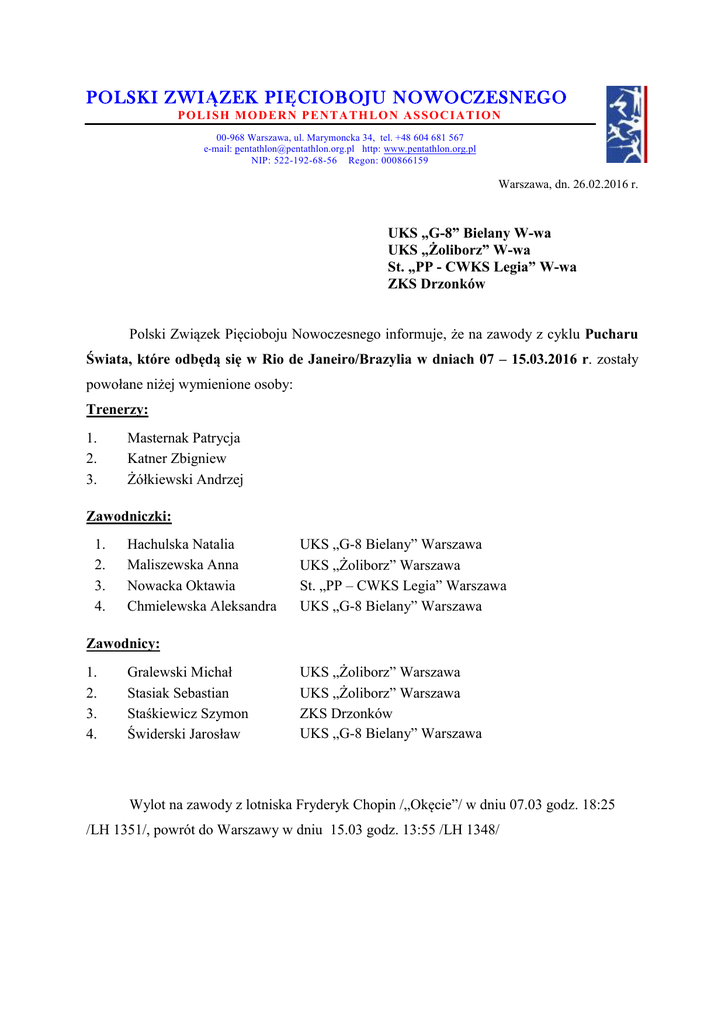 POLSKI ZWIĄZEK PIĘCIOBOJU NOWOCZESNEGO PO L I SH M O D ER N P E NT A TH LO N A S SO C I A T IO N 00-968 Warszawa, ul. Marymoncka 34, tel. +48 604 681 567 e-mail: [email protected] http: www.pentathlon.org.pl NIP: 522-192-68-56 Regon: 000866159 Warszawa, dn. 26.02.2016 r. UKS „G-8” Bielany W-wa UKS „Żoliborz” W-wa St. „PP - CWKS Legia” W-wa ZKS Drzonków Polski Związek Pięcioboju Nowoczesnego informuje, że na zawody z cyklu Pucharu Świata, które odbędą się w Rio de Janeiro/Brazylia w dniach 07 – 15.03.2016 r. zostały powołane niżej wymienione osoby: Trenerzy: 1. 2. 3. Masternak Patrycja Katner Zbigniew Żółkiewski Andrzej Zawodniczki: 1. 2. 3. 4. Hachulska Natalia Maliszewska Anna Nowacka Oktawia Chmielewska Aleksandra UKS „G-8 Bielany” Warszawa UKS „Żoliborz” Warszawa St. „PP – CWKS Legia” Warszawa UKS „G-8 Bielany” Warszawa Zawodnicy: 1. 2. 3. 4. Gralewski Michał Stasiak Sebastian Staśkiewicz Szymon Świderski Jarosław UKS „Żoliborz” Warszawa UKS „Żoliborz” Warszawa ZKS Drzonków UKS „G-8 Bielany” Warszawa Wylot na zawody z lotniska Fryderyk Chopin /„Okęcie”/ w dniu 07.03 godz. 18:25 /LH 1351/, powrót do Warszawy w dniu 15.03 godz. 13:55 /LH 1348/