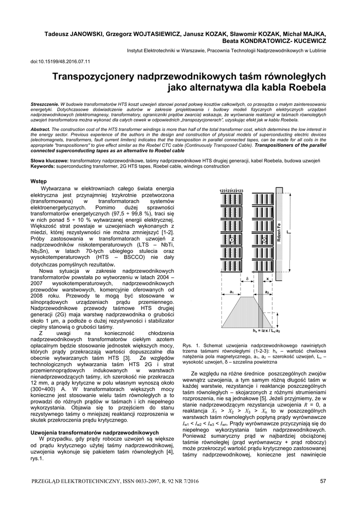 Tadeusz JANOWSKI, Grzegorz WOJTASIEWICZ, Janusz KOZAK, Sławomir KOZAK, Michał MAJKA, Beata KONDRATOWICZ- KUCEWICZ Instytut Elektrotechniki w Warszawie, Pracownia Technologii Nadprzewodnikowych w Lublinie doi:10.15199/48.2016.07.11 Transpozycjonery nadprzewodnikowych taśm równoległych jako alternatywa dla kabla Roebela Streszczenie. W budowie transformatorów HTS koszt uzwojeń stanowi ponad połowę kosztów całkowitych, co przesądza o małym zainteresowaniu energetyki. Dotychczasowe doświadczenie autorów w zakresie projektowania i budowy modeli fizycznych elektrycznych urządzeń nadprzewodnikowych (elektromagnesy, transformatory, ograniczniki prądów zwarcia) wskazuje, że wyrównanie reaktancji w taśmach równoległych uzwojeń transformatora można wykonać dla całych cewek w odpowiednich „transpozycjonerach”, uzyskując efekt jak w kablu Roebela. Abstract. The construction cost of the HTS transformer windings is more than half of the total transformer cost, which determines the low interest in the energy sector. Previous experience of the authors in the design and construction of physical models of superconducting electric devices (electromagnets, transformers, fault current limiters) indicates that the transposition in parallel connected tapes, can be made for all coils in the appropriate "transpositioners" to give effect similar as the Roebel CTC cable (Continuously Transposed Cable). Transpositioners of the parallel connected superconducting tapes as an alternative to Roebel cable Słowa kluczowe: transformatory nadprzewodnikowe, taśmy nadprzewodnikowe HTS drugiej generacji, kabel Roebela, budowa uzwojeń Keywords: superconducting transformer, 2G HTS tapes, Roebel cable, windings construction Wstęp Wytwarzana w elektrowniach całego świata energia elektryczna jest przynajmniej trzykrotnie przetworzona (transformowana) w transformatorach systemów elektroenergetycznych. Pomimo dużej sprawności transformatorów energetycznych (97,5 ÷ 99,8 %), traci się w nich ponad 5 ÷ 10 % wytwarzanej energii elektrycznej. Większość strat powstaje w uzwojeniach wykonanych z miedzi, której rezystywności nie można zmniejszyć [1-2]. Próby zastosowania w transformatorach uzwojeń z nadprzewodników niskotemperaturowych (LTS – NbTi, Nb3Sn), w latach 70-tych ubiegłego stulecia oraz wysokotemperaturowych (HTS – BSCCO) nie dały dotychczas pomyślnych rezultatów. Nowa sytuacja w zakresie nadprzewodnikowych transformatorów powstała po wytworzeniu w latach 2004 – 2007 wysokotemperaturowych, nadprzewodnikowych przewodów warstwowych, komercyjnie oferowanych od 2008 roku. Przewody te mogą być stosowane w silnoprądowych urządzeniach prądu przemiennego. Nadprzewodnikowe przewody taśmowe HTS drugiej generacji (2G) maja warstwę nadprzewodnika o grubości około 1 µm, a podłoże o dużej rezystywności i stabilizator cieplny stanowią o grubości taśmy. Z uwagi na konieczność chłodzenia nadprzewodnikowych transformatorów ciekłym azotem opłacalnym będzie stosowanie jednostek większych mocy, których prądy przekraczają wartości dopuszczalne dla obecnie wytwarzanych taśm HTS [3]. Ze względów technologicznych wytwarzania taśm HTS 2G i strat przemiennoprądowych indukowanych w warstwach nienadprzewodzących taśmy, ich szerokość nie przekracza 12 mm, a prądy krytyczne w polu własnym wynoszą około (300÷400) A. W transformatorach większych mocy konieczne jest stosowanie wielu taśm równoległych a to prowadzi do różnych prądów w taśmach i ich niepełnego wykorzystania. Objawia się to przejściem do stanu rezystywnego taśmy o mniejszej reaktancji rozproszenia w skutek przekroczenia prądu krytycznego. Uzwojenia transformatorów nadprzewodnikowych W przypadku, gdy prądy robocze uzwojeń są większe od prądu krytycznego użytej taśmy nadprzewodnikowej, uzwojenia wykonuje się pakietem taśm równoległych [4], rys.1. [ Rys. 1. Schemat uzwojenia nadprzewodnikowego nawiniętych trzema taśmami równoległymi (1-2-3): hx – wartość chwilowa natężenia pola magnetycznego, a1, a2 – szerokość uzwojeń, Lu – wysokość uzwojeń, δ – szczelina powietrzna Ze względu na różne średnice poszczególnych zwojów wewnątrz uzwojenia, a tym samym różną długość taśm w każdej warstwie, rezystancje i reaktancje poszczególnych taśm równoległych – skojarzonych z różnymi strumieniami rozproszenia, nie są jednakowe [5]. Jeżeli przyjmiemy, że w stanie nadprzewodzącym rezystancja uzwojenia R = 0, a reaktancja X1 > X2 > X3 > Xn to w poszczególnych warstwach taśm równoległych popłyną prądy wyrównawcze Iw1 < Iw2 < Iw3 < Iwn. Prądy wyrównawcze przyczyniają się do niepełnego wykorzystania taśm nadprzewodnikowych. Ponieważ sumaryczny prąd w najbardziej obciążonej taśmie równoległej (prąd wyrównawczy + prąd roboczy) może przekroczyć wartość prądu krytycznego zastosowanej taśmy nadprzewodnikowej, konieczne jest nawinięcie PRZEGLĄD ELEKTROTECHNICZNY, ISSN 0033-2097, R. 92 NR 7/2016 57 uzwojenia taśmą o większym prądzie krytycznym, co wpłynie na wzrost kosztu uzwojenia [6]. Wyrównanie reaktancji poszczególnych warstw uzwojenia, a tym samym eliminację prądów wyrównawczych, można uzyskać przez transpozycję taśm. W przypadku uzwojeń transformatorów konwencjonalnych wykonanie transpozycji nie stwarza większych trudności. Natomiast wykonanie „klasycznej” transpozycji taśm nadprzewodnikowych jest w zasadzie niemożliwe ze względu na ich właściwości mechaniczne oraz proporcje w szerokości i grubości taśmy. Kable Roebela Obecnie największe nadzieje na ograniczenie prądów wyrównawczych w uzwojeniach nadprzewodnikowych transformatorów wiąże się ze stosowaniem przewodu CTC (Continuously Transposed Cable) – kabla Reobela, o ciągłej transpozycji przewodu nadprzewodnikowego [7-8]. Idea tego kabla polega na odpowiednim ukształtowaniu i złożeniu (zapleceniu) pakietu równoleg