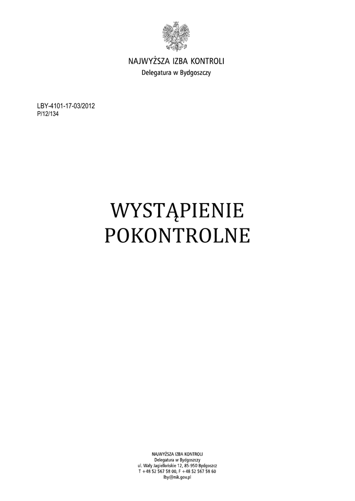 LBY-4101-17-03/2012 P/12/134 WYSTĄPIENIE POKONTROLNE I. Dane identyfikacyjne kontroli Numer i tytuł kontroli Jednostka przeprowadzająca kontrolę Kontroler Jednostka kontrolowana Kierownik jednostki kontrolowanej P/12/134 – Funkcjonowanie funduszy sołeckich Najwyższa Izba Kontroli Delegatura w Bydgoszczy Hanna Loch, starszy inspektor kontroli państwowej, upoważnienie do kontroli nr 080795 z dnia 12 lipca 2012 r.; Urząd Gminy Gruta, Gruta 244, 86-330 Mełno (dalej: „Urząd”) Halina Kowalkowska, Wójt Gminy Gruta [Dowód: akta kontroli str. 4-6] II. Ocena kontrolowanej działalności Ocena ogólna Uzasadnienie oceny ogólnej Najwyższa Izba Kontroli ocenia negatywnie1, funkcjonowanie funduszu sołeckiego w Gminie Gruta (dalej: „Gmina”). Negatywną ocenę uzasadnia przede wszystkim: – obliczenie i rozdysponowanie kwot środków funduszu sołeckiego (dalej: „fundusz”) przypadających wszystkim sołectwom w latach 2010-2012, – sfinansowanie ze środków funduszu w latach 2010-2012 dziewięciu przedsięwzięć, które nie zostały zgłoszone we wnioskach sołectw na łączną kwotę 23.221,46 zł, – wykonanie planowanych wydatków w kwotach wyższych od kwot wynikających z prawidłowego obliczenia, na podstawie wzoru określonego w art. 2 ust. 1 ustawy o funduszu sołeckim. I tak: w 2010 r. 4 sołectwa na łączną kwotę 11.312,69 zł, w 2011 r. 2 sołectwa na łączną kwotę 720,49 zł, – uzyskanie w związku z ww. nieprawidłowościami nienależnej refundacji z budżetu państwa części wydatków poniesionych z funduszu o kwotę 5.801,64 zł. Jako pozytywne NIK ocenia prawidłowe utworzenie funduszu sołeckiego oraz wykorzystanie jego środków przez jedenaście sołectw w latach 2011-2012 (I półrocze), na dwadzieścia cztery przedsięwzięcia w kwotach zgodnych z wnioskami złożonymi w terminie przez sołtysów. III. Opis ustalonego stanu faktycznego 1. Organizowanie funduszu sołeckiego 1.1. Tworzenie funduszu sołeckiego Opis stanu faktycznego Rada Gminy terminowo podjęła uchwały w sprawie wyodrębnienia funduszu sołeckiego w budżecie Gminy na lata 20102, 20113 i 20124, tj. odpowiednio Najwyższa Izba Kontroli stosuje 3-stopniową skalę ocen: pozytywna, pozytywna mimo stwierdzonych nieprawidłowości, negatywna. 1 3 do: 30 czerwca 2009 r., 31 marca 2010 r. i 31 marca 2011 r., zgodnie z art. 6 i art. 1 ust. 1 ustawy o funduszu sołeckim5. [Dowód: akta kontroli str. 7-13] Inicjatorem wyodrębnienia w budżecie Gminy funduszu w badanym okresie była Rada Gminy. [Dowód: akta kontroli str.7, 9, 11, 48] Wysokość funduszu (według uchwał budżetowych6) wynosiła: w 2010 r. – 222,5 tys. zł7, w 2011 r. – 246,6 tys. zł i w 2012 r. – 243,2 tys. zł. Rada Gminy nie korzystała z prawa zwiększenia wysokości środków funduszu ponad wysokość obliczoną na podstawie art. 2 ust. 1 ustawy o funduszu sołeckim. [Dowód: akta kontroli str. 14-23, 48] Uchwały w sprawie wyodrębnienia funduszu sołeckiego w budżecie Gminy na lata 2010 - 2012 przekazano Regionalnej Izbie Obrachunkowej w Bydgoszczy (oddział Toruń), dalej: „RIO” odpowiednio w dniach: 30.06.2009 r., 30.03.2010 r. i 09.03.2011 r., tj. w terminie określonym w art. 90 ust. 2 ustawy z dnia 8 marca 1990 r. o samorządzie gminnym8. RIO nie wskazywało naruszeń prawa przy wydaniu ww. uchwał. [Dowód: akta kontroli str.8, 10, 13, 50] Ustalone nieprawidłowości W zakresie tworzenia funduszu sołeckiego nie stwierdzono nieprawidłowości. 1.2. Rozdysponowanie środków funduszu sołeckiego na sołectwa Opis stanu faktycznego 1.2.1. W badanym okresie w Gminie funkcjonowało 17 jednostek pomocniczych – sołectw: Annowo, Boguszewo, Dąbrówka Królewska, Gołębiewko, Gruta, Jasiewo, Kitnowo, Mełno, Mełno Cukrownia, Nicwałd, Okonin, Orle, Pokrzywno, Plemięta, Salno, Słup, Wiktorowo, których statuty Rada Gminy ustaliła uchwałą z dnia 29 kwietnia 2003 r. [Dowód: akta kontroli str. 24-25] Informacje dla sołtysów o wysokości środków funduszu przypadających na dane sołectwo na rok 2010, 2011 i 2012 zostały sporządzane. W Urzędzie brak potwierdzeń terminowości ich wysłania do sołtysów. Skarbnik Gminy oświadczyła, że „Sołtysi otrzymywali informacje o wysokości środków na lata 2010, 2011 i 2012 w miesiącu lipcu poprzedzającego rok którego naliczenie dotyczyło. Informacje o wysokości środków zaplanowanych oraz wzór wniosku w sprawie określenia przeznaczenia środków funduszu wysyłane były listem zwykłym. W związku z powyższym w Urzędzie Gminy nie ma potwierdzenia wysłania listów”. Uchwała Rady Gminy Gruta Nr XXIII/133/09 z dnia 26 czerwca 2009 r. Uchwała Rady Gminy Gruta Nr XXVIII/165/10 z dnia 26 marca 2010 r. 4 Uchwała Rady Gminy Gruta Nr IV/21/11 z dnia 28 lutego 2011 r. 5 Ustawa z dnia 20 lutego 2009 r. o funduszu sołeckim (Dz. U. Nr 52, poz. 420 ze zm.). 6 Uchwały Rady Gminy Gruta: nr XXVII/156/09 z dnia 29 grudnia 2009 r. w sprawie uchwalenia budżetu Gminy Gruta na rok 2010, nr IV/13/11 z dnia 28 lutego 2011 r. w sprawie uchwalenia budżetu Gminy Gruta na rok 2011 i nr XI/65/11 z dnia 29 grudnia 2011 r. w sprawie uchwalenia budżetu Gminy Gruta na rok 2012. 7 Sołectwo Kitnowo nie złożyło wniosku i kwota naliczonego funduszu dla tego sołectwa (10,1 tys. zł) nie została ujęta w uchwale budżetowej na 2010 r. 8 Dz. U. z 2001 r. Nr 142, poz. 1591 ze zm. 2 3 4 [Dowód: akta kontroli str. 29] W okresie od 2009 r. do 28 lipca 2011 r. żadnemu pracownikowi nie określono odpowiedzialności za obliczenie wysokości funduszu sołeckiego. Skarbnikowi Gminy na podstawie zakresu obowiązków z dnia 29 lipca 2011 r. przypisano odpowiedzialność za „kontrolę i doradztwo w zakresie gospodarki finansowej jednostek podległych gminie w tym funduszu sołeckiego”. Od dnia 20 czerwca 2012 r. za „prowadzenie spraw księgowych związanych z obsługą funduszu sołeckiego” odpowiedzialna jest podinspektor ds. księgowości. [Dowód: akt