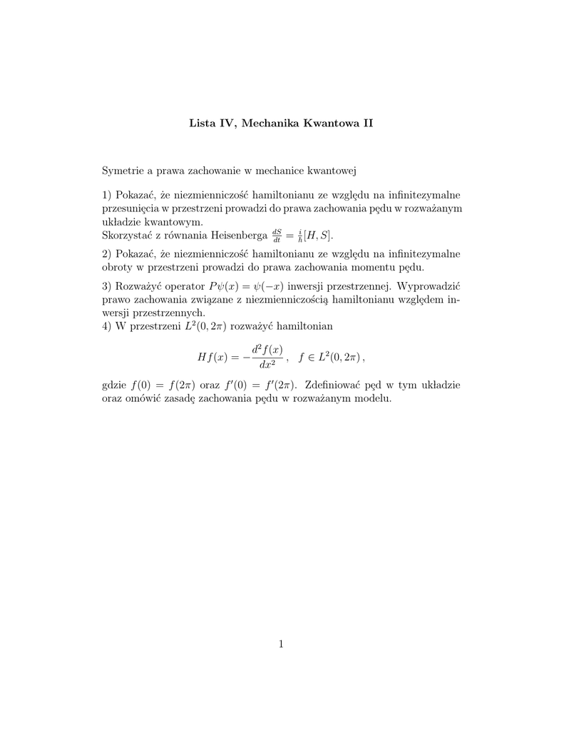 Lista IV, Mechanika Kwantowa II Symetrie a prawa zachowanie w mechanice kwantowej 1) Pokazać, że niezmienniczość hamiltonianu ze wzglȩdu na infinitezymalne przesuniȩcia w przestrzeni prowadzi do prawa zachowania pȩdu w rozważanym ukladzie kwantowym. Skorzystać z równania Heisenberga dS = ~i [H, S]. dt 2) Pokazać, że niezmienniczość hamiltonianu ze wzglȩdu na infinitezymalne obroty w przestrzeni prowadzi do prawa zachowania momentu pȩdu. 3) Rozważyć operator P ψ(x) = ψ(−x) inwersji przestrzennej. Wyprowadzić prawo zachowania zwia̧zane z niezmienniczościa̧ hamiltonianu wzglȩdem inwersji przestrzennych. 4) W przestrzeni L2 (0, 2π) rozważyć hamiltonian Hf (x) = − d2 f (x) , f ∈ L2 (0, 2π) , dx2 gdzie f (0) = f (2π) oraz f 0 (0) = f 0 (2π). Zdefiniować pȩd w tym ukladzie oraz omówić zasadȩ zachowania pȩdu w rozważanym modelu. 1