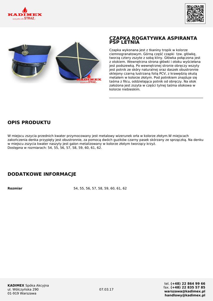 CZAPKA ROGATYWKA ASPIRANTA PSP LETNIA Czapka wykonana jest z tkaniny tropik w kolorze ciemnogranatowym. Górną część czapki tzw. główkę, tworzą cztery zszyte z sobą kliny. Główka połączona jest z otokiem. Wewnętrzna strona główki i otoku wyściełana jest podszewką. Po wewnętrznej stronie obręczy wszyty jest potnik ze skóry naturalnej oraz daszek obustronnie oklejony czarną lustrzaną folią PCV, z krawędzią okutą metalem w kolorze złotym. Pod potnikiem znajduje się taśma z filcu, oddzielająca potnik od obręczy. Na otok założona jest zszyta w części tylnej taśma otokowa w kolorze niebieskim. OPIS PRODUKTU W miejscu zszycia przednich kwater przymocowany jest metalowy wizerunek orła w kolorze złotym.W miejscach zakończenia denka przypięty jest obustronnie, za pomocą dwóch guzików czarny pasek skórzany ze sprzączką. Na denku w miejscu zszycia kwater naszyty jest galon metalizowany w kolorze złotym tworzący krzyż. Dostępna w rozmiarach: 54, 55, 56, 57, 58, 59, 60, 61, 62. DODATKOWE INFORMACJE Rozmiar KADIMEX Spóka Akcyjna ul. Wólczyńska 290 01-919 Warszawa 54, 55, 56, 57, 58, 59, 60, 61, 62 07.03.17 tel. (+48) 22 864 99 66 fax. (+48) 22 835 57 85 [email protected] [email protected]