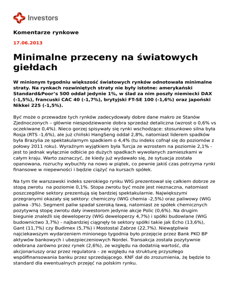 Komentarze rynkowe 17.06.2013 Minimalne przeceny na światowych giełdach W minionym tygodniu większość światowych rynków odnotowała minimalne straty. Na rynkach rozwiniętych straty nie były istotne: amerykański Standard&Poor’s 500 oddał jedynie 1%, w ślad za nim poszły niemiecki DAX (-1,5%), francuski CAC 40 (-1,7%), brytyjski FT-SE 100 (-1,6%) oraz japoński Nikkei 225 (-1,5%). Być może o przewadze tych rynków zadecydowały dobre dane makro ze Stanów Zjednoczonych – głównie niespodziewanie dobra sprzedaż detaliczna (wzrost o 0,6% vs oczekiwane 0,4%). Nieco gorzej spisywały się rynki wschodzące: stosunkowo silna była Rosja (RTS -1,6%), ale już chiński HangSeng oddał 2,8%, natomiast liderem spadków była Brazylia ze spektakularnym spadkiem o 4,4% (tu indeks cofnął się do poziomów z połowy 2011 roku). Wyraźnym wyjątkiem była Turcja ze wzrostem na poziomie 2,1% jest to jednak wyłącznie odbicie po dużych spadkach wywołanych zamieszkami w całym kraju. Warto zaznaczyć, że kiedy już wydawało się, że sytuacja została opanowana, rozruchy wybuchły na nowo w piątek, co pewnie jakiś czas potrzyma rynki finansowe w niepewności i będzie ciążyć na kursach spółek. Na tym tle warszawski indeks szerokiego rynku WIG prezentował się całkiem dobrze ze stopą zwrotu na poziomie 0,1%. Stopa zwrotu być może jest nieznaczna, natomiast poszczególne sektory prezentują się bardziej spektakularnie. Największymi przegranymi okazały się sektory: chemiczny (WIG chemia -2,5%) oraz paliwowy (WIG paliwa -3%). Segment paliw spadał szeroką ławą, natomiast ze spółek chemicznych pozytywną stopę zwrotu dały inwestorom jedynie akcje Polic (0,6%). Na drugim biegunie znaleźli się deweloperzy (WIG deweloperzy 4,7%) i spółki budowlane (WIG budownictwo 3,7%) - najbardziej ciągnęły te sektory spółki takie jak Echo (13,6%), Gant (11,7%) czy Budimex (5,7%) i Mostostal Zabrze (22,7%). Niewątpliwie najciekawszym wydarzeniem minionego tygodnia było przejęcie przez Bank PKO BP aktywów bankowych i ubezpieczeniowych Nordei. Transakcja została pozytywnie odebrana zarówno przez rynek (2,6%), ze względu na dodatnią wartość, dla akcjonariuszy oraz przez regulatora – ze względu na strukturę przyszłego współfinansowania banku przez sprzedającego. KNF dał do zrozumienia, żę będzie to standard dla ewentualnych przejęć na polskim rynku. W nadchodzącym tygodniu najistotniejsze informacje zza oceanu, to posiedzenie FED’u, natomiast lokalnie wygasanie kontraktów na warszawskiej giełdzie w przyszły piątek. Maciej Chudzik Zarządzający Funduszami Interesują Cię bieżące informacje o rynku akcji? Zapraszamy do zapoznania się z opiniami i prognozami zarządzających funduszami Investors TFI na temat rynku akcji. Komentarze rynku akcji