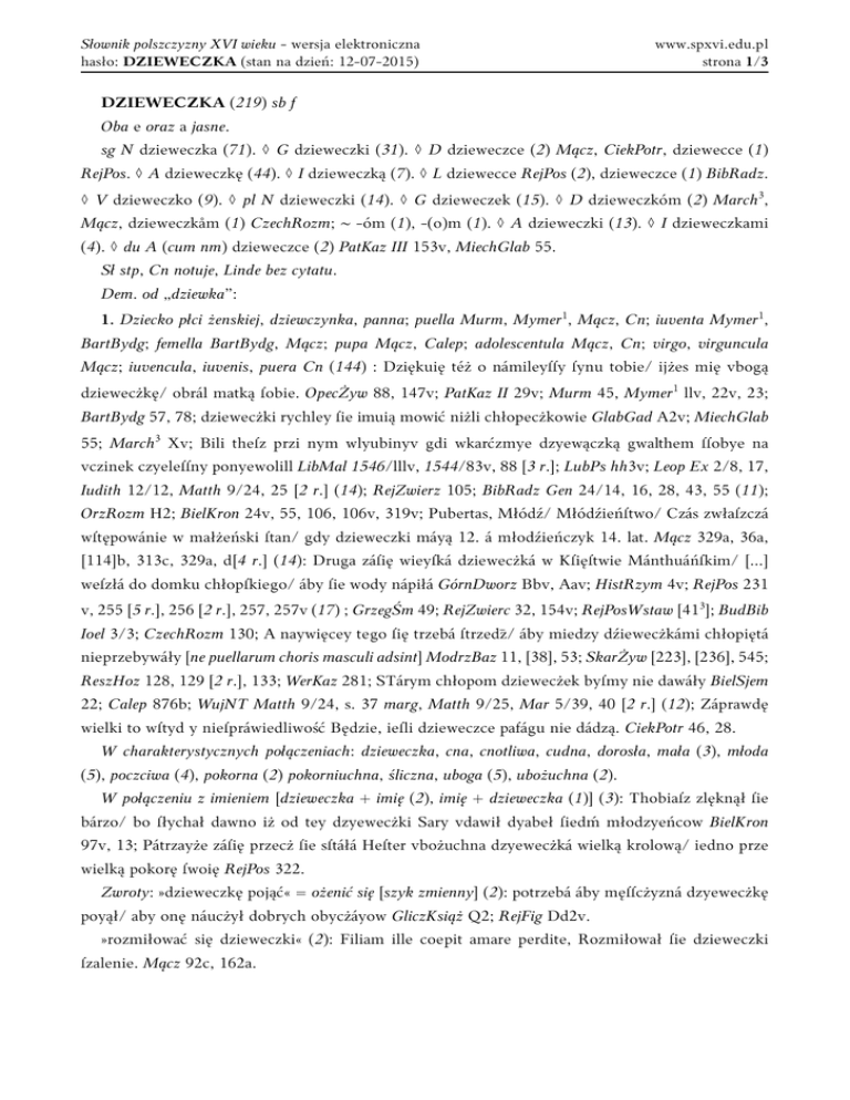 Słownik polszczyzny XVI wieku - wersja elektroniczna hasło: DZIEWECZKA (stan na dzień: 12-07-2015) www.spxvi.edu.pl strona 1/3 DZIEWECZKA (219) sb f Oba e oraz a jasne. sg N dzieweczka (71). ◊ G dzieweczki (31). ◊ D dzieweczce (2) Mącz, CiekPotr, dziewecce (1) RejPos. ◊ A dzieweczkę (44). ◊ I dzieweczką (7). ◊ L dziewecce RejPos (2), dzieweczce (1) BibRadz. ◊ V dzieweczko (9). ◊ pl N dzieweczki (14). ◊ G dzieweczek (15). ◊ D dzieweczkóm (2) March3, Mącz, dzieweczkåm (1) CzechRozm; ~ -óm (1), -(o)m (1). ◊ A dzieweczki (13). ◊ I dzieweczkami (4). ◊ du A (cum nm) dzieweczce (2) PatKaz III 153v, MiechGlab 55. Sł stp, Cn notuje, Linde bez cytatu. Dem. od „dziewka”: 1. Dziecko płci żenskiej, dziewczynka, panna; puella Murm, Mymer1, Mącz, Cn; iuventa Mymer1, BartBydg; femella BartBydg, Mącz; pupa Mącz, Calep; adolescentula Mącz, Cn; virgo, virguncula Mącz; iuvencula, iuvenis, puera Cn (144) : Dziękuię téż o námileyſſy ſynu tobie/ ijżes mię vbogą dziewecżkę/ obrál matką ſobie. OpecŻyw 88, 147v; PatKaz II 29v; Murm 45, Mymer1 llv, 22v, 23; BartBydg 57, 78; dziewecżki rychley ſie imuią mowić niżli chłopecżkowie GlabGad A2v; MiechGlab 55; March3 Xv; Bili theſz przi nym wlyubinyv gdi wkarćzmye dzyewączką gwalthem ſſobye na vczinek czyeleſſny ponyewolill LibMal 1546/lllv, 1544/83v, 88 [3 r.]; LubPs hh3v; Leop Ex 2/8, 17, Iudith 12/12, Matth 9/24, 25 [2 r.] (14); RejZwierz 105; BibRadz Gen 24/14, 16, 28, 43, 55 (11); OrzRozm H2; BielKron 24v, 55, 106, 106v, 319v; Pubertas, Młódź/ Młódźieńſtwo/ Czás zwłaſzczá wſtępowánie w małżeński ſtan/ gdy dzieweczki máyą 12. á młodźieńczyk 14. lat. Mącz 329a, 36a, [114]b, 313c, 329a, d[4 r.] (14): Druga záſię wieyſká dziewecżká w Kſięſtwie Mánthuáńſkim/ [...] weſzłá do domku chłopſkiego/ áby ſie wody nápiłá GórnDworz Bbv, Aav; HistRzym 4v; RejPos 231 v, 255 [5 r.], 256 [2 r.], 257, 257v (17) ; GrzegŚm 49; RejZwierc 32, 154v; RejPosWstaw [413]; BudBib Ioel 3/3; CzechRozm 130; A naywięcey tego ſię trzebá ſtrzedz/ áby miedzy dźiewecżkámi chłopiętá nieprzebywáły [ne puellarum choris masculi adsint] ModrzBaz 11, [38], 53; SkarŻyw [223], [236], 545; ReszHoz 128, 129 [2 r.], 133; WerKaz 281; STárym chłopom dziewecżek byſmy nie dawáły BielSjem 22; Calep 876b; WujNT Matth 9/24, s. 37 marg, Matth 9/25, Mar 5/39, 40 [2 r.] (12); Záprawdę wielki to wſtyd y nieſpráwiedliwość Będzie, ieſli dzieweczce pafágu nie dádzą. CiekPotr 46, 28. W charakterystycznych połączeniach: dzieweczka, cna, cnotliwa, cudna, dorosła, mała (3), młoda (5), poczciwa (4), pokorna (2) pokorniuchna, śliczna, uboga (5), ubożuchna (2). W połączeniu z imieniem [dzieweczka + imię (2), imię + dzieweczka (1)] (3): Thobiaſz zlęknął ſie bárzo/ bo ſłychał dawno iż od tey dzyewecżki Sary vdawił dyabeł ſiedḿ młodzyeńcow BielKron 97v, 13; Pátrzayże záſię przecż ſie sſtáłá Heſter vbożuchna dzyewecżká wielką krolową/ iedno prze wielką pokorę ſwoię RejPos 322. Zwroty: »dzieweczkę pojąć« = ożenić się [szyk zmienny] (2): potrzebá áby męſſcżyzná dzyewecżkę poyął/ aby onę náucżył dobrych obycżáyow GliczKsiąż Q2; RejFig Dd2v. »rozmiłować się dzieweczki« (2): Filiam ille coepit amare perdite, Rozmiłował ſie dzieweczki ſzalenie. Mącz 92c, 162a. Słownik polszczyzny XVI wieku - wersja elektroniczna hasło: DZIEWECZKA (stan na dzień: 12-07-2015) www.spxvi.edu.pl strona 2/3 »dzieweczkę zgwałcić; uczynić gwałt dzieweczce« ‒ inferre stuprum, stuprum virginis Mącz [szyk zmienny] (3 ; 1): Mącz 123c, 424a; A za nie pomniſz/ żeś pocżćiwą dziewecżkę zgwałćił/ y oicáś iey/ gdyć iey wziąć bronił/ zábił. GórnDworz S7 [idem] WerGośc 248. Wyrażenie: »dzieweczka Sunamitka, sunamicka« (1 : 1) przywiedzyono [Dawidowi] bárzo cudną dzyewecżkę Sunámicką/ imieniem Abiſág która go zágrzewáłá w łożnicy iego BielKron 73v; RejZwierc 127v. Szeregi: »chłopięta i dzieweczki« (1): Niechayże tedy tego pilnie pátrzą áby chłopiętá y dźiewecżki [ne pueri puellaeque]/ pirwſzych młodych lat ſwych niewiodły w proznowániu ModrzBaz 10v. »dzieweczki i mężatki« = puellae et matronae Modrz [szyk 1 : 1] (2): O nieſzcżęśliwe mężátki y dźiewecżki/ ktore ſię w tákowych ſchadzkách kocháią ModrzBaz 54v, 53. »młodzieńce, dzieweczki« (1): Społem táki ſtrách ogárnie młodzyeńce dzyewecżki/ Ludzi też wieku ſtárego y sſące dzyatecżki. LubPs gg5. »dzieweczka i (albo) niewiasta« ‒ puella et matrona Modrz [szyk 1 : 1] (2): Mącz 133a; Ludźie proznuiący [...] dźiewecżek y niewiaſt vcżćiwych pod zasłoną tańcu ábo iákiey inſzey gry do śiebie proſzą ModrzBaz 36v. »panie a dzieweczki« (1): iáko ony ſwięte pánie á pokorne dziewecżki záwżdy bywały w wielkiey zacnośći RejPos 322. »dzieweczka, (a, albo) panną (a. panienka)« — puella (et) virgo Vulg (6): Sluſalo tedy bylo yſz ynſza dzyeueczka panną yemu [Synowi Bożemu] matką laſky pelna byla ſtworzona PatKaz III 89v; á niech będą rozeſláni ktorzyby pátrzyli po wſſech źiemicách dziewecżek ſlicżnych/ á pánien Leop Esth 2/3, Esth 2/2; Mącz 424a, 499a; StryjKron 370. W przen (2) : Y owey cney dzyewecżki co chodzi w tym ſpołku/ Prawdy ſzkodá/ tá záwżdy w tey ſpráwie ná kołku. RejWiz 40; Wie to iuż każdy z nas/ iż Pan náſz á oblubieniec náſz káżdego wiernego ſwego dziewecżką ſwoią cżyſthą/ á wdzięcżną oblubienicą ſwoią zowie. RejAp 141. 2. Córka; filia Mącz (54) : Oto dzyeueczka począla ſyą wzyuoczye ſzwyątey anny PatKaz II 70, 43, 76 [2 r.], 81, 84v, 85; PatKaz III 99, 153v; O ſzaleni rodzicy ktorzy ták dzyáłáią/ Iż pocżćiwe dzyewecżki do tey klozy dáią. RejWiz 38v; Bo mali kto dziewecżkę/ v tey w pokoiu záchowáć nie może LeszczRzecz A4; Mącz 296c; RejPos 343. dzieweczka czyj