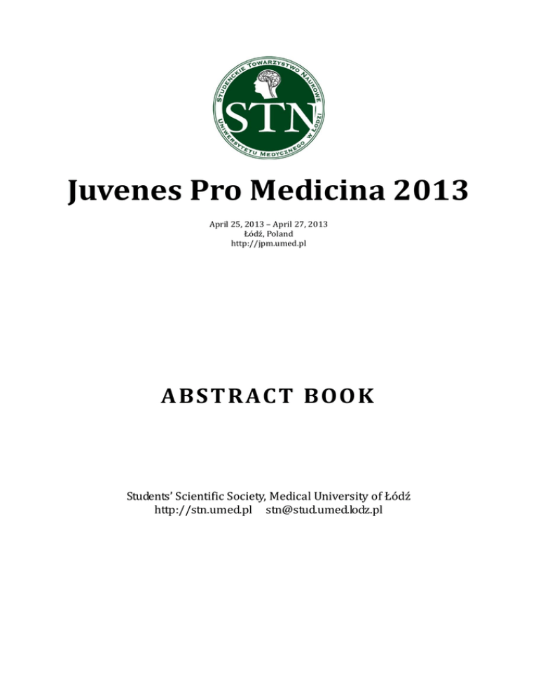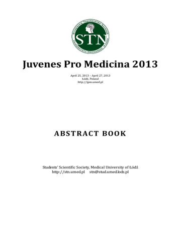 Juvenes Pro Medicina 2013 April 25, 2013 – April 27, 2013 Łódź, Poland http://jpm.umed.pl ABSTR ACT BOOK Students’ Scientific Society, Medical University of Łódź http://stn.umed.pl [email protected] WYDANE PRZEZ UNIWERSYTET MEDYCZNY W ŁODZI Kurator Studenckiego Towarzystwa Naukowego: prof.dr hab.n. med.Ewa Sewerynek Skład Zarządu STN: Przewodniczący: Ernest Bobeff Wiceprzewodniczący: Anna Kawińska, Wojciech Kuczyński Skarbnik: Justyna Dłubek Sekretarz: Aneta Gruchała Członkowie Zarządu: Alicja Strzałka, Konrad Stawiski ISBN: 978-83-62807-89-5 ADRES REDAKCJI: Studenckie Towarzystwo Naukowe al. Kościuszki 4 90-419 Łódź http://stn.umed.pl [email protected] DRUK I OPRAWA: Biuro Promocji i Wydawnictw Uniwersytetu Medycznego w Łodzi ul. Kopcińskiego 20 Table of Contents Conference Schedule .............................................................................. 4 Basic science .......................................................................................... 5 Cardiology ............................................................................................16 Emergency medicine & Orthopaedics .................................................30 Endocrinology ......................................................................................40 Gynaecology .........................................................................................55 History of Medicine and Paleopathology .............................................70 Internal medicine ................................................................................80 Neurology and Neurosurgery ........................................................... 101 Oncology ........................................................................................... 111 Ophthalmology & Otolaryngology ..................................................... 130 Paediatrics ........................................................................................ 141 Physiotherapy ................................................................................... 161 Public health ..................................................................................... 174 Skin disorders ................................................................................... 193 Surgery ............................................................................................. 204 Juvenes Pro Medicina 2013 – Abstract Book. http://jpm.umed.pl Conference Schedule SATURDAY Workshops: ECHO (April 27, 2013) 15:30-17:30 Workshops: Dermatologia – to nie tylko skóra 17:00 – 18:00 Registration 13:00 – 17:00 chirurgicznego 12:00 – 13:00 Workshops: Radiologia2 13:00-15:00 Workshops: Psychiatria 9:00 – 12:00 Public Health 13:00 – 16:00 History of Medicine & Paleopathology 13:00 – 17:00 9:00-11:00 Workshops: Kurs szycia Cardiology 16:00 – 19:00 13:00 – 16:00 Otolaryngology & Ophthalmology 13:00 – 16:00 Paediatrics 9:00 – 12:00 Gynaecology Neurology & Neurosurgery 17:00 – 19:00 9:00 – 12:00 13:00 – 16:00 Internal Medicine Emergency Medicine & Orthopaedics Basic science Skin Disorders 13:00 – 16:00 16:00 – 19:00 9:00 – 13:00 13:00 – 16:00 Physiotherapy Surgery Oncology Endocrinology 13:00 – 17:00 Workshops: Transplantacja szpiku 'od kuchni' Workshops at laboratories: Workshops: USG (April 22, 23, 24, 25 15:00) Workshops: Create your avatar - three-dimensional anthropometry laboratory. (FRIDAY 13:00 – 15:45) Workshops: Station of Sensations (FRIDAY 9:00-11:00) THURSDAY (April 25, 2013) Od objawu do rozpoznania – przegląd przypadków klinicznych. Wykład interaktywny dla osób zainteresowanych radiologią. 1 2 4 17:00 – 19:00 Closing Ceremony 13:00 – 15:00 18:00 – 20:00 Opening Ceremony 1.18 1.17 1.20 1.27 Sala Śniada -niowa FRIDAY (April 26, 2013) 21:00 - … Banquet T1 01.11 Room Juvenes Pro Medicina 2013 – Abstract Book. http://jpm.umed.pl Basic science Koordynatorzy: Aleksandra Duchowska, Adam Miller, Konrad Stawiski 5 Juvenes Pro Medicina 2013 – Abstract Book. http://jpm.umed.pl 1. Haraś Konrad, Gwóźdź Dorota, Choromańska Magdalena BADANIA NAD STOSOWANIEM PODKŁADÓW PODCZAS LECZENIA ZACHOWAWCZEGO NA UCZELNIACH MEDYCZNYCH W POLSCE/RESEARCH USING BASES AND LINERS DURING CONSERVATIVE TREATMENT ON MEDICAL UNIVERSITIES IN POLAND Uniwersytet Medyczny w Białymstoku, Studenckie Koło Naukowe przy Zakładzie Stomatologii Zachowawczej UMB Opiekun pracy/Tutor: dr n. med. Magdalena Choromańska Introduction: Continous progress in dental materials science, particulary dental materials for restoration hard tissues of the tooth, modifies indicate to use of bases and liners on bottom cavity. So far, there is no long-term clinical research and clear proposals on the use of filling materials without bases and liners. The question of relining denture bases for adults with hard tissues reconstruction remains open and is the subject of discussion in the dentist in Poland. Indications for use of bases and liners will evolve over time, which will undoubtedly contribute to the development of current knowledge and technological progress of dental materials science. Aim of study: Evaluation of the use of bases and liners during conservative treatment, among lecturer of Departments of Conservative Dentistry on medical schools in Poland. Material and methods: The research consisted of an anonymous questionnaire (23 questions), addressed to the lecturer of Departments of Conservative Dentistry on medical universities in Poland. The questionnaire except general information (such as gender, year and place of graduation, specialization) included questions about the procedure for relining during conservative treatment, selection criteria and indications of bases and liners for their application. Some of the questions contain issues concerning education about liners and bases at dental schools. The research involved 200 people. The data were analyzed statistically. Results: At this stage, t