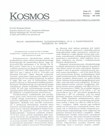 Kosmos PROBLEMY NAUK BIOLOGICZNYCH. Tom 47, 1998 Numer 1 (238) Strony 95-105 Polskie Towarzystwo Przyrodników im. Kopernika PIOTR ROBAKOWSKI Katedra Hodowli Lasu, Akademia Rolnicza Wojska Polskiego 69, 60-625 Poznań E-mail: [email protected] WPŁYW PROMIENIOWANIA ULTRAFIOLETOWEGO UV-B O PODWYŻSZONYM NATĘŻENIU NA ROŚLINY PROMIENIOWANIE ULTRAFIOLETOWE W WIDMIE SŁONECZNYM I CZYNNIKI WPŁYWAJĄCE NA JEGO NATĘŻENIE PRZY POWIERZCHNI ZIEMI Promieniowanie ultrafioletowe należy do krótkofalowej części widma światła słonecznego docierającego do powierzchni Ziemi. Jego od krywcami byli niezależnie J. W. R it t e r i W. H. W o l l a s t o n . Dzieli się je na cztery podzakresy: nadfiolet próżniowy (o długości fali do 200 nm), zakres C (UV-C, 200-280 nm), zakres B (UV-B, 280-315 nm) i zakres A (UV-A, 315-400 nm) (S ł o w n ik F iz y c z n y 1984). Obecnie większość autorów opracowań dotyczących wpływu pro mieniowania UV na rośliny przyjmuje, że zakres B sięga 320 nm; jest to jednocześnie dolna granica zakresu A. Sztucznym źródłem promie niowania ultrafioletowego są najczęściej lampy wyładowcze, przede wszystkim rtęciowe (kwarcówki). W celu jego wyodrębnienia stosuje się specjalne filtry absorpcyjne pochłaniające świa tło widzialne i promieniowanie podczerwone. Promieniowanie nadfioletowe jest pochła niane przez wiele elementów budowy komórek i dzięki swojej stosunkowo wysokiej energii aktywnie oddziałuje na przebieg procesów bio logicznych. Znalazło więc szerokie zastosowa nie w medycynie (sterylizacja, leczenia wielu schorzeń manifestujących się zmianami skór nymi) oraz w różnych dziedzinach badań biolo gicznych. Na przykład UV-C jest letalne dla drobnoustrojów i komórek naskórka ssaków. UV-B jest znane przede wszystkim jako przy czyna tworzenia się opalenizny ludzkiej skóry, ale ma też właściwości rakotwórcze i oddziałuje na procesy życiowe roślin. UV-A natomiast mo że powodować kataraktę i fotouczulenie skóry, bierze także udział w procesach fitomorfogene- zy. Obecnie dość dobrze poznany jest wpływ UV-B na bakterie, zwierzęta i człowieka oraz na wiele gatunków roślin uprawnych. Jednak nie wiele wiadomo w jaki sposób wzrost jego natę żenia, powodowany redukcją grubości warstwy ozonowej w stratosferze, może wpływać na ro śliny, zwłaszcza na drzewa i funkcjonowanie leśnych ekosystemów. Natężenie promieniowania ultrafioletowego w świetle słonecznym docierającym do powierz chni Ziemi zależy od wielu czynników. Najistot niejsze z nich to grubość stratosferycznej war stwy ozonu (stratosfera — od 15 do około 50 km nad powierzchnią Ziemi), pochłaniającej dużą część promieniowania ultrafioletowego, kąt pa dania promieni słonecznych na powierzchnię Ziemi, zależny od szerokości geograficznej i pory roku, oraz warunki meteorologiczne. W warun kach leśnych trzeba również uwzględnić skle pienie koron drzew pełniące rolę filtra (P u c h a l s k i i P r u s in k ie w ic z 1990). Na przykład dzienna dawka promieniowania UV-B rośnie o 47° po przesunięciu się z 40° szerokości geograficznej północnej o 20° na południe, przy tej samej grubości warstwy ozonowej (C a l d w e l l i współ aut. 1989). Natężenie promieniowania ultra fioletowego rośnie wraz z wysokością nad pozio mem morza o około 14-18% na 1000 m (C a l d w e l l i współaut. 1989), chociaż jego wielkość zależy też od azymutu i nachylenia stoku. Zna czącą rolę w zwiększaniu dawki natężenia pro mieniowania rozproszonego może odgrywać też pokrywa śnieżna (C a l d w e l l i współaut. 1980). Dodatkowymi, bardzo zmiennymi czynnikami są: zachmurzenie, obecność aerozoli w atmosfe rze, a także stężenie ozonu troposferycznego (troposfera — do około 15 km nad powierzchnią Ziemi). Odpowiednio wysokie stężenie tego ostatniego może w pewnym stopniu „masko 96 w a ć ” u b y te k w a r s t w y o zo n o w e j P io tr R o b ako w ski (M c K e n z ie i w s p ó ła u t. 199 1). U r z ą d z e n ia m ie rz ą c e n a tę ż e n ie U V -B (s p e k tro ra d io m e try ) in s ta lo w a n e są c z ę s to w d u ż y c h m ia s ta c h , g d z ie p a n u je s to s u n k o w o w y s o k a k o n c e n tr a c ja o zo n u i z a n ie c z y s z czeń p o w ie tr z a w p o r ó w n a n iu z te r e n e m o tw a r tym . M o ż e m ie ć to is t o tn y w p ły w n a w y n ik i p o m ia ró w . Zmiany w ilości UV-B docierającego do po wierzchni Ziemi mają charakter zmian global nych ze względu na skalę i częstość występowa nia obniżonej grubości warstwy ozonowej w stratosferze, czyli „dziur ozonowych”, powodu jących wzrost natężenia promieniowania ultra fioletowego. Zjawisko „dziury ozonowej” nad Antarktyką odkrył J.C. Farman w 1985 r. po twierdzając w ten sposób przypuszczenia G. M. B. Dobsona, który przewidywał jej istnienie trzydzieści lat wcześniej. Wyniki pomiarów po kazują, że warstwa ozonu zmniejsza się i można przypuszczać, że jest to trwała tendencja, nie zależna od naturalnych wahań (N ie d z ie l s k i , G ie r c z a k 1992; D z ie w u l s k a -Ł o s io w a , H r y n ie w ic z 1993). Ozon stratosferyczny, w przeciwień stwie do troposferycznego, pełni kluczową rolę w utrzymaniu życia na Ziemi. Jego cienka war stwa tworzy płaszcz ochronny, który osłania biosferę przed śmiertelnymi promieniami ultra fioletowymi. Spełnia ona rolę „sita spektralne go”, które wyłapuje promieniowanie o długości fali poniżej 3 0 0 nm (C a l d w e l l i współaut. 1989). Nawet bardzo mała ilość ozonu wystarcza, żeby zatrzymać promieniowanie z zakresu ultrafiole tu C, które jest najbardziej niebezpieczne dla życia. Promieniowanie UV-C jest praktycznie całkowicie absorbowane przez warstwę ozono wą. UV-B jest tylko częściowo absorbowany przez ozon stratosferyczny. Obliczono, że 10 % redukcja ozonu stratosferycznego powoduje 20 % wzrost natężen