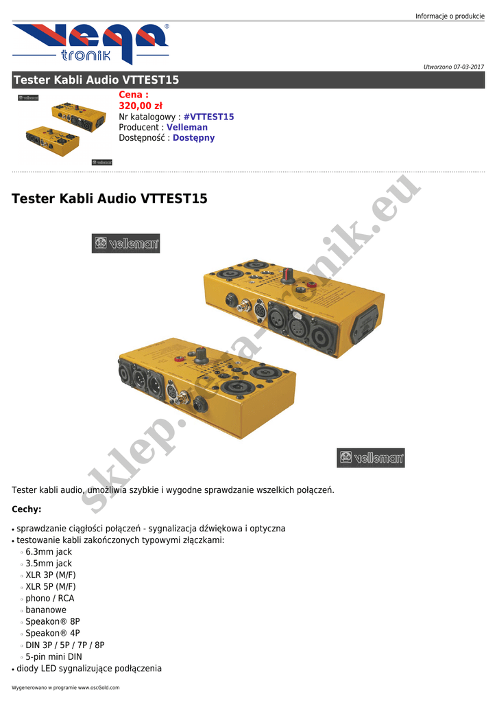 Informacje o produkcie Utworzono 07-03-2017 Tester Kabli Audio VTTEST15 Cena : 320,00 zł eu Nr katalogowy : #VTTEST15 Producent : Velleman Dostępność : Dostępny sk le p. ve g atr on i k. Tester Kabli Audio VTTEST15 Tester kabli audio, umożliwia szybkie i wygodne sprawdzanie wszelkich połączeń. Cechy: ● ● sprawdzanie ciągłości połączeń - sygnalizacja dźwiękowa i optyczna testowanie kabli zakończonych typowymi złączkami: 6.3mm jack 3.5mm jack XLR 3P (M/F) XLR 5P (M/F) phono / RCA bananowe Speakon® 8P Speakon® 4P DIN 3P / 5P / 7P / 8P 5-pin mini DIN diody LED sygnalizujące podłączenia ❍ ❍ ❍ ❍ ❍ ❍ ❍ ❍ ❍ ❍ ● Wygenerowano w programie www.oscGold.com eu k. ● on i ● atr ● ve g ● 9-pozycyjny przełącznik wyboru złączy łatwa wymiana baterii trwała, metalowa obudowa w zestawie komplet przewodów testowych zasilanie - bateria 9V (6LR61C) wymiary 190 x 60 x 110mm p. ● sk le ●