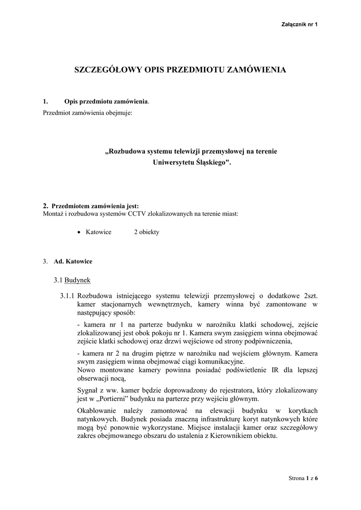 Załącznik nr 1 SZCZEGÓŁOWY OPIS PRZEDMIOTU ZAMÓWIENIA 1. Opis przedmiotu zamówienia. Przedmiot zamówienia obejmuje: „Rozbudowa systemu telewizji przemysłowej na terenie Uniwersytetu Śląskiego". 2. Przedmiotem zamówienia jest: Montaż i rozbudowa systemów CCTV zlokalizowanych na terenie miast: Katowice 2 obiekty 3. Ad. Katowice 3.1 Budynek 3.1.1 Rozbudowa istniejącego systemu telewizji przemysłowej o dodatkowe 2szt. kamer stacjonarnych wewnętrznych, kamery winna być zamontowane w następujący sposób: - kamera nr 1 na parterze budynku w narożniku klatki schodowej, zejście zlokalizowanej jest obok pokoju nr 1. Kamera swym zasięgiem winna obejmować zejście klatki schodowej oraz drzwi wejściowe od strony podpiwniczenia, - kamera nr 2 na drugim piętrze w narożniku nad wejściem głównym. Kamera swym zasięgiem winna obejmować ciągi komunikacyjne. Nowo montowane kamery powinna posiadać podświetlenie IR dla lepszej obserwacji nocą, Sygnał z ww. kamer będzie doprowadzony do rejestratora, który zlokalizowany jest w „Portierni” budynku na parterze przy wejściu głównym. Okablowanie należy zamontować na elewacji budynku w korytkach natynkowych. Budynek posiada znaczną infrastrukturę koryt natynkowych które mogą być ponownie wykorzystane. Miejsce instalacji kamer oraz szczegółowy zakres obejmowanego obszaru do ustalenia z Kierownikiem obiektu. Strona 1 z 6 Załącznik nr 1 3.1.2 Instalacja nowego systemu telewizji przemysłowej, polegającego na montażu 9szt. kamer stacjonarnych do użytku wewnętrznego, 16 kanałowego rejestratora z dyskiem HDD co najmniej 2TB, monitora LCD 19”,kompletnej infrastruktury kablowej. Rejestrator wraz z monitorem powinien być zamontowany w pomieszczeniu „BMS”, zlokalizowanej na parterze budynku. Kamery winny być zamontowane w nasypujący sposób - kamera nr 1, 2, 3 na parterze budynku od strony wejścia głównego, zlokalizowanego obok szatni. Kamery swym zasięgiem winny obserwować obszar szafek skrytkowych, - kamera nr 4 na I piętrze, w pomieszczeniu „Mediateca” zakres pola widzenia kamery winien obejmować stanowiska komputerowe umieszczone w centralnym miejscu pokoju, - kamera nr 5, 6, 7, 8 na I oraz II piętrze zakres kamer swym zasięgiem winien obserwować ogólnodostępne stanowiska komputerowe (2szt, kamer na piętro), - kamera nr 9 na II Pietrze z ogólnym rzutem pomieszczenia „Czytelnia prasy bieżącej”. Nowo montowana kamera powinna posiadać podświetlenie IR dla lepszej obserwacji nocą Obiekt posiada odpowiednią infrastrukturę do zainstalowania nowego okablowania, w miejscach widocznych przewody należy umieścić w korytach natynkowych Miejsce instalacji kamer oraz szczegółowy zakres obejmowanego obszaru do ustalenia z Kierownikiem obiektu. W celu uzyskania szczegółowych informacji zaleca się oferentom wizję lokalna na terenie obiektu. Czas realizacji zamówienia 14 dni od daty podpisania umowy. Strona 2 z 6 Załącznik nr 1 Wykonawca zobowiązany jest do przeprowadzenia bezpłatnych czynności konserwacyjnych nowo zainstalowanych systemów zabezpieczenia technicznego w okresie gwarancji oraz rękojmi, tzn. przeprowadzi cztery konserwacje w okresie gwarancji oraz jedną konserwację w okresie rękojmi. 1. Wykonawca przeprowadzi czynności konserwacyjne, o których mowa w ust. 7 zgodnie z normą PN-93/E-08930/14 („Systemy Alarmowe. Zasady Stosowania" - punkt nr 9 „Konserwacja") i dokona każdorazowo 1) sprawdzenia poprawności działania wszystkich czujek, łącznie z urządzeniami uruchamianymi ręcznie, 2) sprawdzenia stanu technicznego wszystkich połączeń giętkich, 3) sprawdzenia czy zasilacze główne i rezerwowe pracują i są sprawne, pomiaru prądu ładowania akumulatorów, 4) sprawdzenia centrali i jej obsługi zgodnie z procedurą zakładu instalacji alarmowych, 5) sprawdzenia poprawności działania każdego urządzenia transmisji alarmu przy współpracy z odpowiedzialną władzą lub zainteresowanym centrum odbiorczym, 6) sprawdzenia poprawności działania każdego sygnalizatora alarmowego, 7) sprawdzenia czy system alarmowy jest całkowicie w stanie gotowości do pracy. 8) pomiaru napięcia każdego akumulatora w trakcie pracy awaryjnej (w przypadku dużych, gwałtownych spadków napięcia świadczących o złym stanie technicznym akumulatora wnioskować o jego wymianę), 9) czyszczenia soczewek czujek, czytników kart zbliżeniowych, sygnalizatorów alarmowych, 10) czyszczenia obudów central, zasilaczy, 11) aktualizacji oprogramowania w centralach alarmowych, kontroli dostępu. 2. Fakt przeprowadzenia czynności konserwacyjnych odnotowany powinien być do książki „konserwacji i napraw" Zamawiającego. Strona 3 z 6 Załącznik nr 1 WYKAZ SPRZĘTU DO ZAINSTALOWANIA 3. Ad. Katowice 3.1 Budynek 3.1.1 Kamera kopułowa z podświetleniem IR Kamera tubowa analogowa z regulowanym promiennikiem podczerwieni minimum. do 20 metrów Obiektyw zmiennoogniskowy w zakresie pracy 2.8 mm Przetwornik minimum 1/3" SONY CMOS 2.0 Mpx Transmisja z prędkością 25/ kl/s przy 1080p Szyba dzielona z kołnierzem oddzielającym promiennik od obiektywu Max. rozdzielczość 1080p Full HD – rozdzielczość 1920 × 1080 px Uchwyt 3D Funkcja dualna mechaniczny filtr Funkcja poprawiająca dynamikę kamery Funkcje (cyfrowa redukcja szumów), (kontrola wzmocnienia), Kolor obudowy: grafitowy Zasilacz z akumulatorem Nie mniej jak 17Ah/12V Transformatorki BNC-UTP Okablowanie Koryta natynkowe Materiały instalacyjne i pomocnicze Strona 4 z 6 Załącznik nr 1 3.1.2 Rejestrator 16- kanałowy (analogowy) Wejścia kamerowe 16x SD & HD-TVI BNC (maks. 1080p) + 2x IP (maks. 1080p) Nagrywanie maks. 25kl./sek. na kanał w 720p Pojemność dysków maks. 2x HDD 4TB Wyjścia wideo minimum 1x HDMI, 1x VGA Port telemetrii RS-485: sterowanie kamerami PTZ Porty audio minimum 4x Wejście RCA, 1x Wyjście RCA Obsługa urządzeń minimum mysz USB, pilot IR, sieć 1xRJ45 Podgląd ze strony WWW: IE, FireFox,