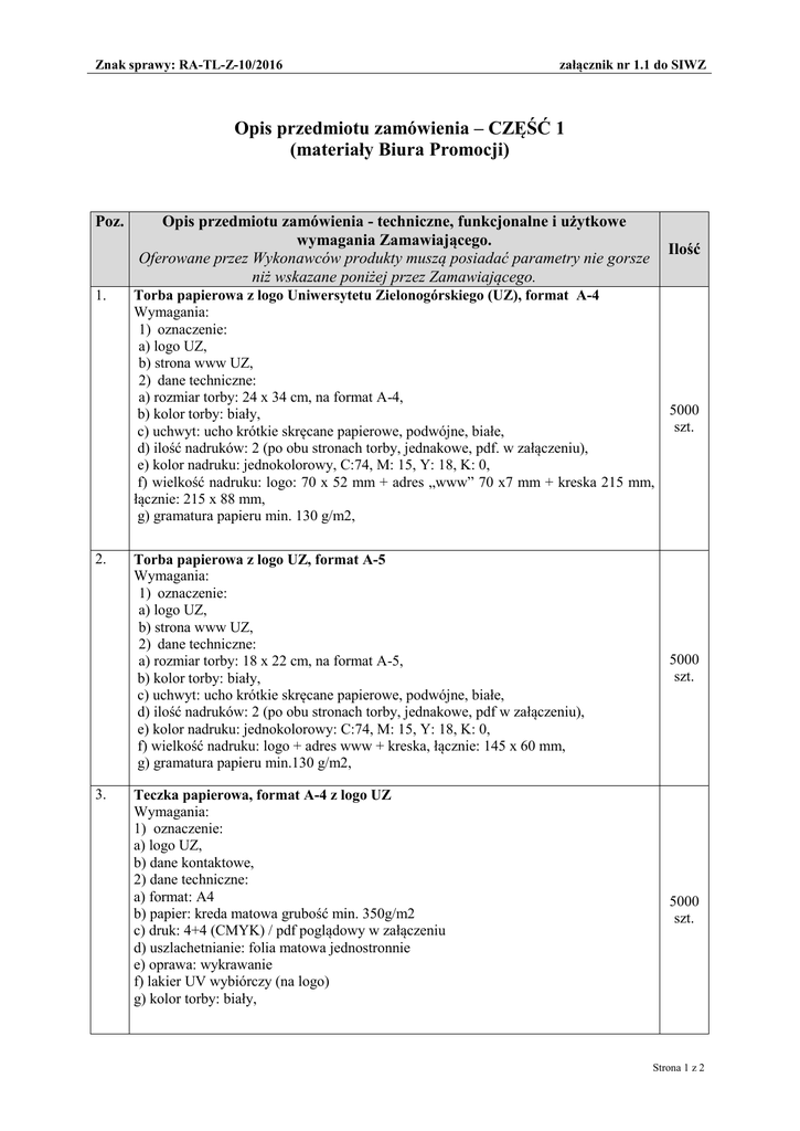 Znak sprawy: RA-TL-Z-10/2016 załącznik nr 1.1 do SIWZ Opis przedmiotu zamówienia – CZĘŚĆ 1 (materiały Biura Promocji) Poz. 1. 2. 3. Opis przedmiotu zamówienia - techniczne, funkcjonalne i użytkowe wymagania Zamawiającego. Oferowane przez Wykonawców produkty muszą posiadać parametry nie gorsze niż wskazane poniżej przez Zamawiającego. Ilość Torba papierowa z logo Uniwersytetu Zielonogórskiego (UZ), format A-4 Wymagania: 1) oznaczenie: a) logo UZ, b) strona www UZ, 2) dane techniczne: a) rozmiar torby: 24 x 34 cm, na format A-4, b) kolor torby: biały, c) uchwyt: ucho krótkie skręcane papierowe, podwójne, białe, d) ilość nadruków: 2 (po obu stronach torby, jednakowe, pdf. w załączeniu), e) kolor nadruku: jednokolorowy, C:74, M: 15, Y: 18, K: 0, f) wielkość nadruku: logo: 70 x 52 mm + adres „www” 70 x7 mm + kreska 215 mm, łącznie: 215 x 88 mm, g) gramatura papieru min. 130 g/m2, Torba papierowa z logo UZ, format A-5 Wymagania: 1) oznaczenie: a) logo UZ, b) strona www UZ, 2) dane techniczne: a) rozmiar torby: 18 x 22 cm, na format A-5, b) kolor torby: biały, c) uchwyt: ucho krótkie skręcane papierowe, podwójne, białe, d) ilość nadruków: 2 (po obu stronach torby, jednakowe, pdf w załączeniu), e) kolor nadruku: jednokolorowy: C:74, M: 15, Y: 18, K: 0, f) wielkość nadruku: logo + adres www + kreska, łącznie: 145 x 60 mm, g) gramatura papieru min.130 g/m2, Teczka papierowa, format A-4 z logo UZ Wymagania: 1) oznaczenie: a) logo UZ, b) dane kontaktowe, 2) dane techniczne: a) format: A4 b) papier: kreda matowa grubość min. 350g/m2 c) druk: 4+4 (CMYK) / pdf poglądowy w załączeniu d) uszlachetnianie: folia matowa jednostronnie e) oprawa: wykrawanie f) lakier UV wybiórczy (na logo) g) kolor torby: biały, 5000 szt. 5000 szt. 5000 szt. Strona 1 z 2 Znak sprawy: RA-TL-Z-10/2016 4. 5. 6. 7. załącznik nr 1.1 do SIWZ Smycze z nadrukiem full color Wymagania: 1) oznaczenie: nadruk wg załączonego projektu, w tym: a) logo UZ, b) strona www UZ, 2) dane techniczne: a) format: szerokość: min.1,5 cm, b) kolor: 4+4 CMYK, c) akcesoria: karabińczyk 1000 szt. Długopisy metalowe z logo UZ, kolor: turkusowy Wymagania: 1) oznaczenie: nadruk metodą grawera laserowego wg załączonego projektu, w tym: a) logo UZ, b) strona www UZ, 2) wyposażony w duży wkład piszący na niebiesko 3) dane techniczne: a) materiał długopisu: metalowy b) chromowane wykończenia i smukły klip c) kolor długopisu: turkusowy, d) kolor nadruku: jednokolorowy e) wielkość nadruku: 8 x 25 mm 5000 szt. Pamięć USB z łańcuszkiem Wymagania: 1) oznaczenie: a) logo UZ, b) strona www UZ, 2) wyposażony w łańcuszek 3) dane techniczne: a) materiał: metal b) kolor: V3075-32/CN, Kod koloru: V3075-32/CN c) wymiary: 5 x 0,9 x 0,4 cm d) kolor nadruku: jednokolorowy, z jednej strony pendriva, e) wielkość nadruku: 8 x 25 mm f) pojemność: min 16 GB, 200 szt. Długopis wysokiej klasy np. Parker lub równoważny Wymagania: 1) oznaczenie: nadruk wg załączonego projektu, w tym: a) logo UZ, b) strona www UZ, 2) wyposażony w duży wkład piszący na niebiesko, grubość pisma: cienka - 0,8mm, 3) dane techniczne: a) materiał długopisu: lakierowany korpus z sztucznej żywicy + stalowe wykończenia b) kolor długopisu: biały, c) kolor nadruku: jednokolorowy, srebrny d) wielkość nadruku: 8 x 25 mm e) z zastosowaniem mechanizmu przyciskowego w skuwce oraz mechanizmu sprężynowy na przycisk, 4) 5) każdy długopis opakowany w pudełko z logo producenta 200 szt. Strona 2 z 2