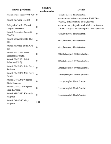 Sztuk w Nazwa produktu opakowaniu Kubek Wodospady CM-050 0 Kubek Karpacz CM-02 Pokrywka kubka Zamek Chojnik W60100 Kubek Grzaniec Sudecki CM-051 Kubek Wang/Śnieżka CM066 Kubek Karpacz Sepia CM132 Kubek EM-C065 Mini Szklarska Poręba Kubek EM-C071 Mini Polanica-Zdrój Kubek EM-C054 Min Góry Stołowe Kubek EM-C053 Min Góry Sowie Kubek CY-C006 Wnętrze Białe Karpacz Kubek CY-C018 Wnętrze Brąz Karpacz Kubek MX-C017 Kartonik Karpacz Kubek SG-D560 Mały Karpacz 0 0 Detale 4szt/komplet; 48szt/karton ceramiczny kubek z napisem: ŚNIEŻKA; WANG, 4szt/komplet; 48szt/karton ceramiczna pokrywka na kubek z motywem Zamku Chojnik, 4szt/komplet; 144szt/karton 0 4szt/komplet; 48szt/karton 0 6szt/komplet; 48szt/karton 0 4szt/komplet; 48szt/karton 0 20szt./komplet 400szt./karton 0 20szt./komplet 400szt./karton 0 20szt./komplet 400szt./karton 0 20szt./komplet 400szt./karton 0 1szt./komplet 36szt./karton 0 1szt./komplet 36szt./karton 0 1szt./komplet 36szt./karton 144