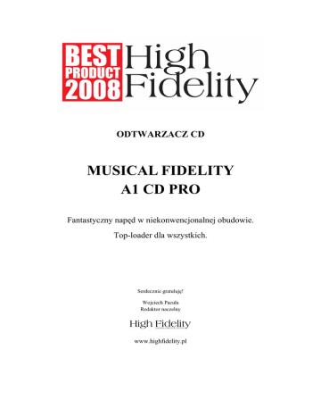 ODTWARZACZ CD MUSICAL FIDELITY A1 CD PRO Fantastyczny napęd w niekonwencjonalnej obudowie. Top-loader dla wszystkich. Serdecznie gratuluję! Wojciech Pacuła Redaktor naczelny www.highfidelity.pl