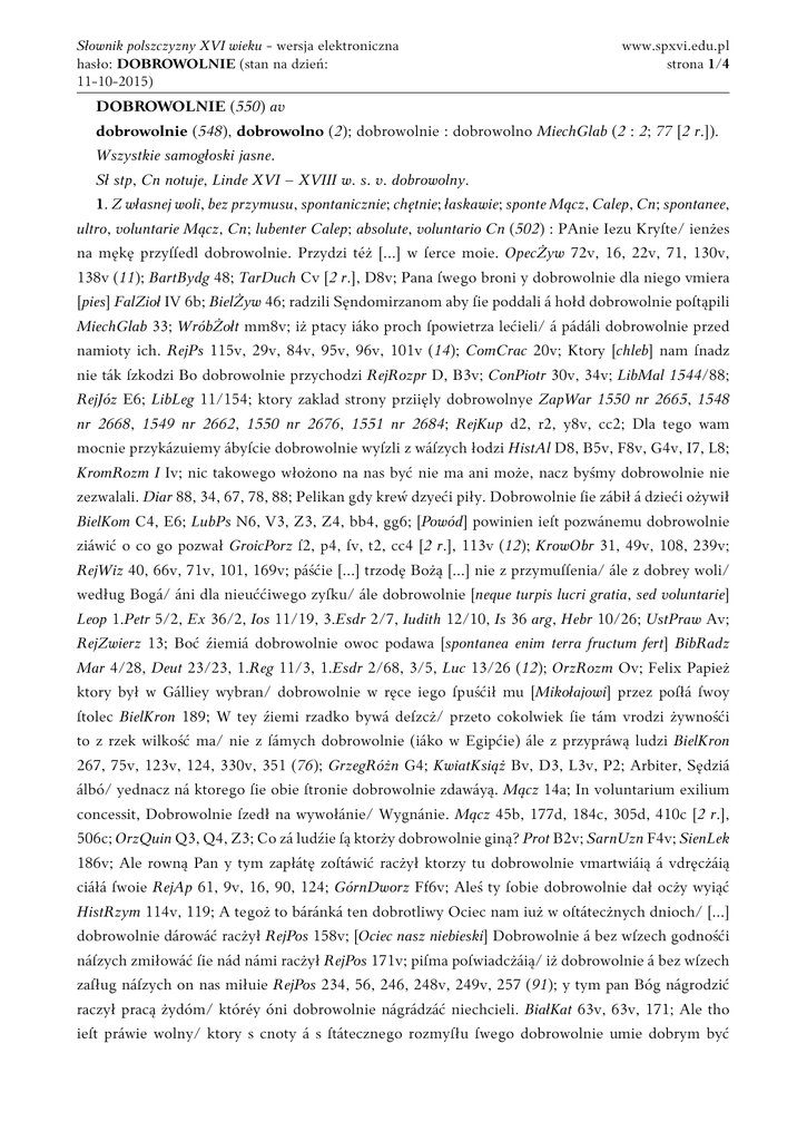 Słownik polszczyzny XVI wieku - wersja elektroniczna hasło: DOBROWOLNIE (stan na dzień: 11-10-2015) www.spxvi.edu.pl strona 1/4 DOBROWOLNIE (550) av dobrowolnie (548), dobrowolno (2); dobrowolnie : dobrowolno MiechGlab (2 : 2; 77 [2 r.]). Wszystkie samogłoski jasne. Sł stp, Cn notuje, Linde XVI – XVIII w. s. v. dobrowolny. 1. Z własnej woli, bez przymusu, spontanicznie; chętnie; łaskawie; sponte Mącz, Calep, Cn; spontanee, ultro, voluntarie Mącz, Cn; lubenter Calep; absolute, voluntario Cn (502) : PAnie Iezu Kryſte/ ienżes na mękę przyſſedl dobrowolnie. Przydzi téż [...] w ſerce moie. OpecŻyw 72v, 16, 22v, 71, 130v, 138v (11); BartBydg 48; TarDuch Cv [2 r.], D8v; Pana ſwego broni y dobrowolnie dla niego vmiera [pies] FalZioł IV 6b; BielŻyw 46; radzili Sęndomirzanom aby ſie poddali á hołd dobrowolnie poſtąpili MiechGlab 33; WróbŻołt mm8v; iż ptacy iáko proch ſpowietrza lećieli/ á pádáli dobrowolnie przed namioty ich. RejPs 115v, 29v, 84v, 95v, 96v, 101v (14); ComCrac 20v; Ktory [chleb] nam ſnadz nie ták ſzkodzi Bo dobrowolnie przychodzi RejRozpr D, B3v; ConPiotr 30v, 34v; LibMal 1544/88; RejJóz E6; LibLeg 11/154; ktory zaklad strony prziięly dobrowolnye ZapWar 1550 nr 2665, 1548 nr 2668, 1549 nr 2662, 1550 nr 2676, 1551 nr 2684; RejKup d2, r2, y8v, cc2; Dla tego wam mocnie przykázuiemy ábyſcie dobrowolnie wyſzli z wáſzych łodzi HistAl D8, B5v, F8v, G4v, I7, L8; KromRozm I Iv; nic takowego włożono na nas być nie ma ani może, nacz byśmy dobrowolnie nie zezwalali. Diar 88, 34, 67, 78, 88; Pelikan gdy kreẃ dzyeći piły. Dobrowolnie ſie zábił á dzieći ożywił BielKom C4, E6; LubPs N6, V3, Z3, Z4, bb4, gg6; [Powód] powinien ieſt pozwánemu dobrowolnie ziáwić o co go pozwał GroicPorz ſ2, p4, ſv, t2, cc4 [2 r.], 113v (12); KrowObr 31, 49v, 108, 239v; RejWiz 40, 66v, 71v, 101, 169v; páśćie [...] trzodę Bożą [...] nie z przymuſſenia/ ále z dobrey woli/ według Bogá/ áni dla nieuććiwego zyſku/ ále dobrowolnie [neque turpis lucri gratia, sed voluntarie] Leop 1.Petr 5/2, Ex 36/2, Ios 11/19, 3.Esdr 2/7, Iudith 12/10, Is 36 arg, Hebr 10/26; UstPraw Av; RejZwierz 13; Boć źiemiá dobrowolnie owoc podawa [spontanea enim terra fructum fert] BibRadz Mar 4/28, Deut 23/23, 1.Reg 11/3, 1.Esdr 2/68, 3/5, Luc 13/26 (12); OrzRozm Ov; Felix Papież ktory był w Gálliey wybran/ dobrowolnie w ręce iego ſpuśćił mu [Mikołajowi] przez poſłá ſwoy ſtolec BielKron 189; W tey źiemi rzadko bywá deſzcż/ przeto cokolwiek ſie tám vrodzi żywnośći to z rzek wilkość ma/ nie z ſámych dobrowolnie (iáko w Egipćie) ále z przypráwą ludzi BielKron 267, 75v, 123v, 124, 330v, 351 (76); GrzegRóżn G4; KwiatKsiąż Bv, D3, L3v, P2; Arbiter, Sędziá álbó/ yednacz ná ktorego ſie obie ſtronie dobrowolnie zdawáyą. Mącz 14a; In voluntarium exilium concessit, Dobrowolnie ſzedł na wywołánie/ Wygnánie. Mącz 45b, 177d, 184c, 305d, 410c [2 r.], 506c; OrzQuin Q3, Q4, Z3; Co zá ludźie ſą ktorży dobrowolnie giną? Prot B2v; SarnUzn F4v; SienLek 186v; Ale rowną Pan y tym zapłátę zoſtáwić racżył ktorzy tu dobrowolnie vmartwiáią á vdręcżáią ciáłá ſwoie RejAp 61, 9v, 16, 90, 124; GórnDworz Ff6v; Aleś ty ſobie dobrowolnie dał ocży wyiąć HistRzym 114v, 119; A tegoż to báránká ten dobrotliwy Ociec nam iuż w oſtátecżnych dnioch/ [...] dobrowolnie dárowáć racżył RejPos 158v; [Ociec nasz niebieski] Dobrowolnie á bez wſzech godnośći náſzych zmiłowáć ſie nád námi racżył RejPos 171v; piſma poſwiadcżáią/ iż dobrowolnie á bez wſzech zaſług náſzych on nas miłuie RejPos 234, 56, 246, 248v, 249v, 257 (91); y tym pan Bóg nágrodzić raczył pracą żydóm/ któréy óni dobrowolnie nágrádzáć niechcieli. BiałKat 63v, 63v, 171; Ale tho ieſt práwie wolny/ ktory s cnoty á s ſtátecznego rozmyſłu ſwego dobrowolnie umie dobrym być Słownik polszczyzny XVI wieku - wersja elektroniczna hasło: DOBROWOLNIE (stan na dzień: 11-10-2015) www.spxvi.edu.pl strona 2/4 RejZwierc 13; á iżby też dobrowolnie á niedbále/ [...] nie zápominał gruſzki ſwoiey w popiele. RejZwierc 11v, 21, 38, 52, 65, 100v (32); BielSpr 48, 56v; WujJud 27, 94v, 191v; WujJudConf 36v, 67v; RejPosWstaw [213]v; RejPosRozpr c3v; BudBib 1.Mach 5/25; WierKróc Bv; CzechRozm 119, 174v, 227v, 260v; PaprPan H4; KarnNap D4v; ModrzBaz 31, 43v, 115v; SkarJedn 267, 309; Bogacze źiemſcy zá ſtół iego śiędą/ Y dobrowolnie hołdowáć mu będą. KochPs 32; ktory [lud izraelski] nie poimány/ ále dobrowolnie był przyzwány do Egiptu SkarŻyw 490, 32, 75, 81, 166, 262, 306, 402; Iſz oni dobrowolnie puſczaią bieniaſzewi brathu ſwemu [...] dwu kmiećiu ZapKościer 1580/13, 1579/3v, 1580/10, 13v, 14, 1582/27 (9); a Witen Eraigolczyk [...] był podnieſiony/ y dobrowolnie wybrány na Wielkie Xięſtwo Litewſkie StryjKron 385, 100, 150, 295, 360, 507 (15); CzechEp 49, 89, [395]; KochPhaen 5; ReszHoz 137; ReszList 158, 174; y podleyſzym ſię dobrowolnie cżyniſz niż woł twoy WerGośc 241, 227; KochPieś 36; Krzyż w ſmutkách dobrowolnie nośił ArtKanc C17, E3v, P3; GórnRozm B2; A cna Kryſtyná/ gárdłem/ cześć ſwą odkupuie Dobrowolnie KochProp 8; yeſli ſie dobrowolnie ſami nieobatzitzie pomoze nam Pan Bog PaprUp Kv, Fv; ZawJeft 39; ActReg 19; Calep 229b, 614a, 1001a; Phil I2; KochPij Cv; że dobrowolnie/ z życzliwośći/ z cnoty żadna rzecz nie zda ſie wam bydź trudna OrzJan 46, 13, 126, 132; Nieczyń krzywdy nikomu/ nie bierz nic ſwowolnie/ Ráczéy vproś/ dać káżdy rychléy dobrowolnie. WyprPl C3; LatHar 150, 151, 217, 248, 273 (11): przyſzli do brany żelázney [...] ktora ſię im dobrowolnie otworzyłá [quae ultro aperta est eis]. WujNT Act 12/10, s. 9, Rom 8/20, 1.Cor 9/17, s. 631, Iac 1/18 (14); WysKaz 22, 23; Ale y od woyny wolni ſą, chybáby ná to ſámi ná Séymie dobrowolnie zwolili. SarnStat 67, 131, 590, 701, 1190, 1287 (25); SiebRozmyśl D3, E3; Po