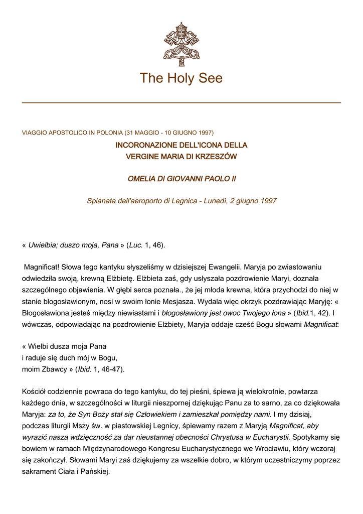 The Holy See VIAGGIO APOSTOLICO IN POLONIA (31 MAGGIO - 10 GIUGNO 1997) INCORONAZIONE DELL'ICONA DELLA VERGINE MARIA DI KRZESZÓW OMELIA DI GIOVANNI PAOLO II Spianata dell'aeroporto di Legnica - Lunedì, 2 giugno 1997 « Uwielbia; duszo moja, Pana » (Luc. 1, 46). Magnificat! Słowa tego kantyku słyszeliśmy w dzisiejszej Ewangelii. Maryja po zwiastowaniu odwiedziła swoją, krewną Elżbietę. Elżbieta zaś, gdy usłyszała pozdrowienie Maryi, doznała szczególnego objawienia. W głębi serca poznała., że jej młoda krewna, która przychodzi do niej w stanie błogosławionym, nosi w swoim łonie Mesjasza. Wydala więc okrzyk pozdrawiając Maryję: « Błogosławiona jesteś między niewiastami i błogosławiony jest owoc Twojego łona » (Ibid.1, 42). I wówczas, odpowiadając na pozdrowienie Elżbiety, Maryja oddaje cześć Bogu słowami Magnificat: « Wielbi dusza moja Pana i raduje się duch mój w Bogu, moim Zbawcy » (Ibid. 1, 46-47). Kościół codziennie powraca do tego kantyku, do tej pieśni, śpiewa ją wielokrotnie, powtarza każdego dnia, w szczególności w liturgii nieszpornej dziękując Panu za to sarno, za co dziękowała Maryja: za to, że Syn Boży stał się Człowiekiem i zamieszkał pomiędzy nami. I my dzisiaj, podczas liturgii Mszy św. w piastowskiej Legnicy, śpiewamy razem z Maryją Magnificat, aby wyrazić nasza wdzięczność za dar nieustannej obecności Chrystusa w Eucharystii. Spotykamy się bowiem w ramach Międzynarodowego Kongresu Eucharystycznego we Wrocławiu, który wczoraj się zakończył. Słowami Maryi zaś dziękujemy za wszelkie dobro, w którym uczestniczymy poprzez sakrament Ciała i Pańskiej. 2 Zanosimy to dziękczynienie razem z wszystkimi pokoleniami wierzących na całym świecie. I jest dla nas szczególną radością, iż ten powszechny hymn uwielbienia rozbrzmiewa na Dolnym Śląsku dzisiaj, tu-taj w Legnicy. Cieszę się, że mogłem tu przybyć i spotkać się ze wspólnotą Kościoła, która od pięciu lat ma swoją własną diecezję. Słowa serdecznego powitania kieruję do waszego pasterza, biskupa Tadeusza, jego biskupa pomocniczego, do kapłanów, do osób konsekrowanych i do wszystkich wiernych diecezji legnickiej. Pozdrawiam również pielgrzymów przybyłych z Niemiec i z Czech oraz Serbołużyczan. Wszystkim dziękuję za ich obecność. Wasza diecezja jest młoda, ale chrześcijaństwo na tych ziemiach ma swoja długa i bogata tradycję. Pamiętamy, że Legnica to miejsce historyczne - miejsce, na którym książę piastowski Henryk, zwany Pobożnym, syn św. Jadwigi, stawił czoło najeźdźcom ze Wschodu -. Tatarom wstrzymując ich groźny pochód ku Zachodowi. Z tego powodu, choć bitwa została przegrana, wielu historyków uznaje j za jedną z ważniejszych w dziejach Europy. Ma ona również wyjątkowe znaczenie z punktu widzenia wiary. Trudno określić, jakie motywy przeważały w sercu Henryka chęć obrony ojczystej ziemi i udręczonego ludu, czy też wola powstrzymania wojsk mahometańskich zagrażających chrześcijaństwu. Wydaje się, że motywy te były nierozłączne. Henryk, oddając życie za powierzony jego władzy lud, równocześnie oddawał je za wiarę Chrystusową. I to był znamienny rys jego pobożności, którą ówczesne pokolenia dostrzegły i zachowały jako przydomek: Henryk Pobożny. Ta okoliczność historyczna, związana z miejscem naszej dzisiejszej liturgii, usposabia nas do refleksji nad tajemnicą Eucharystii w szczególnej perspektywie - w perspektywie życia społecznego. Słusznie bowiem naucza Sobór, iż skoro «żadna . . . społeczność chrześcijańska nie da się wytworzyć, jeżeli nie ma korzenia i podstawy w sprawowaniu Najświętszej Eucharystii, od niej . . ., trzeba zaczynać wszelkie wychowanie do ducha wspólnoty » (Presbyterorum Ordinis, 6) 2. Pyta Apostoł: « Czyż nie wiecie, że jesteście świątynią Boga i że Duch Boży mieszka w was? » (1 Cor. 3, 16). Te słowa św. Pawła odnoszą się do wspólnoty Kościoła w Koryncie, ale można też odnieść je do wszystkich wspólnot, które rozwijały się w miastach i wioskach na przestrzeni wieków. Czym żyła wspólnota Kościoła? Skąd otrzymywała Ducha Bożego? Dzieje Apostolskie dają świadectwo, iż chrześcijanie od początku trwali na modlitwie, na słuchaniu słowa Bożego i na łamaniu chleba, czyli liturgii eucharystycznej (Act. 2, 42). W ten sposób codziennie powracali do wieczernika, do tej chwili, kiedy Chrystus ustanowił Eucharystię. Od tego momentu Eucharystia stała się zaczynem nowej budowy. Eucharystia stała się źródłem głębokiej więzi między uczniami Chrystusa: budowała « komunię », wspólnotę Jego Ciała Mistycznego. Wspólnota ta miała korzenie w miłości i była przeniknięta miłością. Widzialnym znakiem tej miłości była codzienna troska o każdego pozostającego w potrzebie. Dzielenie eucharystycznego Chleba było dla chrześcijan wezwaniem do tego, by dzielić również chleb codzienny z tymi, którzy go nie mają. Niektórzy nawet, jak czytamy w Dziejach 3 Apostolskich, « sprzedawali majątki i dobra i rozdzielali je każdemu według potrzeby » (Ibid. 2, 45). Ta działalność pierwszej wspólnoty Kościoła we wszystkich wymiarach życia społecznego była kontynuacją Chrystusowej miś/i niesienia światu nowej sprawiedliwości - sprawiedliwości Królestwa Bożego. 3. Bracia i Siostry! Dziś, gdy celebrujemy Eucharystię, i dla nas staje się jasne, że jesteśmy wezwani, by żyć tym samym życiem i tym samym Duchem. Jest wielkim zadaniem naszego pokolenia, wszystkich chrześcijan tego czasu, nieść światło Chrystusa w życie społeczne. Nieść je na « współczesne areopagi », ogromne obszary dzisiejszej cywilizacji i kultury, polityki i ekonomii. Wiara nie może być przeżywana tylko we wnętrzu ludzkiego ducha. Ona musi znajdować swój wyraz zewnętrzny w życiu społecznym. «Kto nie milo/e brata swego, którego widzi, nie może mił