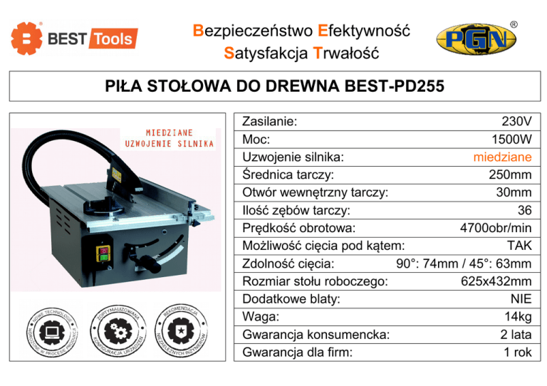 Bezpieczeństwo Efektywność Satysfakcja Trwałość PIŁA STOŁOWA DO DREWNA BEST-PD255 Zasilanie: 230V Moc: 1500W Uzwojenie silnika: miedziane Średnica tarczy: 250mm Otwór wewnętrzny tarczy: 30mm Ilość zębów tarczy: 36 Prędkość obrotowa: 4700obr/min Możliwość cięcia pod kątem: TAK Zdolność cięcia: 90°: 74mm / 45°: 63mm Rozmiar stołu roboczego: 625x432mm Dodatkowe blaty: NIE Waga: 14kg Gwarancja konsumencka: 2 lata Gwarancja dla firm: 1 rok