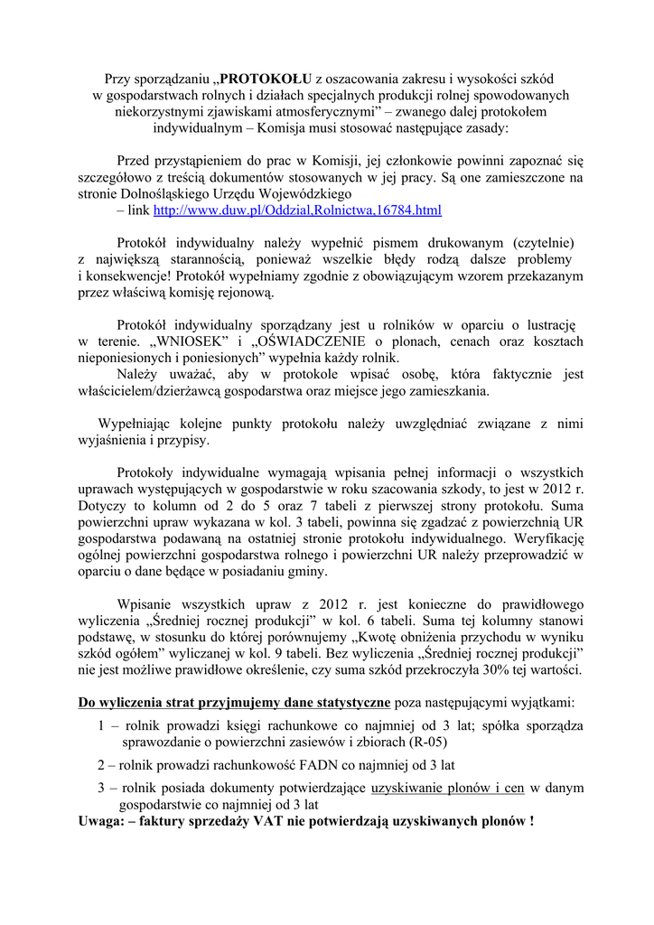 Przy sporządzaniu „PROTOKOŁU z oszacowania zakresu i wysokości szkód w gospodarstwach rolnych i działach specjalnych produkcji rolnej spowodowanych niekorzystnymi zjawiskami atmosferycznymi” – zwanego dalej protokołem indywidualnym – Komisja musi stosować następujące zasady: Przed przystąpieniem do prac w Komisji, jej członkowie powinni zapoznać się szczegółowo z treścią dokumentów stosowanych w jej pracy. Są one zamieszczone na stronie Dolnośląskiego Urzędu Wojewódzkiego – link http://www.duw.pl/Oddzial,Rolnictwa,16784.html Protokół indywidualny należy wypełnić pismem drukowanym (czytelnie) z największą starannością, ponieważ wszelkie błędy rodzą dalsze problemy i konsekwencje! Protokół wypełniamy zgodnie z obowiązującym wzorem przekazanym przez właściwą komisję rejonową. Protokół indywidualny sporządzany jest u rolników w oparciu o lustrację w terenie. „WNIOSEK” i „OŚWIADCZENIE o plonach, cenach oraz kosztach nieponiesionych i poniesionych” wypełnia każdy rolnik. Należy uważać, aby w protokole wpisać osobę, która faktycznie jest właścicielem/dzierżawcą gospodarstwa oraz miejsce jego zamieszkania. Wypełniając kolejne punkty protokołu należy uwzględniać związane z nimi wyjaśnienia i przypisy. Protokoły indywidualne wymagają wpisania pełnej informacji o wszystkich uprawach występujących w gospodarstwie w roku szacowania szkody, to jest w 2012 r. Dotyczy to kolumn od 2 do 5 oraz 7 tabeli z pierwszej strony protokołu. Suma powierzchni upraw wykazana w kol. 3 tabeli, powinna się zgadzać z powierzchnią UR gospodarstwa podawaną na ostatniej stronie protokołu indywidualnego. Weryfikację ogólnej powierzchni gospodarstwa rolnego i powierzchni UR należy przeprowadzić w oparciu o dane będące w posiadaniu gminy. Wpisanie wszystkich upraw z 2012 r. jest konieczne do prawidłowego wyliczenia „Średniej rocznej produkcji” w kol. 6 tabeli. Suma tej kolumny stanowi podstawę, w stosunku do której porównujemy „Kwotę obniżenia przychodu w wyniku szkód ogółem” wyliczanej w kol. 9 tabeli. Bez wyliczenia „Średniej rocznej produkcji” nie jest możliwe prawidłowe określenie, czy suma szkód przekroczyła 30% tej wartości. Do wyliczenia strat przyjmujemy dane statystyczne poza następującymi wyjątkami: 1 – rolnik prowadzi księgi rachunkowe co najmniej od 3 lat; spółka sporządza sprawozdanie o powierzchni zasiewów i zbiorach (R-05) 2 – rolnik prowadzi rachunkowość FADN co najmniej od 3 lat 3 – rolnik posiada dokumenty potwierdzające uzyskiwanie plonów i cen w danym gospodarstwie co najmniej od 3 lat Uwaga: – faktury sprzedaży VAT nie potwierdzają uzyskiwanych plonów ! W każdym innym przypadku posługujemy się danymi statystycznymi. Jeśli rolnik nie przedstawi dokumentów potwierdzających wpisanych w „Załącznik nr 1” średnich plonów i cen, nie powinien wypełniać kolumn 4 i 5 tabeli załącznika. Prowadzenie ksiąg rachunkowych rolnik potwierdza dostarczeniem do komisji wydruków z systemu księgowego dotyczących wielkości i wartości sprzedaży poszczególnych produktów w skali rocznej za ostatnie trzy (lub pięć) pełne lata kalendarzowe. Na tej podstawie wylicza się średnie dla konkretnego gospodarstwa, posługując się tabelą pomocniczą. W takim przypadku tabela pomocnicza – po zweryfikowaniu przez Komisję – musi być dołączona do protokołu indywidualnego (nie jest obowiązkowym załącznikiem w pozostałych przypadkach). Nie można stosować średnich statystycznych i własnych wyliczeń w jednym protokole dla różnych upraw. Jeśli stosujemy średnie statystyczne, to i tak rolnik musi podać własne ceny (osiągnięte lub prognozowane) na rok 2012. W przypadku wystąpienia szkód w zwierzętach, są one wyliczane w tabeli do tego przeznaczonej w protokole indywidualnym. Kwotę obniżenia przychodu w wyniku szkód obliczamy, jeśli wyliczony w kolumnie 5 procentowy udział liczby zwierząt padłych lub poddanych ubojowi z konieczności przekroczy 30%. Wtedy kwoty obniżenia przychodu w uprawach i zwierzętach sumujemy do wyliczenia % szkody w gospodarstwie rolnym w stosunku do średniej rocznej produkcji. Przy szacowaniu szkód w środkach trwałych, należy szczegółowo je wymienić i opisać rodzaje i zakres uszkodzeń (dotyczy to zarówno budynków gospodarczych, maszyn rolniczych i plantacjach wieloletnich). Szacowanie szkód w budynkach wykonuje członek komisji posiadający wykształcenie i doświadczenie zawodowe w budownictwie. Protokoły muszą być podpisane czytelnie przez członków komisji i rolnika. UWAGA ! Zgodnie z obowiązującymi od 2010 roku zasadami wyliczania kwoty obniżenia przychodu w gospodarstwie rolnym, warunkiem koniecznym do poprawnych obliczeń jest ujęcie w protokole wszystkich upraw występujących w gospodarstwie w roku wystąpienia szkody – rozliczyć należy cały obszar użytków rolnych gospodarstwa. Jeśli gospodarstwo nie prowadzi zapisów rachunkowości, konieczne jest stosowanie danych statystycznych odnośnie plonów i cen z 3 (lub 5) ostatnich lat. Powyższe warunki nie zawsze są możliwe do spełnienia w ciągu roku (np. w I kwartale rolnicy nie mogli dokonać zasiewów upraw wiosennych z powodów oczywistych – zima w pełni). Również uzyskanie informacji o plonach i cenach upraw za poprzedni rok z WUS we Wrocławiu nie jest możliwe na początku roku. Jak wynika z powyższego, prawidłowe sporządzenie protokołu szacowania szkód w gospodarstwie jest możliwe dopiero w późniejszym terminie. W przypadku, gdy rolnik posiada grunty na terenie dwóch lub więcej gmin, protokół ostateczny, będący podsumowaniem i obliczeniem poszczególnych średnich wartości i całości szkód – sporządza komisja gminna powołana przez Wojewodę właściwa ze względu na miejsce zamieszkania rolnika, na podstawie protokołów indywidualnych częściowych, sporządzonych przez komisje w i