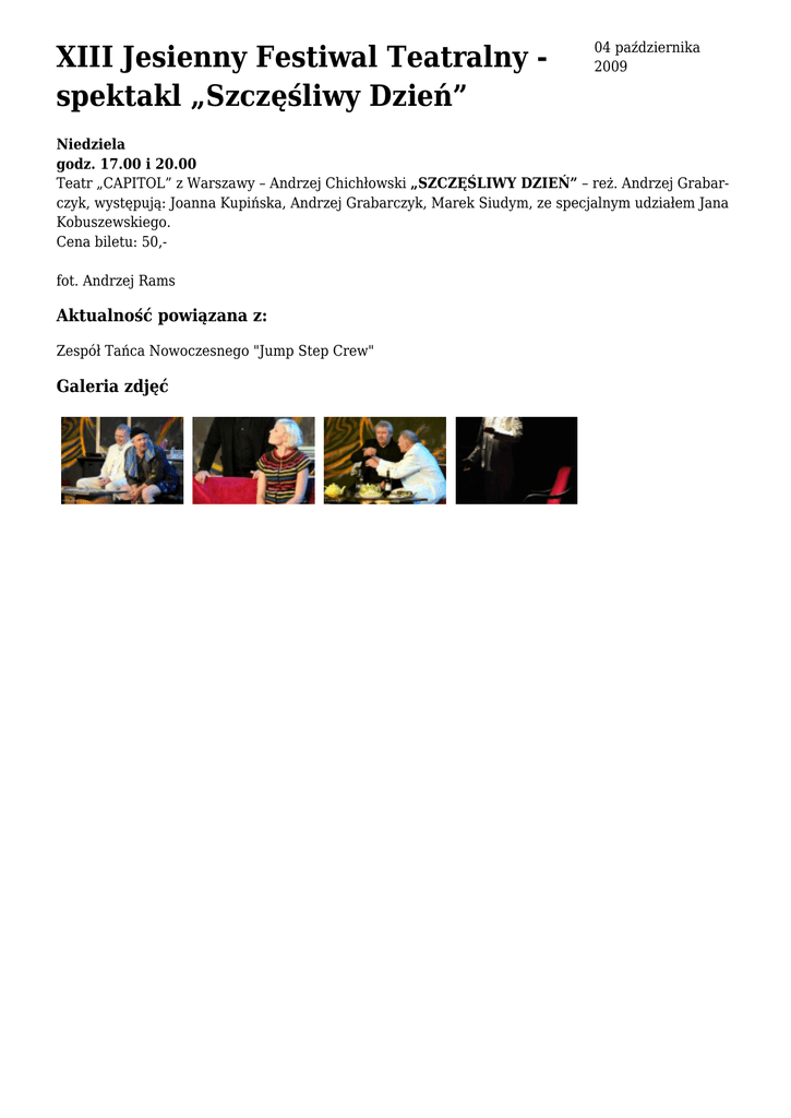 XIII Jesienny Festiwal Teatralny spektakl „Szczęśliwy Dzień” 04 października 2009 Niedziela godz. 17.00 i 20.00 Teatr „CAPITOL” z Warszawy – Andrzej Chichłowski „SZCZĘŚLIWY DZIEŃ” – reż. Andrzej Grabarczyk, występują: Joanna Kupińska, Andrzej Grabarczyk, Marek Siudym, ze specjalnym udziałem Jana Kobuszewskiego. Cena biletu: 50,fot. Andrzej Rams Aktualność powiązana z: Zespół Tańca Nowoczesnego "Jump Step Crew" Galeria zdjęć