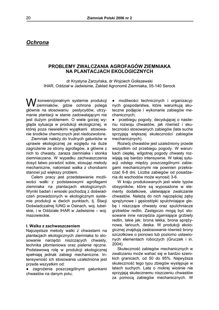 20 Ziemniak Polski 2006 nr 2 Ochrona PROBLEMY ZWALCZANIA AGROFAGÓW ZIEMNIAKA NA PLANTACJACH EKOLOGICZNYCH dr Krystyna Zarzyńska, dr Wojciech Goliszewski IHAR, Oddział w Jadwisinie, Zakład Agronomii Ziemniaka, 05-140 Serock W konwencjonalnym systemie produkcji ziemniaków, gdzie ochrona polega głównie na stosowaniu pestycydów, utrzymanie plantacji w stanie zadowalającym nie jest dużym problemem. O wiele gorzej wygląda sytuacja w produkcji ekologicznej, w której poza niewielkimi wyjątkami stosowanie środków chemicznych jest niedozwolone. Ziemniak należy do trudnych gatunków w uprawie ekologicznej ze względu na duże zagrożenie ze strony agrofagów, a główne z nich to chwasty, zaraza ziemniaka i stonka ziemniaczana. W wypadku zachwaszczenia dosyć łatwo poradzić sobie, stosując metody mechaniczne, natomiast walka z chorobami stanowi już większy problem. Celem pracy jest przedstawienie możliwości walki z podstawowymi agrofagami ziemniaka na plantacjach ekologicznych. Wyniki badań i wnioski pochodzą z doświadczeń prowadzonych w ekologicznym systemie produkcji w dwóch punktach, tj. Stacji Doświadczalnej IUNG w Osinach, woj. lubelskie, i w Oddziale IHAR w Jadwisinie – woj. mazowieckie. I. Walka z zachwaszczeniem Najczęstsze metody walki z chwastami na plantacjach ekologicznych ziemniaka to stosowanie narzędzi niszczących chwasty, technika płomieniowa oraz pielenie ręczne. Podstawową rolę w produkcji ekologicznej spełniają jednak zabiegi mechaniczne. Intensywność ich stosowania uzależniona jest przede wszystkim od: ● zagrożenia poszczególnymi gatunkami chwastów na danym polu; ● możliwości technicznych i organizacyjnych gospodarstwa, które warunkują skuteczne podjęcie i wykonanie zabiegów mechanicznych; ● przebiegu pogody, decydującej o nasileniu rozwoju chwastów, jak również i skuteczności stosowanych zabiegów (lata suche sprzyjają większej skuteczności zabiegów mechanicznych). Rozwój chwastów jest uzależniony przede wszystkim od przebiegu pogody. W warunkach ciepłej, wilgotnej pogody chwasty rozwijają się bardzo intensywnie. W takiej sytuacji odstęp między poszczególnymi zabiegami mechanicznymi nie powinien przekraczać 6-8 dni. Liczba zabiegów od posadzenia do wschodów może wynosić 3-6. W kraju produkowanych jest wiele typów obsypników, które są wyposażone w elementy dodatkowe, ułatwiające zwalczanie chwastów. Należą do nich najczęściej zęby sprężynowe i gęsiostópki spulchniające glebę i niszczące chwasty oraz spulchniacze grzbietów redlin. Zastępczo mogą być stosowane inne narzędzia zgarniające grzbiety redlin, takie jak: brona lekka, brona sprężynowa, łańcuch, deska. W produkcji ekologicznej znajdują zastosowanie również brony szczotkowe o pionowo lub poziomo ustawionych elementach roboczych (Gruczek i in. 2004). Skuteczność zabiegów mechanicznych w zwalczaniu może wahać się w bardzo szerokich granicach, od 50 do 95%. Najwyższa skuteczność tego typu zbiegów występuje w latach suchych. Lata o mokrej wiośnie nie sprzyjają skutecznemu niszczeniu chwastów za pomocą zabiegów mechanicznych. W Ziemniak Polski 2006 nr 2 takiej sytuacji często zabiegi mechaniczne wymagają uzupełniającego odchwaszczania ręcznego. W naszych badaniach zwalczanie mechaniczne za pomocą narzędzi oraz jednokrotne pielenie ręczne było wystarczające. Technika płomieniowa. W zwalczaniu chwastów w produkcji ekologicznej jest również dopuszczalna. Polega na działaniu wysokiej temperatury (50-70oC) na żywe komórki roślin. Musi to być jednak przeprowadzone precyzyjnie, aby płomień w żadnym wypadku nie dosięgał gleby (gdyż niszczy florę i faunę glebową), lecz wyłącznie wierzchołków chwastów. Zakłócenie szeregu procesów fizjologicznych powoduje, że chwasty po trzech dniach zasychają. Do niszczenia chwastów techniką płomieniową używa się aparatów plecakowych, taczkowych i zawieszanych na ciągniku. Źródłem energii jest gaz płynny umieszczony w butli. II. Walka z zarazą ziemniaka Zaraza jest najważniejszą gospodarczo i najgroźniejszą chorobą grzybową ziemniaka. Jej szkodliwość w naszym kraju jest szczególnie duża ze względu na warunki klimatyczne korzystne dla rozwoju choroby. Szkodliwość choroby polega na: ● obniżaniu plonu. Stwierdzono, że zniszczenie 50-70% powierzchni liści zatrzymuje całkowicie przyrost plonu; ● pośrednim porażeniu bulw ziemniaka. Porażone bulwy gniją w czasie przechowywania i są ponadto atakowane przez inne grzyby i bakterie, co dodatkowo zwiększa straty. Zwalczanie zarazy ziemniaka na plantacjach ekologicznych polega przede wszystkim na działaniach profilaktycznych, takich jak: ● niszczenie źródeł zakażenia, ● podkiełkowywanie sadzeniaków, ● stosowanie wczesnych terminów sadzenia, ● uprawa odmian o wysokiej odporności lub odmian bardzo wczesnych i wczesnych, schodzących z pola przed największym nasileniem choroby. Jeżeli te zabiegi nie dają zadowalających efektów (a w praktyce zdarza się to bardzo często), należy stosować zwalczanie che- 21 miczne za pomocą środków dopuszczonych do użycia w tego typu uprawach. Jedynymi fungicydami dopuszczonymi do stosowania w produkcji ekologicznej są środki miedziowe działające zarówno na zarazę ziemniaka, jak i na alternariozę. Są jednak limity ograniczające ich ilość. Limit wynosi obecnie 8 kg miedzi na hektar, a w kolejnych latach ma być zmniejszany do 6 kg. Całkowita rezygnacja z tych środków jest raczej niemożliwa. Badania światowe idą jednak w kierunku ograniczenia ilości substancji aktywnej oraz poprawy skuteczności działania preparatów, co można uzyskać poprzez: ● dokładniejsze ich dawkowanie, ● stosowanie środków wspomagających działanie, takich jak propolis czy mieszanka olejów roślinnych. Dopuszczone do stosowania w produkcji ekologicznej środki oparte na miedzi to: siarczan miedzi (trójzasa