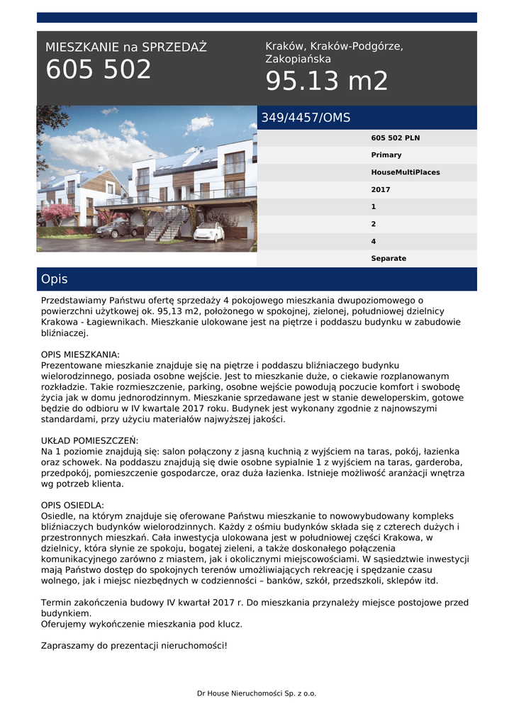 MIESZKANIE na SPRZEDAŻ 605 502 Kraków, Kraków-Podgórze, Zakopiańska 95.13 m2 349/4457/OMS 605 502 PLN Primary HouseMultiPlaces 2017 1 2 4 Separate Opis Przedstawiamy Państwu ofertę sprzedaży 4 pokojowego mieszkania dwupoziomowego o powierzchni użytkowej ok. 95,13 m2, położonego w spokojnej, zielonej, południowej dzielnicy Krakowa - Łagiewnikach. Mieszkanie ulokowane jest na piętrze i poddaszu budynku w zabudowie bliźniaczej. OPIS MIESZKANIA: Prezentowane mieszkanie znajduje się na piętrze i poddaszu bliźniaczego budynku wielorodzinnego, posiada osobne wejście. Jest to mieszkanie duże, o ciekawie rozplanowanym rozkładzie. Takie rozmieszczenie, parking, osobne wejście powodują poczucie komfort i swobodę życia jak w domu jednorodzinnym. Mieszkanie sprzedawane jest w stanie deweloperskim, gotowe będzie do odbioru w IV kwartale 2017 roku. Budynek jest wykonany zgodnie z najnowszymi standardami, przy użyciu materiałów najwyższej jakości. UKŁAD POMIESZCZEŃ: Na 1 poziomie znajdują się: salon połączony z jasną kuchnią z wyjściem na taras, pokój, łazienka oraz schowek. Na poddaszu znajdują się dwie osobne sypialnie 1 z wyjściem na taras, garderoba, przedpokój, pomieszczenie gospodarcze, oraz duża łazienka. Istnieje możliwość aranżacji wnętrza wg potrzeb klienta. OPIS OSIEDLA: Osiedle, na którym znajduje się oferowane Państwu mieszkanie to nowowybudowany kompleks bliźniaczych budynków wielorodzinnych. Każdy z ośmiu budynków składa się z czterech dużych i przestronnych mieszkań. Cała inwestycja ulokowana jest w południowej części Krakowa, w dzielnicy, która słynie ze spokoju, bogatej zieleni, a także doskonałego połączenia komunikacyjnego zarówno z miastem, jak i okolicznymi miejscowościami. W sąsiedztwie inwestycji mają Państwo dostęp do spokojnych terenów umożliwiających rekreację i spędzanie czasu wolnego, jak i miejsc niezbędnych w codzienności – banków, szkół, przedszkoli, sklepów itd. Termin zakończenia budowy IV kwartał 2017 r. Do mieszkania przynależy miejsce postojowe przed budynkiem. Oferujemy wykończenie mieszkania pod klucz. Zapraszamy do prezentacji nieruchomości! Dr House Nieruchomości Sp. z o.o. Opiekun inwestycji: Ewa Korczyńska mobile: +48 501 938 800 e-mail: [email protected] Nr licencji: 22912 Dr House Nieruchomości Sp. z o.o. ul. Węgierska 16/2, 30-531 Kraków Telefon: +48 516 257 003 e-mail: [email protected], www.drhousenieruchomosci.pl Zamieszczone na naszych stronach oferty nie stanowią oferty w rozumieniu Kodeksu Cywilnego, a dane w nich zawarte mają jedynie charakter informacyjny. Ewa Korczyńska tel. +48 501 938 800 email: [email protected] Dr House Nieruchomości Sp. z o.o. Powered by TCPDF (www.tcpdf.org)