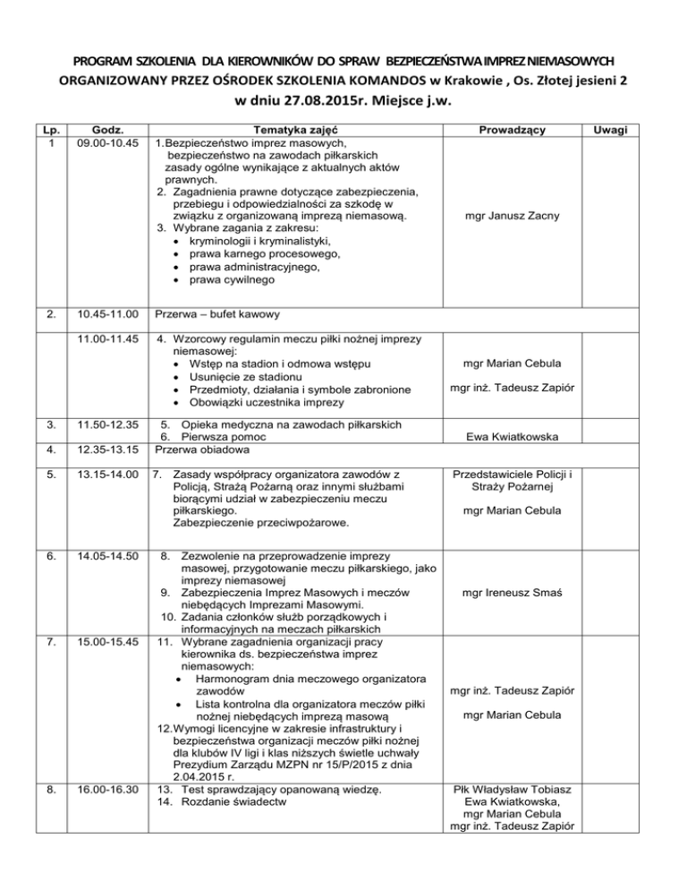 PROGRAM SZKOLENIA DLA KIEROWNIKÓW DO SPRAW BEZPIECZEŃSTWA IMPREZ NIEMASOWYCH ORGANIZOWANY PRZEZ OŚRODEK SZKOLENIA KOMANDOS w Krakowie , Os. Złotej jesieni 2 w dniu 27.08.2015r. Miejsce j.w. Lp. 1 2. Godz. 09.00-10.45 10.45-11.00 Przerwa – bufet kawowy 11.00-11.45 4. Wzorcowy regulamin meczu piłki nożnej imprezy niemasowej: Wstęp na stadion i odmowa wstępu Usunięcie ze stadionu Przedmioty, działania i symbole zabronione Obowiązki uczestnika imprezy 3. 11.50-12.35 4. 12.35-13.15 5. 13.15-14.00 6. 7. 8. Tematyka zajęć 1. Bezpieczeństwo imprez masowych, bezpieczeństwo na zawodach piłkarskich zasady ogólne wynikające z aktualnych aktów prawnych. 2. Zagadnienia prawne dotyczące zabezpieczenia, przebiegu i odpowiedzialności za szkodę w związku z organizowaną imprezą niemasową. 3. Wybrane zagania z zakresu: kryminologii i kryminalistyki, prawa karnego procesowego, prawa administracyjnego, prawa cywilnego 14.05-14.50 15.00-15.45 16.00-16.30 5. Opieka medyczna na zawodach piłkarskich 6. Pierwsza pomoc Przerwa obiadowa 7. Zasady współpracy organizatora zawodów z Policją, Strażą Pożarną oraz innymi służbami biorącymi udział w zabezpieczeniu meczu piłkarskiego. Zabezpieczenie przeciwpożarowe. 8. Zezwolenie na przeprowadzenie imprezy masowej, przygotowanie meczu piłkarskiego, jako imprezy niemasowej 9. Zabezpieczenia Imprez Masowych i meczów niebędących Imprezami Masowymi. 10. Zadania członków służb porządkowych i informacyjnych na meczach piłkarskich 11. Wybrane zagadnienia organizacji pracy kierownika ds. bezpieczeństwa imprez niemasowych: Harmonogram dnia meczowego organizatora zawodów Lista kontrolna dla organizatora meczów piłki nożnej niebędących imprezą masową 12. Wymogi licencyjne w zakresie infrastruktury i bezpieczeństwa organizacji meczów piłki nożnej dla klubów IV ligi i klas niższych świetle uchwały Prezydium Zarządu MZPN nr 15/P/2015 z dnia 2.04.2015 r. 13. Test sprawdzający opanowaną wiedzę. 14. Rozdanie świadectw Prowadzący mgr Janusz Zacny mgr Marian Cebula mgr inż. Tadeusz Zapiór Ewa Kwiatkowska Przedstawiciele Policji i Straży Pożarnej mgr Marian Cebula mgr Ireneusz Smaś mgr inż. Tadeusz Zapiór mgr Marian Cebula Płk Władysław Tobiasz Ewa Kwiatkowska, mgr Marian Cebula mgr inż. Tadeusz Zapiór Uwagi