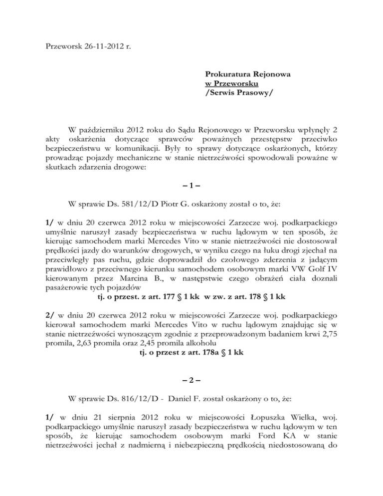 Przeworsk 26-11-2012 r. Prokuratura Rejonowa w Przeworsku /Serwis Prasowy/ W październiku 2012 roku do Sądu Rejonowego w Przeworsku wpłynęły 2 akty oskarżenia dotyczące sprawców poważnych przestępstw przeciwko bezpieczeństwu w komunikacji. Były to sprawy dotyczące oskarżonych, którzy prowadząc pojazdy mechaniczne w stanie nietrzeźwości spowodowali poważne w skutkach zdarzenia drogowe: –1– W sprawie Ds. 581/12/D Piotr G. oskarżony został o to, że: 1/ w dniu 20 czerwca 2012 roku w miejscowości Zarzecze woj. podkarpackiego umyślnie naruszył zasady bezpieczeństwa w ruchu lądowym w ten sposób, że kierując samochodem marki Mercedes Vito w stanie nietrzeźwości nie dostosował prędkości jazdy do warunków drogowych, w wyniku czego na łuku drogi zjechał na przeciwległy pas ruchu, gdzie doprowadził do czołowego zderzenia z jadącym prawidłowo z przeciwnego kierunku samochodem osobowym marki VW Golf IV kierowanym przez Marcina B., w następstwie czego obrażeń ciała doznali pasażerowie tych pojazdów tj. o przest. z art. 177 § 1 kk w zw. z art. 178 § 1 kk 2/ w dniu 20 czerwca 2012 roku w miejscowości Zarzecze woj. podkarpackiego kierował samochodem marki Mercedes Vito w ruchu lądowym znajdując się w stanie nietrzeźwości wynoszącym zgodnie z przeprowadzonym badaniem krwi 2,75 promila, 2,63 promila oraz 2,45 promila alkoholu tj. o przest z art. 178a § 1 kk –2– W sprawie Ds. 816/12/D - Daniel F. został oskarżony o to, że: 1/ w dniu 21 sierpnia 2012 roku w miejscowości Łopuszka Wielka, woj. podkarpackiego umyślnie naruszył zasady bezpieczeństwa w ruchu lądowym w ten sposób, że kierując samochodem osobowym marki Ford KA w stanie nietrzeźwości jechał z nadmierną i niebezpieczną prędkością niedostosowaną do warunków drogowych, w wyniku czego na łuku drogi stracił panowanie nad pojazdem po czym zjechał z drogi i uderzył w drzewo w następstwie czego obrażeń ciała doznali pasażerowie ww. pojazdu tj. o przest. z art. 177 § 1 kk w zw. z art. 178 § 1 kk 2/ w dniu 21 sierpnia 2012 roku w miejscowości Łopuszka Wielka woj. podkarpackiego kierował samochodem marki Ford KA w ruchu lądowym znajdując się w stanie nietrzeźwości wynoszącym zgodnie z przeprowadzonym badaniem: I-sze badanie 1,11 mg/l, II-gie badanie 1,14 mg/l, III-cie badanie 1,20 mg/l alkoholu w wydychanym powietrzu, wynik badania krwi 1,99 promila alkoholu tj. o przest z art. 178a § 1 kk Stan nietrzeźwości w jakim sprawcy spowodowali wypadki prowadząc pojazdy mechaniczne jest okolicznością, która powoduje możliwość zaostrzenia odpowiedzialności karnej. Obaj oskarżeni byli już uprzednio karani i w związku z możliwością orzeczenia zakazu prowadzenia pojazdów niezwłocznie zatrzymano im prawa jazdy. Za popełnione czyny grozi im łączna kara pozbawienia wolności w wymiarze do 6 lat i 6 miesięcy jak również zakaz prowadzenia pojazdów do 10 lat. Poniosą również w przypadku skazania odpowiedzialność za wyrządzone przestępstwem szkody. Prokurator Rejonowy Mariusz Tworek
