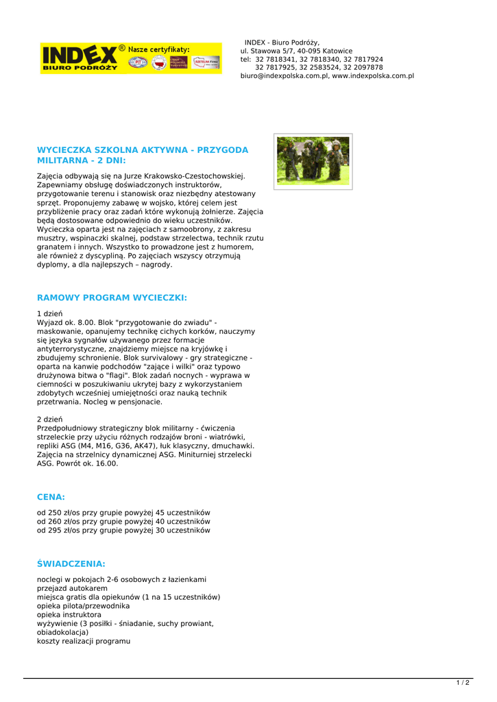 INDEX - Biuro Podróży, ul. Stawowa 5/7, 40-095 Katowice tel: 32 7818341, 32 7818340, 32 7817924 32 7817925, 32 2583524, 32 2097878 [email protected], www.indexpolska.com.pl WYCIECZKA SZKOLNA AKTYWNA - PRZYGODA MILITARNA - 2 DNI: Zajęcia odbywają się na Jurze Krakowsko-Czestochowskiej. Zapewniamy obsługę doświadczonych instruktorów, przygotowanie terenu i stanowisk oraz niezbędny atestowany sprzęt. Proponujemy zabawę w wojsko, której celem jest przybliżenie pracy oraz zadań które wykonują żołnierze. Zajęcia będą dostosowane odpowiednio do wieku uczestników. Wycieczka oparta jest na zajęciach z samoobrony, z zakresu musztry, wspinaczki skalnej, podstaw strzelectwa, technik rzutu granatem i innych. Wszystko to prowadzone jest z humorem, ale również z dyscypliną. Po zajęciach wszyscy otrzymują dyplomy, a dla najlepszych – nagrody. RAMOWY PROGRAM WYCIECZKI: 1 dzień Wyjazd ok. 8.00. Blok "przygotowanie do zwiadu" maskowanie, opanujemy technikę cichych korków, nauczymy się języka sygnałów używanego przez formacje antyterrorystyczne, znajdziemy miejsce na kryjówkę i zbudujemy schronienie. Blok survivalowy - gry strategiczne oparta na kanwie podchodów "zające i wilki" oraz typowo drużynowa bitwa o "flagi". Blok zadań nocnych - wyprawa w ciemności w poszukiwaniu ukrytej bazy z wykorzystaniem zdobytych wcześniej umiejętności oraz nauką technik przetrwania. Nocleg w pensjonacie. 2 dzień Przedpołudniowy strategiczny blok militarny - ćwiczenia strzeleckie przy użyciu różnych rodzajów broni - wiatrówki, repliki ASG (M4, M16, G36, AK47), łuk klasyczny, dmuchawki. Zajęcia na strzelnicy dynamicznej ASG. Miniturniej strzelecki ASG. Powrót ok. 16.00. CENA: od 250 zł/os przy grupie powyżej 45 uczestników od 260 zł/os przy grupie powyżej 40 uczestników od 295 zł/os przy grupie powyżej 30 uczestników ŚWIADCZENIA: noclegi w pokojach 2-6 osobowych z łazienkami przejazd autokarem miejsca gratis dla opiekunów (1 na 15 uczestników) opieka pilota/przewodnika opieka instruktora wyżywienie (3 posiłki - śniadanie, suchy prowiant, obiadokolacja) koszty realizacji programu 1/2 przygotowanie terenu i stanowisk, atestowany sprzęt dyplomy dla wszystkich uczestników, nagrody dla najlepszych wszystkie opłaty drogowe i parkingi podatek VAT UWAGI: Instruktor, przygotowanie terenu i stanowisk, atestowany sprzęt, dyplomy dla wszystkich uczestników, nagrody dla najlepszych w cenie. Ceny biletów wstępu są cenami orientacyjnymi i mogą one ulec zmianie niezależnie od Biura Podróży Index, dlatego prosimy o powiększenie funduszu na pokrycie ewentualnych podwyżek cen biletów. 2/2 Powered by TCPDF (www.tcpdf.org)