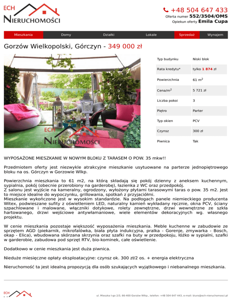 +48504647433 Ofertanumer552/3504/OMS OpiekunofertyEmilaCupa Mieszkania Domy Działki Lokale Sprzedaż Wynajem GorzówWielkopolski,Górczyn-349000zł Typbudynku Niskiblok Ratakredytu* tylko1874zł Powierzchnia 61m2 Cena/m2 5721zł Liczbapokoi 3 Piętro Parter Typokien PCV Czynsz 300zł Piwnica Tak WYPOSAŻONEMIESZKANIEWNOWYMBLOKUZTARASEMOPOW.35mkw!! Przedmiotem oferty jest niezwykle atrakcyjne mieszkanie usytuowane na parterze jednopiętrowego blokunaos.GórczynwGorzowieWlkp. Powierzchnia mieszkania to 61 m2, na którą składają się pokój dzienny z aneksem kuchennym, sypialnia,pokój(obecnieprzerobionynagarderobę),łazienkazWCorazprzedpokój. Zsalonujestwyjścienakameralny,ogrodzony,wyłożonypłytamitarasowymitarasopow.35m2.Jest tomiejsceidealnedowypoczynku,grillowania,spotkańzprzyjaciółmi. Mieszkanie wykończone jest w wysokim standardzie. Na podłogach panele niemieckiego producenta Witex,podwieszanesufityzoświetleniemLED,naturalnykamieńwykładanyręcznie,oknaPCV,ściany szpachlowane i malowane, włączniki dotykowe, rolety zewnętrzne, drzwi wewnętrzne ze szkła hartowanego, drzwi wejściowe antywłamaniowe, wiele elementów dekoracyjnych wg. własnego projektu. W cenie mieszkania pozostaje większość wyposażenia mieszkania. Meble kuchenne w zabudowie ze sprzętem AGD (piekarnik, mikrofalówka, biała płyta indukcyjna, pralka - Gorenje, zmywarka - Bosch, okap-Elica),wbudowanaskórzanaskrzyniaorazszafkinabutywprzedpokoju,łóżkowsypialni,szafki wgarderobie,zabudowapodsprzętRTV,bio-kominek,całeoświetlenie. Dodatkowowceniemieszkaniajestdużapiwnica. Niedużemiesięczneopłatyeksploatacyjne:czynszok.300zł/2os.+energiaelektryczna Nieruchomośćtajestidealnąpropozycjądlaosóbszukającychwyjątkowegoiniebanalnegomieszkania. ul.MieszkaI-go2/3,66-400GorzówWlkp.,telefon:+48504647443,e-mail:[email protected]