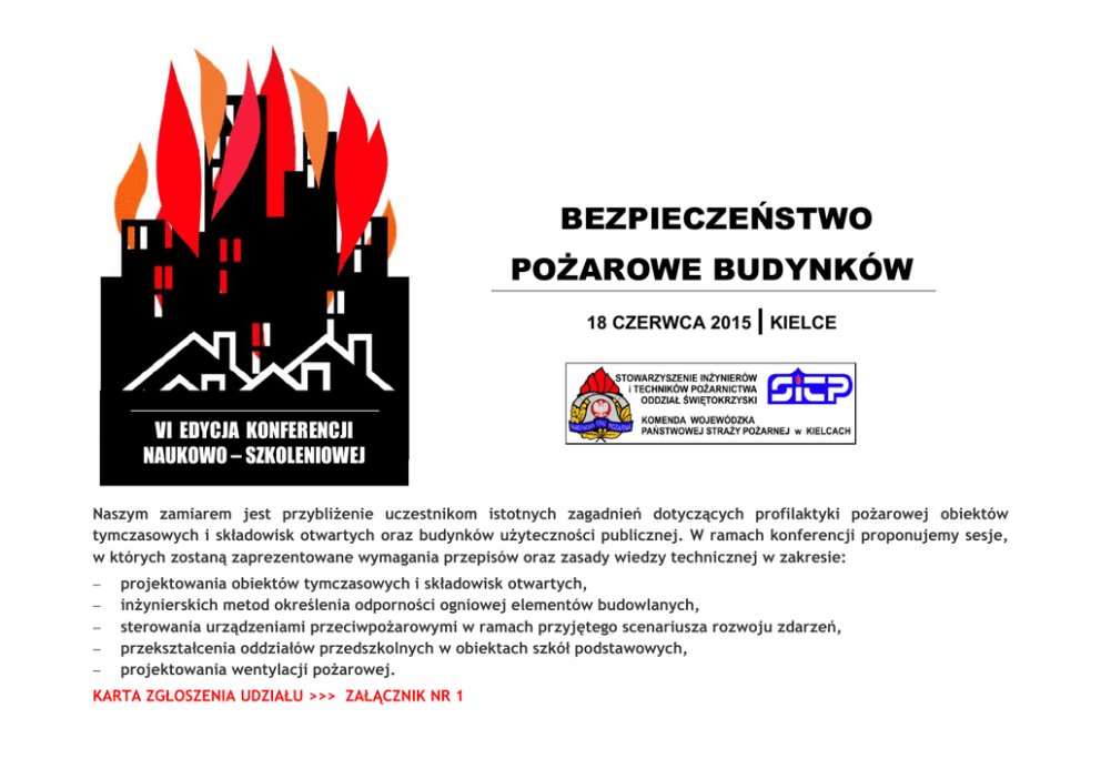 BEZPIECZEŃSTWO POŻAROWE BUDYNKÓW 18 CZERWCA 2015 | KIELCE VI EDYCJA KONFERENCJI NAUKOWO – SZKOLENIOWEJ Naszym zamiarem jest przybliżenie uczestnikom istotnych zagadnień dotyczących profilaktyki pożarowej obiektów tymczasowych i składowisk otwartych oraz budynków użyteczności publicznej. W ramach konferencji proponujemy sesje, w których zostaną zaprezentowane wymagania przepisów oraz zasady wiedzy technicznej w zakresie: projektowania obiektów tymczasowych i składowisk otwartych, inżynierskich metod określenia odporności ogniowej elementów budowlanych, sterowania urządzeniami przeciwpożarowymi w ramach przyjętego scenariusza rozwoju zdarzeń, przekształcenia oddziałów przedszkolnych w obiektach szkół podstawowych, projektowania wentylacji pożarowej. KARTA ZGŁOSZENIA UDZIAŁU >>> ZAŁĄCZNIK NR 1 WYKŁADOWCY KONFERENCJI: st. bryg. dr inż. Paweł JANIK st. bryg. mgr inż. Piotr WOJTASZEWSKI dr inż. Paweł SULIK st. kpt. mgr inż. Rafał SZCZYPTA st. kpt. mgr inż. Marcin CISEK Dyrektor Biura Rozpoznawania Zagrożeń KGPSP, Zastępca Dyrektora Biura Rozpoznawania Zagrożeń KGPSP, Kierownik Zakładu Badań Ogniowych Instytutu Techniki Budowlanej, Biuro Rozpoznawania Zagrożeń KGPSP, Szkoła Główna Służby Pożarniczej. PATRONAT MEDIALNY: OCHRONA PRZECIWPOŻAROWA Czasopismo Stowarzyszenia Inżynierów i Techników Pożarnictwa ZAPRASZAMY DO ZAPOZNANIA SIĘ ZE SZCZEGÓŁOWĄ TEMATYKĄ KONFERENCJI >>> ZAŁĄCZNIK NR 2 TEMATYKA KONFERENCJI KIEROWANA JEST PRZEDE WSZYSTKIM DO: architektów, projektantów, pracowników wydziałów architektury, nadzoru budowlanego, gospodarki komunalnej, urzędów administracji państwowej i samorządowej, rzeczoznawców ds. zabezpieczeń przeciwpożarowych, strażaków Państwowej Straży Pożarnej realizujących zadania kontrolno – rozpoznawcze, właścicieli, zarządców lub użytkowników budynków. UCZESTNICTWO W KONFERENCJI: 350 zł. brutto – członkowie SITP 380 zł. brutto – pozostali uczestnicy Termin zgłoszenia udziału w konferencji mija 5 czerwca 2015 r. Po tym terminie rejestracja uczestników tylko telefoniczna. W ramach opłaty konferencyjnej uczestnicy mają zapewniony catering oraz materiały konferencyjne. MIEJSCE KONFERENCJI: Hotel Kongresowy – Centrum Biznesu w Kielcach Al. Solidarności 34 25-323 Kielce PARKING: Przy Hotelu Kongresowy – Centrum Biznesu KARTA ZGŁOSZENIA UDZIAŁU >>> ZAŁĄCZNIK NR 1 Mamy nadzieję, że tematyka konferencji spotka się z Państwa zainteresowaniem i będziemy mieli okazję do spotkania oraz wymiany doświadczeń. Serdecznie zapraszamy! W przypadku pytań prosimy o kontakt: Wydział Kontrolno – Rozpoznawczy Komenda Wojewódzka PSP w Kielcach tel. (041) 36 53 231 – 233 lub 606 17 94 01