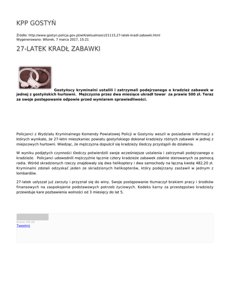 KPP GOSTYŃ Źródło: http://www.gostyn.policja.gov.pl/wl4/aktualnosci/21115,27-latek-kradl-zabawki.html Wygenerowano: Wtorek, 7 marca 2017, 15:21 27-LATEK KRADŁ ZABAWKI Gostyńscy kryminalni ustalili i zatrzymali podejrzanego o kradzież zabawek w jednej z gostyńskich hurtowni. Mężczyzna przez dwa miesiące ukradł towar za prawie 500 zł. Teraz za swoje postępowanie odpowie przed wymiarem sprawiedliwości. Policjanci z Wydziału Kryminalnego Komendy Powiatowej Policji w Gostyniu weszli w posiadanie informacji z których wynikało, że 27-letni mieszkaniec powiatu gostyńskiego dokonał kradzieży różnych zabawek w jednej z miejscowych hurtowni. Wiedząc, że mężczyzna dopuścił się kradzieży śledczy przystąpili do działania. W wyniku podjętych czynności śledczy potwierdzili swoje wcześniejsze ustalenia i zatrzymali podejrzanego o kradzieże. Policjanci udowodnili mężczyźnie łącznie cztery kradzieże zabawek zdalnie sterowanych za pomocą radia. Wśród skradzionych rzeczy znajdowały się dwa helikoptery i dwa samochody na łączną kwotę 482,20 zł. Kryminalni zdołali odzyskać jeden ze skradzionych helikopterów, który podejrzany zastawił w jednym z lombardów. 27-latek usłyszał już zarzuty i przyznał się do winy. Swoje postępowanie tłumaczył brakiem pracy i środków finansowych na zaspokojenie podstawowych potrzeb życiowych. Kodeks karny za przestępstwo kradzieży przewiduje kare pozbawienia wolności od 3 miesięcy do lat 5. Ocena: 0/5 (0) Tweetnij