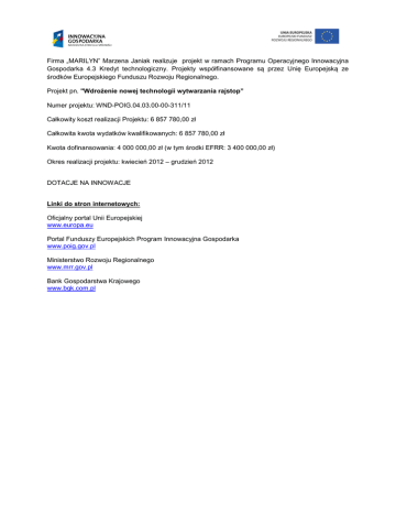 Firma „MARILYN” Marzena Janiak realizuje projekt w ramach Programu Operacyjnego Innowacyjna Gospodarka 4.3 Kredyt technologiczny. Projekty współfinansowane są przez Unię Europejską ze środków Europejskiego Funduszu Rozwoju Regionalnego. Projekt pn. "Wdrożenie nowej technologii wytwarzania rajstop” Numer projektu: WND-POIG.04.03.00-00-311/11 Całkowity koszt realizacji Projektu: 6 857 780,00 zł Całkowita kwota wydatków kwalifikowanych: 6 857 780,00 zł Kwota dofinansowania: 4 000 000,00 zł (w tym środki EFRR: 3 400 000,00 zł) Okres realizacji projektu: kwiecień 2012 – grudzień 2012 DOTACJE NA INNOWACJE Linki do stron internetowych: Oficjalny portal Unii Europejskiej www.europa.eu Portal Funduszy Europejskich Program Innowacyjna Gospodarka www.poig.gov.pl Ministerstwo Rozwoju Regionalnego www.mrr.gov.pl Bank Gospodarstwa Krajowego www.bgk.com.pl