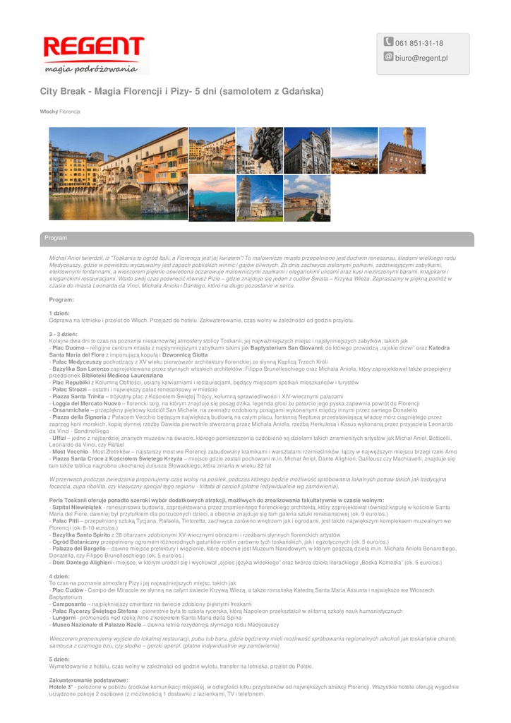 061 851-31-18 [email protected] City Break - Magia Florencji i Pizy- 5 dni (samolotem z Gdańska) Włochy Florencja Program Michał Anioł twierdził, iż "Toskania to ogród Italii, a Florencja jest jej kwiatem"! To malownicze miasto przepełnione jest duchem renesansu, śladami wielkiego rodu Medyceuszy, gdzie w powietrzu wyczuwalny jest zapach pobliskich winnic i gajów oliwnych. Za dnia zachwyca zielonymi parkami, zadziwiającymi zabytkami, efektownymi fontannami, a wieczorem pięknie oświetlona oczarowuje malowniczymi zaułkami i eleganckimi ulicami oraz kusi niezliczonymi barami, knajpkami i eleganckimi restauracjami. Warto swój czas poświecić również Pizie – gdzie znajduje się jeden z cudów Świata – Krzywa Wieża. Zapraszamy w piękną podróż w czasie do miasta Leonarda da Vinci, Michała Anioła i Dantego, które na długo pozostanie w sercu. Program: 1 dzień: Odprawa na lotnisku i przelot do Włoch. Przejazd do hotelu. Zakwaterowanie, czas wolny w zależności od godzin przylotu. 2 - 3 dzień: Kolejne dwa dni to czas na poznanie niesamowitej atmosfery stolicy Toskanii, jej najważniejszych miejsc i najsłynniejszych zabytków, takich jak - Plac Duomo – religijne centrum miasta z najsłynniejszymi zabytkami takimi jak Baptysterium San Giovanni, do którego prowadzą „rajskie drzwi” oraz Katedra Santa Maria del Fiore z imponującą kopułą i Dzwonnicą Giotta - Pałac Medyceuszy pochodzący z XV wieku pierwowzór architektury florenckiej ze słynną Kaplicą Trzech Króli - Bazylika San Lorenzo zaprojektowana przez słynnych włoskich architektów: Filippo Brunelleschiego oraz Michała Anioła, który zaprojektował także przepiękny przedsionek Biblioteki Medicea Laurenziana - Plac Republiki z Kolumną Obfitości, usiany kawiarniami i restauracjami, będący miejscem spotkań mieszkańców i turystów - Pałac Strozzi – ostatni i największy pałac renesansowy w mieście - Piazza Santa Trinita – trójkątny plac z Kościołem Świętej Trójcy, kolumną sprawiedliwości i XIV-wiecznymi pałacami - Loggia del Mercato Nuovo – florencki targ, na którym znajduje się posąg dzika, legenda głosi że potarcie jego pyska zapewnia powrót do Florencji - Orsanmichele – przepiękny piętrowy kościół San Michele, na zewnątrz ozdobiony posągami wykonanymi między innymi przez samego Donatello - Piazza della Signoria z Pałacem Vecchio będącym największą budowlą na całym placu, fontanną Neptuna przedstawiającą władcę mórz ciągniętego przez zaprzęg koni morskich, kopią słynnej rzeźby Dawida pierwotnie stworzoną przez Michała Anioła, rzeźbą Herkulesa i Kasus wykonaną przez przyjaciela Leonardo da Vinci - Bandinelliego - Uffizi – jedno z najbardziej znanych muzeów na świecie, którego pomieszczenia ozdobione są dziełami takich znamienitych artystów jak Michał Anioł, Botticelli, Leonardo da Vinci, czy Rafael - Most Vecchio - Most Złotników – najstarszy most we Florencji zabudowany kramikami i warsztatami rzemieślników, łączy w najwęższym miejscu brzegi rzeki Arno - Piazza Santa Croce z Kościołem Świętego Krzyża – miejsce gdzie zostali pochowani m.in. Michał Anioł, Dante Alighieri, Galileusz czy Machiavelli, znajduje się tam także tablica nagrobna ukochanej Juliusza Słowackiego, która zmarła w wieku 22 lat W przerwach podczas zwiedzania proponujemy czas wolny na posiłek, podczas którego będzie możliwość spróbowania lokalnych potraw takich jak tradycyjna focaccia, zupa ribollita, czy klasyczny specjał tego regionu - frittata di carciofi (płatne indywidualnie wg zamówienia). Perła Toskanii oferuje ponadto szeroki wybór dodatkowych atrakcji, możliwych do zrealizowania fakultatywnie w czasie wolnym: - Szpital Niewiniątek - renesansowa budowla, zaprojektowana przez znamienitego florenckiego architekta, który zaprojektował również kopułę w kościele Santa Maria del Fiore, dawniej był przytułkiem dla porzuconych dzieci, a obecnie znajduje się tam galeria sztuki renesansowej (ok. 9 euro/os.) - Pałac Pitti – przepełniony sztuką Tycjana, Rafaela, Tintoretta, zachwyca zarówno wnętrzem jak i ogrodami, jest także największym kompleksem muzealnym we Florencji (ok. 8-10 euro/os.) - Bazylika Santo Spirito z 38 ołtarzami zdobionymi XV-wiecznymi obrazami i rzeźbami słynnych florenckich artystów - Ogród Botaniczny przepełniony ogromem różnorodnych gatunków roślin zarówno tych toskańskich, jak i egzotycznych (ok. 5 euro/os.) - Palazzo del Bargello – dawne miejsce prefektury i więzienie, które obecnie jest Muzeum Narodowym, w którym goszczą dzieła m.in. Michała Anioła Bonarottiego, Donatella, czy Filippo Brunelleschiego (ok. 5 euro/os.) - Dom Dantego Alighieri - miejsce, w którym urodził się i wychował „ojciec języka włoskiego” oraz twórca dzieła literackiego „Boska Komedia” (ok. 5 euro/os.) 4 dzień: To czas na poznanie atmosfery Pizy i jej najważniejszych miejsc, takich jak - Plac Cudów - Campo dei Miracole ze słynną na całym świecie Krzywą Wieżą, a także romańską Katedrą Santa Maria Assunta i największe we Włoszech Baptysterium - Camposanto – najpiękniejszy cmentarz na świecie zdobiony pięknymi freskami - Pałac Rycerzy Świętego Stefana - pierwotnie była to szkoła rycerska, którą Napoleon przekształcił w elitarną szkołę nauk humanistycznych - Lungarni - promenada nad rzeką Arno z kościołem Santa Maria della Spina - Museo Nazionale di Palazzo Reale – dawna letnia rezydencja słynnego rodu Medyceuszy Wieczorem proponujemy wyjście do lokalnej restauracji, pubu lub baru, gdzie będziemy mieli możliwość spróbowania regionalnych alkoholi jak toskańskie chianti, sambuca z czarnego bzu, czy słodko – gorzki aperol. (płatne indywidualnie wg zamówienia) 5 dzień: Wymeldowanie z hotelu, czas wolny w zależności od godzin wylotu, transfer na lotnisko, przelot do Polski. Zakwaterowanie podstawowe: Hotele 3* - położone