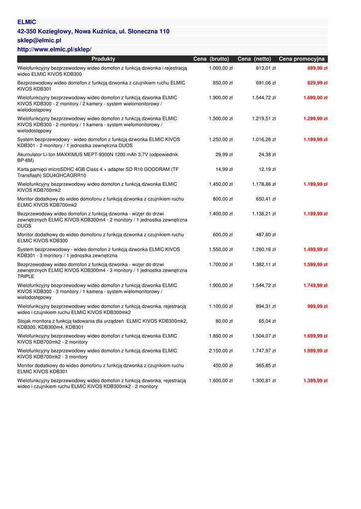 ELMIC 42-350 Koziegłowy, Nowa Kuźnica, ul. Słoneczna 110 [email protected] http://www.elmic.pl/sklep/ Produkty Wielofunkcyjny bezprzewodowy wideo domofon z funkcją dzwonka i rejestracją wideo ELMIC KIVOS KDB300 Cena (brutto) Cena (netto) Cena promocyjna 1.000,00 zł 813,01 zł 899,99 zł 850,00 zł 691,06 zł 829,99 zł Wielofunkcyjny bezprzewodowy wideo domofon z funkcją dzwonka ELMIC KIVOS KDB300 - 2 monitory / 2 kamery - system wielomonitorowy / wielodostępowy 1.900,00 zł 1.544,72 zł 1.699,00 zł Wielofunkcyjny bezprzewodowy wideo domofon z funkcją dzwonka ELMIC KIVOS KDB300 - 2 monitory / 1 kamera - system wielomonitorowy / wielodostępowy 1.500,00 zł 1.219,51 zł 1.299,99 zł System bezprzewodowy - wideo domofon z funkcją dzwonka ELMIC KIVOS KDB301 - 2 monitory / 1 jednostka zewnętrzna DUOS 1.250,00 zł 1.016,26 zł 1.199,99 zł Bezprzewodowy wideo domofon z funkcją dzwonka z czujnikiem ruchu ELMIC KIVOS KDB301 Akumulator Li-Ion MAXXIMUS MEPT-9300N 1200 mAh 3,7V (odpowiednik BP-6M) 29,99 zł 24,38 zł Karta pamięci microSDHC 4GB Class 4 + adapter SD R10 GOODRAM (TF Transflash) SDU4GHCAGRR10 14,99 zł 12,19 zł Wielofunkcyjny bezprzewodowy wideo domofon z funkcją dzwonka ELMIC KIVOS KDB700mk2 Monitor dodatkowy do wideo domofonu z funkcją dzwonka z czujnikiem ruchu ELMIC KIVOS KDB700mk2 Bezprzewodowy wideo domofon z funkcją dzwonka - wizjer do drzwi zewnętrznych ELMIC KIVOS KDB300m4 - 2 monitory / 1 jednostka zewnętrzna DUOS Monitor dodatkowy do wideo domofonu z funkcją dzwonka z czujnikiem ruchu ELMIC KIVOS KDB300 1.450,00 zł 800,00 zł 1.400,00 zł 600,00 zł 1.178,86 zł 1.199,99 zł 650,41 zł 1.138,21 zł 1.199,99 zł 487,80 zł System bezprzewodowy - wideo domofon z funkcją dzwonka ELMIC KIVOS KDB301 - 3 monitory / 1 jednostka zewnętrzna 1.550,00 zł 1.260,16 zł 1.499,99 zł Bezprzewodowy wideo domofon z funkcją dzwonka - wizjer do drzwi zewnętrznych ELMIC KIVOS KDB300m4 - 3 monitory / 1 jednostka zewnętrzna TRIPLE 1.700,00 zł 1.382,11 zł 1.599,99 zł Wielofunkcyjny bezprzewodowy wideo domofon z funkcją dzwonka ELMIC KIVOS KDB300 - 3 monitory / 1 kamera - system wielomonitorowy / wielodostępowy 1.900,00 zł 1.544,72 zł 1.749,99 zł Wielofunkcyjny bezprzewodowy wideo domofon z funkcją dzwonka, rejestracją wideo i czujnikiem ruchu ELMIC KIVOS KDB300mk2 1.100,00 zł 894,31 zł 999,99 zł Stojak monitora z funkcją ładowania dla urządzeń ELMIC KIVOS KDB300mk2, KDB300, KDB300m4, KDB301 80,00 zł 65,04 zł Wielofunkcyjny bezprzewodowy wideo domofon z funkcją dzwonka ELMIC KIVOS KDB700mk2 - 2 monitory 1.850,00 zł 1.504,07 zł 1.699,99 zł Wielofunkcyjny bezprzewodowy wideo domofon z funkcją dzwonka ELMIC KIVOS KDB700mk2 - 3 monitory 2.150,00 zł 1.747,97 zł 1.999,99 zł Monitor dodatkowy do wideo domofonu z funkcją dzwonka z czujnikiem ruchu ELMIC KIVOS KDB301 Wielofunkcyjny bezprzewodowy wideo domofon z funkcją dzwonka, rejestracją wideo i czujnikiem ruchu ELMIC KIVOS KDB300mk2 - 2 monitory 450,00 zł 1.600,00 zł 365,85 zł 1.300,81 zł 1.399,99 zł