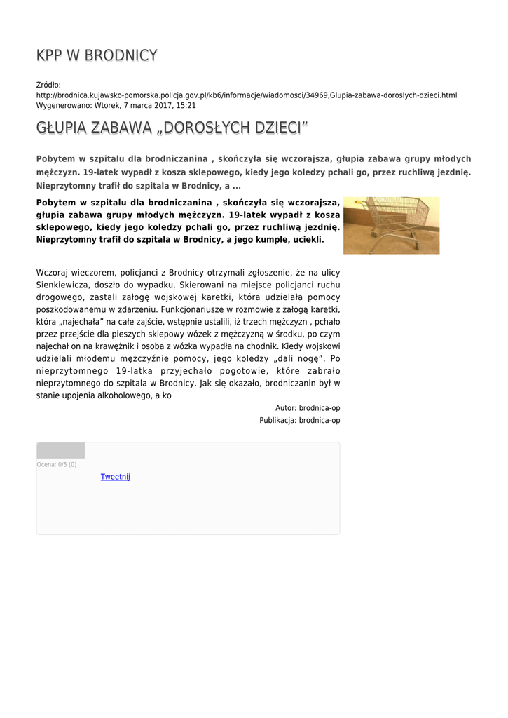 KPP W BRODNICY Źródło: http://brodnica.kujawsko-pomorska.policja.gov.pl/kb6/informacje/wiadomosci/34969,Glupia-zabawa-doroslych-dzieci.html Wygenerowano: Wtorek, 7 marca 2017, 15:21 GŁUPIA ZABAWA „DOROSŁYCH DZIECI” Pobytem w szpitalu dla brodniczanina , skończyła się wczorajsza, głupia zabawa grupy młodych mężczyzn. 19-latek wypadł z kosza sklepowego, kiedy jego koledzy pchali go, przez ruchliwą jezdnię. Nieprzytomny trafił do szpitala w Brodnicy, a ... Pobytem w szpitalu dla brodniczanina , skończyła się wczorajsza, głupia zabawa grupy młodych mężczyzn. 19-latek wypadł z kosza sklepowego, kiedy jego koledzy pchali go, przez ruchliwą jezdnię. Nieprzytomny trafił do szpitala w Brodnicy, a jego kumple, uciekli. Wczoraj wieczorem, policjanci z Brodnicy otrzymali zgłoszenie, że na ulicy Sienkiewicza, doszło do wypadku. Skierowani na miejsce policjanci ruchu drogowego, zastali załogę wojskowej karetki, która udzielała pomocy poszkodowanemu w zdarzeniu. Funkcjonariusze w rozmowie z załogą karetki, która „najechała” na całe zajście, wstępnie ustalili, iż trzech mężczyzn , pchało przez przejście dla pieszych sklepowy wózek z mężczyzną w środku, po czym najechał on na krawężnik i osoba z wózka wypadła na chodnik. Kiedy wojskowi udzielali młodemu mężczyźnie pomocy, jego koledzy „dali nogę”. Po nieprzytomnego 19-latka przyjechało pogotowie, które zabrało nieprzytomnego do szpitala w Brodnicy. Jak się okazało, brodniczanin był w stanie upojenia alkoholowego, a ko Autor: brodnica-op Publikacja: brodnica-op Ocena: 0/5 (0) Tweetnij