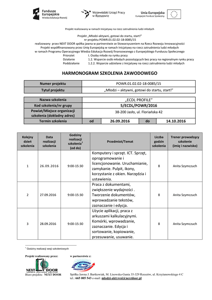 Projekt realizowany w ramach Inicjatywy na rzecz zatrudnienia ludzi młodych Projekt „Młodzi-aktywni, gotowi do startu, start!” nr projektu POWR.01.02.02-18-0085/15 realizowany przez NEXT DOOR spółka jawna w partnerstwie ze Stowarzyszeniem na Rzecz Rozwoju Innowacyjności Projekt współfinansowany przez Unię Europejską w ramach Inicjatywy na rzecz zatrudnienia ludzi młodych w ramach Programu Operacyjnego Wiedza Edukacja Rozwój finansowanego z Europejskiego Funduszu Społecznego Priorytet I. Osoby młode na rynku pracy Działanie 1.2. Wsparcie osób młodych pozostających bez pracy na regionalnym rynku pracy Poddziałanie 1.2.2. Wsparcie udzielane z Inicjatywy na rzecz zatrudnienia ludzi młodych HARMONOGRAM SZKOLENIA ZAWODOWEGO Numer projektu POWR.01.02.02-18-0085/15 Tytuł projektu „Młodzi – aktywni, gotowi do startu, start!” Nazwa szkolenia Kod szkolenia/nr grupy Powiat/Miejsce organizacji szkolenia (dokładny adres) Termin szkolenia „ECDL PROFILE” 5/ECDL/POWR/2016 Kolejny dzień szkolenia 1 Data realizacji szkolenia 38-200 Jasło, ul. Floriańska 42 od Godziny realizacji 1 szkolenia (od do) 1 26.09.2016 9:00-15:30 2 27.09.2016 9:00-15:30 3 28.09.2016 9:00-15:30 26.09.2016 14.10.2016 do Przedmiot/Temat Komputery i sprzęt. ICT. Sprzęt, oprogramowanie i licencjonowanie. Uruchamianie, zamykanie. Pulpit, ikony, korzystanie z okien. Narzędzia i ustawienia. Praca z dokumentami, zwiększenie wydajności . Tworzenie dokumentów, wprowadzanie tekstów, zaznaczanie i edycja. Użycie aplikacji, praca z arkuszami kalkulacyjnymi. Komórki, wprowadzanie, zaznaczanie. Edycja i sortowanie, kopiowanie, przesuwanie, usuwanie. Liczba godzin szkolenia Trener prowadzący szkolenie (imię i nazwisko) 8 Anita Szymczuch 8 Anita Szymczuch 8 Anita Szymczuch Godziny realizacji sesji szkoleniowych Projekt realizowany przez: w partnerstwie z: Biuro projektu: NEXT DOOR Spółka Jawna J. Bartkowiak, M. Lisowska-Gunia 35-329 Rzeszów, ul. Krzyżanowskiego 4 C tel.: 665 005 543 e-mail: [email protected] Projekt realizowany w ramach Inicjatywy na rzecz zatrudnienia ludzi młodych 4 29.09.2016 9:00-15:30 5 30.06.2016 9:00-15:30 6. 03.10.2016 9:00-15:30 7. 04.10.2016 9:00-15:30 8. 05.10.2016 9:00-15:30 9. 06.10.2016 9:00-15:30 10. 07.10.2016 9:00-15:30 11. 10.10.2016 9:00-15:30 12. 11.10.2016 9:00-15:30 Praca z prezentacjami, zwiększenie wydajności. Tworzenie prezentacji. Widoki prezentacji, slajdy, wzorzec slajdu. Zarządzanie arkuszami, wiersze i kolumny. Arkusze. Reguły arytmetyczne. Funkcje. Efekty pracy. Drukowanie. Praca z tekstem. Zarządzanie plikami. Pliki i foldery. Organizacja plików i folderów. Przechowywanie i kompresja. Formatowanie, tekst, akapity, style. Obiekty. Tworzenie tabel, formatowanie tabel, obiekty graficzne. Zarządzanie arkuszami, wiersze i kolumny, arkusze. Reguły i funkcje, Formatowanie, daty i liczby. Zawartość komórek. Wyrównanie i obramowanie komórek. Posługiwanie się tekstem. Formatowanie, listy, tabele. Wykresy. Praca z wykresami, schemat organizacyjny. Sieci. Pojęcia związane z siecią, dostęp do sieci. Bezpieczeństwo i higiena pracy. Ochrona danych i urządzeń. Złośliwe oprogramowanie. Zdrowie i ochrona środowiska. Korespondencja seryjna, przygotowanie i wydruki. Przygotowanie wydruków, ustawienia. Sprawdzanie dokumentu i drukowanie. Wykresy, tworzenie i edycja. Formatowanie arkusza, ustawienia. Przygotowanie 8 Anita Szymczuch 8 Anita Szymczuch 8 Anita Szymczuch 8 Anita Szymczuch 8 Anita Szymczuch 8 Anita Szymczuch 8 Anita Szymczuch 8 Anita Szymczuch 8 Anita Szymczuch Projekt realizowany przez: w partnerstwie z: Biuro projektu: NEXT DOOR Spółka Jawna J. Bartkowiak, M. Lisowska-Gunia 35-329 Rzeszów, ul. Krzyżanowskiego 4 C tel.: 665 005 543 e-mail: [email protected] Projekt realizowany w ramach Inicjatywy na rzecz zatrudnienia ludzi młodych 13. 12.10.2016 9:00-15:30 14. 13.10.2016 9:00-15:30 15. 14.10.2016 9:00-15:30 prezentacji. Sprawdzanie i drukowanie. Obiekty graficzne, wprowadzanie , manipulacja i rysowanie. Przygotowanie prezentacji. Sprawdzanie i uruchamianie prezentacji. Egzamin Egzamin 8 Anita Szymczuch 8 Tomasz Słodziński 8 Tomasz Słodziński …………………………………………………… podpis Beneficjenta Projekt realizowany przez: w partnerstwie z: Biuro projektu: NEXT DOOR Spółka Jawna J. Bartkowiak, M. Lisowska-Gunia 35-329 Rzeszów, ul. Krzyżanowskiego 4 C tel.: 665 005 543 e-mail: [email protected]